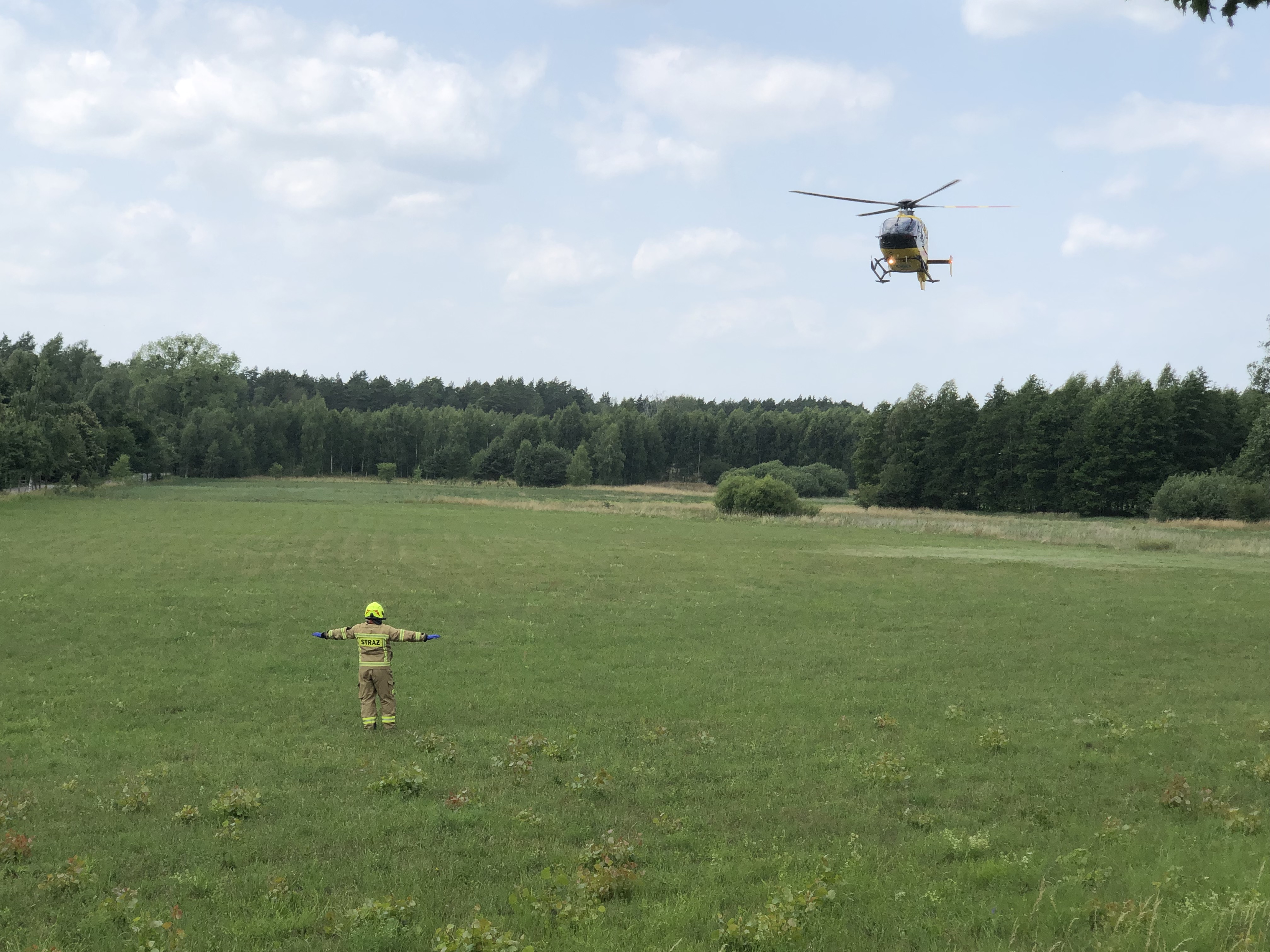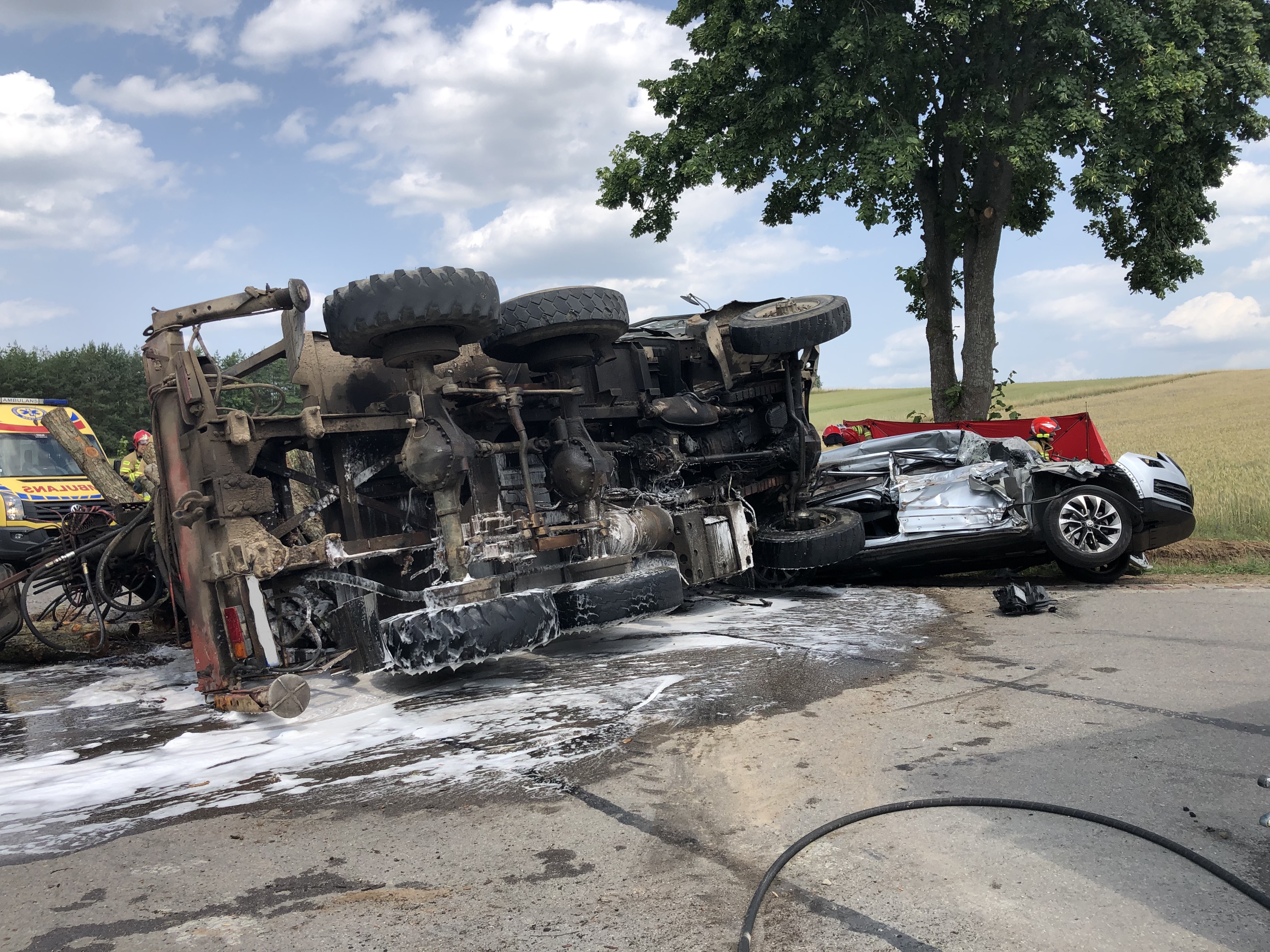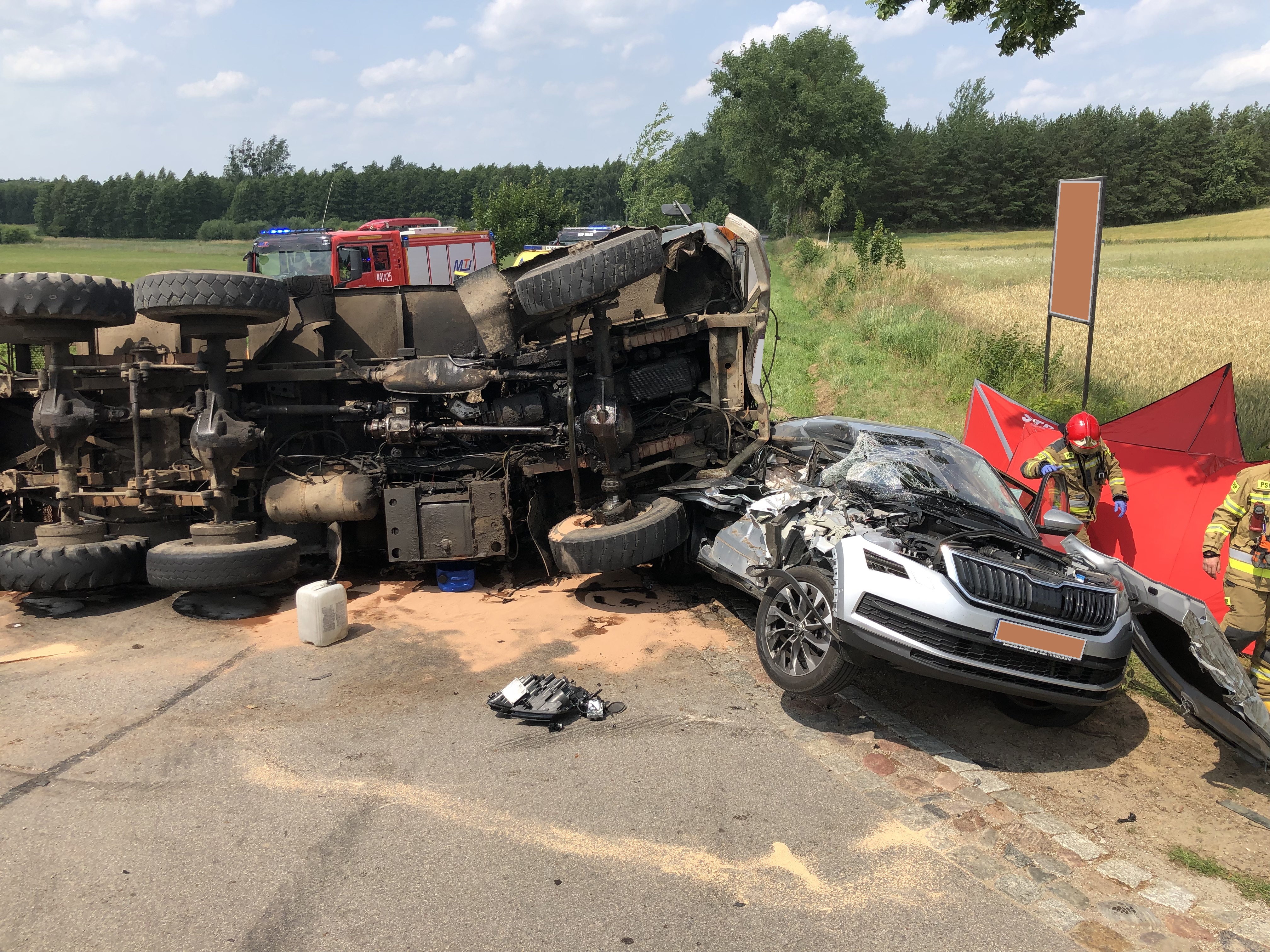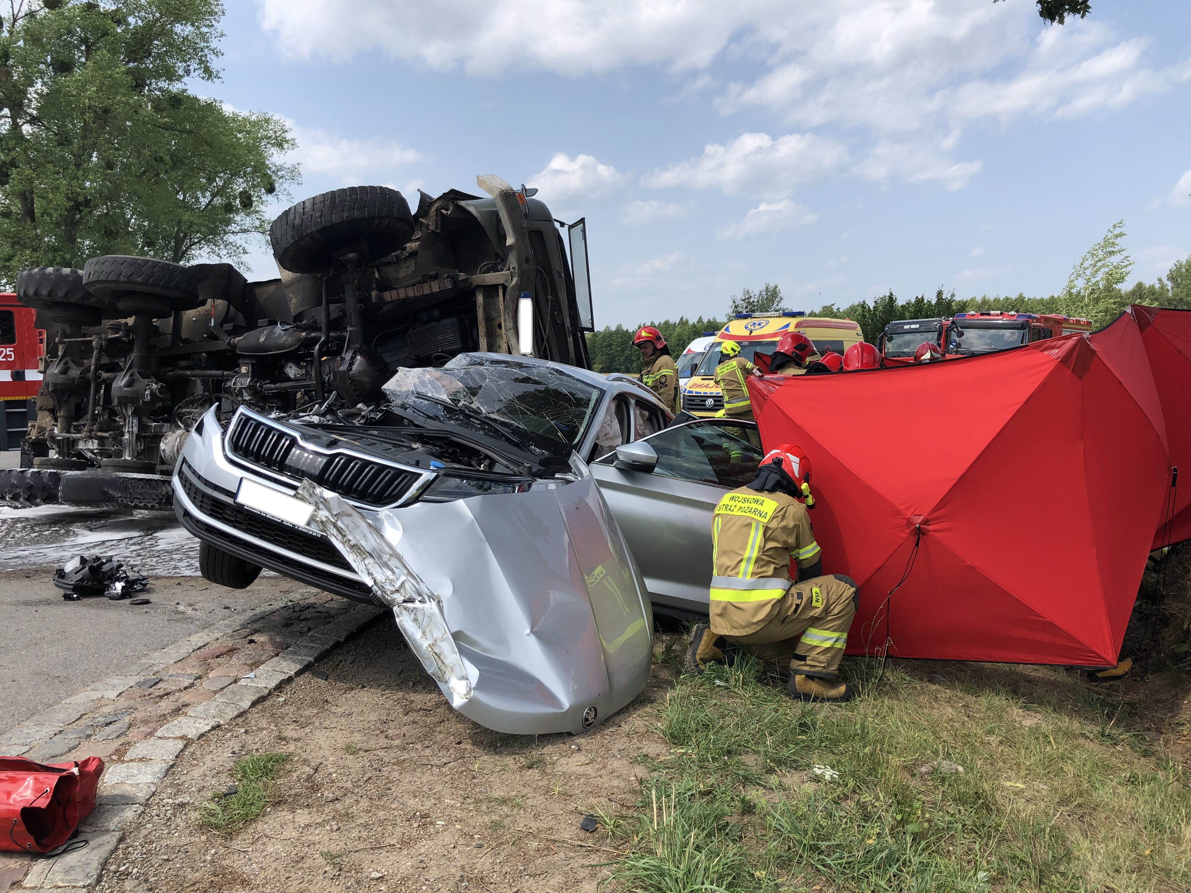 Po dotarciu na miejsce zdarzenia okazało się że doszło do zderzenia samochodu osobowego i ciężarowego który w wyniku zderzenia wywrócił się. Podróżni opuścili pojazdy przy pomocy świadków zdarzenia, którzy jako pierwsi przystąpili również do udzielania pierwszej pomocy. Działania strażaków polegały na zabezpieczeniu miejsca zdarzenia, wsparciu czynności realizowanych przez Zespół Ratownictwa Medycznego, przygotowaniu lądowiska oraz przyjęciu helikoptera Lotniczego Pogotowia Ratunkowego i zabezpieczeniu powstałych w wyniku zdarzenia wycieków płynów eksploatacyjnych. Pomimo podjętych czynności kierownik ZRM stwierdził zgon pasażerki samochodu osobowego oraz zadecydował o potrzebie hospitalizacji kierowców pojazdów. Okoliczności zdarzenia wyjaśniają funkcjonariusze Policji.