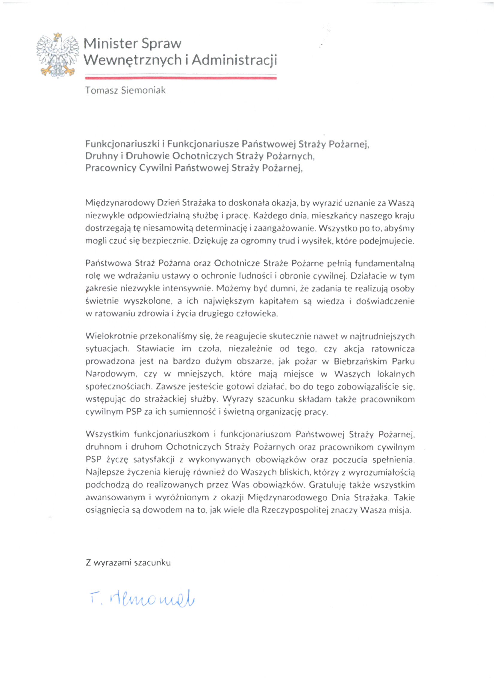 Wszystkim funkcjonariuszkom i funkcjonariuszom Państwowej Straży Pożarnej, druhnom i druhom Ochotniczych Straży Pożarnych oraz pracownikom cywilnym PSP życzę satysfakcji z wykonywanych obowiązków oraz poczucia spełnienia. Najlepsze życzenia kieruję również do Waszych bliskich, którzy z wyrozumiałością podchodzą do realizowanych przez Was obowiązków. Gratuluję także wszystkim awansowanym i wyróżnionym z okazji Międzynarodowego Dnia Strażaka. Takie osiągnięcia są dowodem na to, jak wiele dla Rzeczypospolitej znaczy Wasza misja.