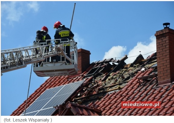 Na miejsce zostały zadysponowane 4 zastępy JRG Głogów, dwa OSP Jaczów oraz jeden OSP Jerzmanowa. Po dojeździe na miejsce zdarzenia i wykonaniu rozpoznania, potwierdzono informacje ze zgłoszenia. Pali się dach wraz z poddaszem. W pierwszej fazie działań podano dwa prądy gaśnicze wody na palący się dach w tym z autodrabiny. Następnie rota zabezpieczona w sprzęt ochrony układu oddechowego podała prąd wody od wewnątrz domu na poziom poddasza budynku. Jednocześnie wyłączono główny wyłącznik prądu w budynku. Działania utrudniały zainstalowane na dachu panele fotowoltaiczne. Po ugaszeniu pożaru, zabezpieczono dach plandeką, którą dostarczył sołtys miejscowości. Działania zostały zakończone, miejsce zdarzenia zostało przekazane właścicielowi obiektu.