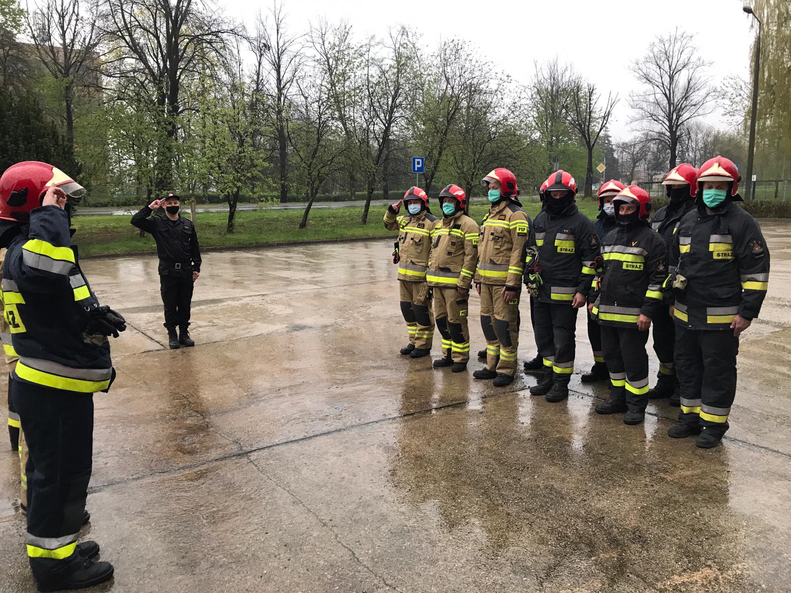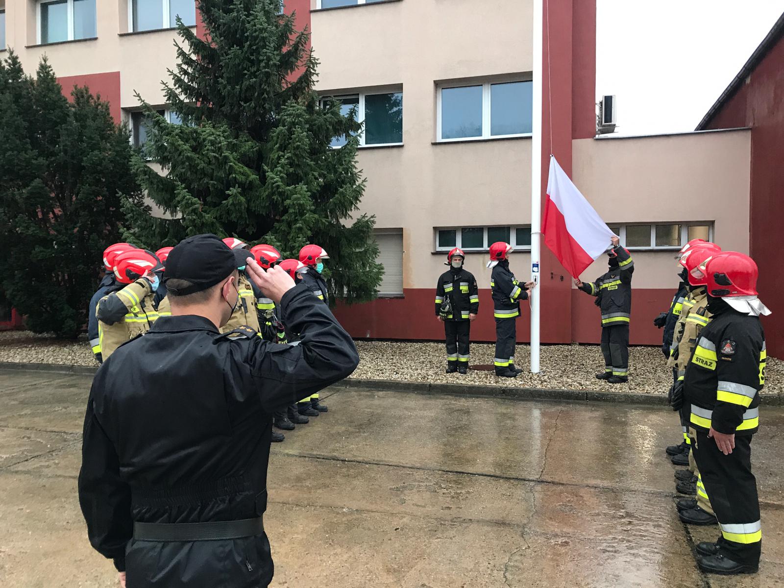 Uroczyste wciągnięcie flagi na maszt KP PSP w Głogowie z okazji Dnia Flagi Rzeczypospolitej Polskiej.