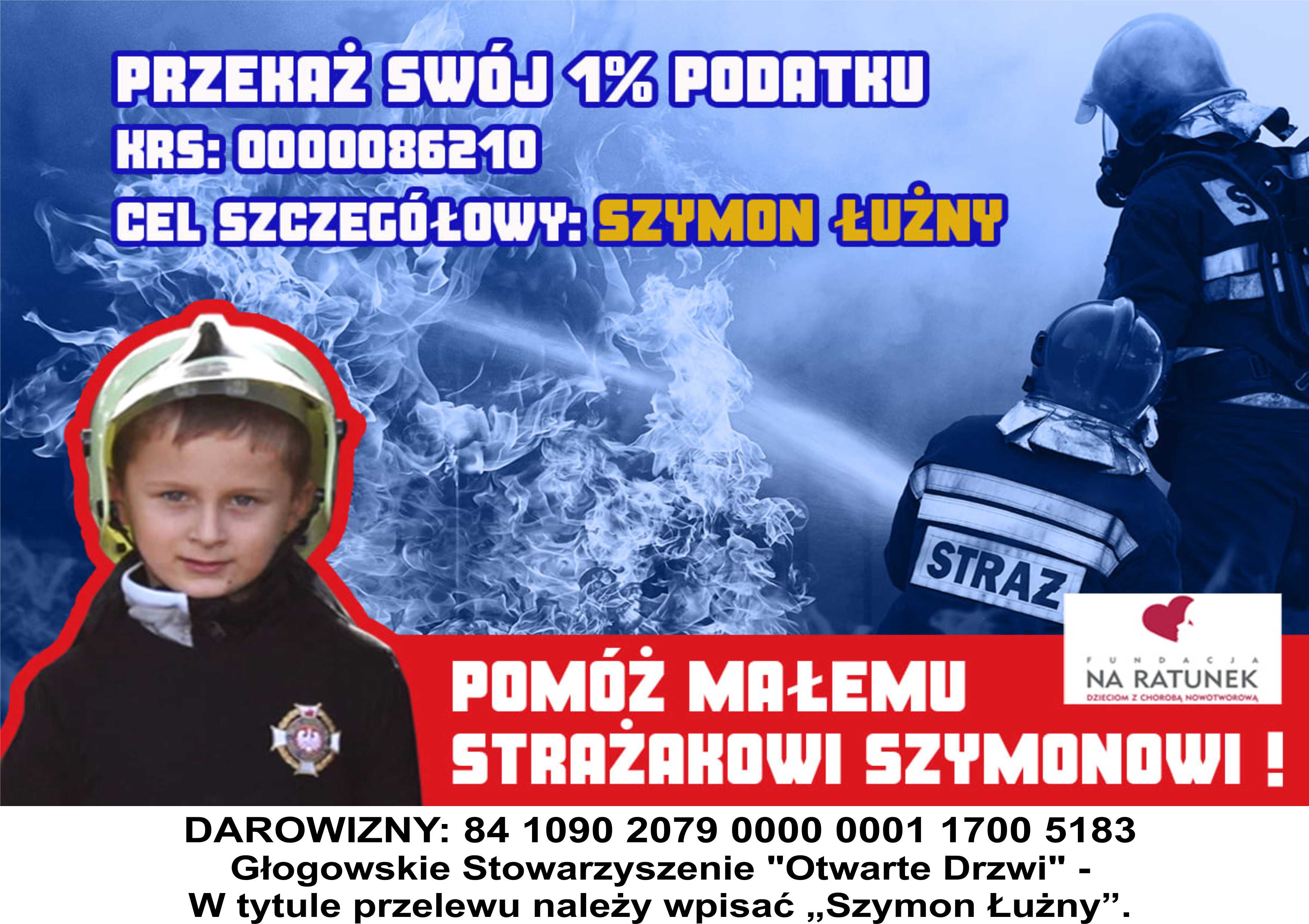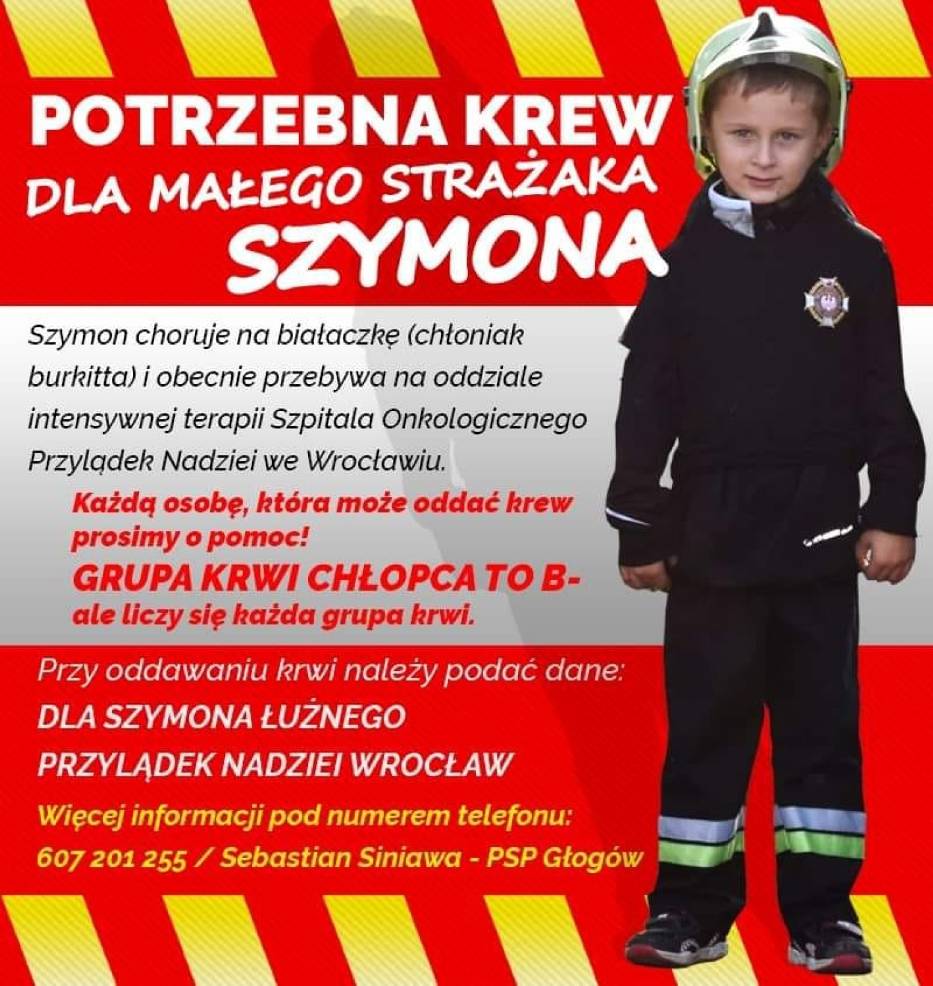 Pod koniec roku dowiedzieliśmy się o ciężkiej chorobie chłopca, Szymona Łużnego - młodzieżowego strażaka OSP Szczyglice. Chłopiec wymaga intensywnego i długotrwałego leczenia. Zdiagnozowano u niego białaczkę, chłoniak Burkitta. Trafił na oddział intensywnej terapii Szpitala Onkologicznego Przylądek Nadziei we Wrocławiu. Strażacy przypominają, że cała rodzina chłopca ma tradycje pożarnicze, dlatego w pomoc włączają się już przyjaciele, a także Komenda Powiatowa PSP w Głogowie. W razie pytań można dzwonić do Sebastiana Siniawy z Jednostki Ratowniczo Gaśniczej Państwowej Straży Pożarnej w Głogowie na nr tel. 607201255.