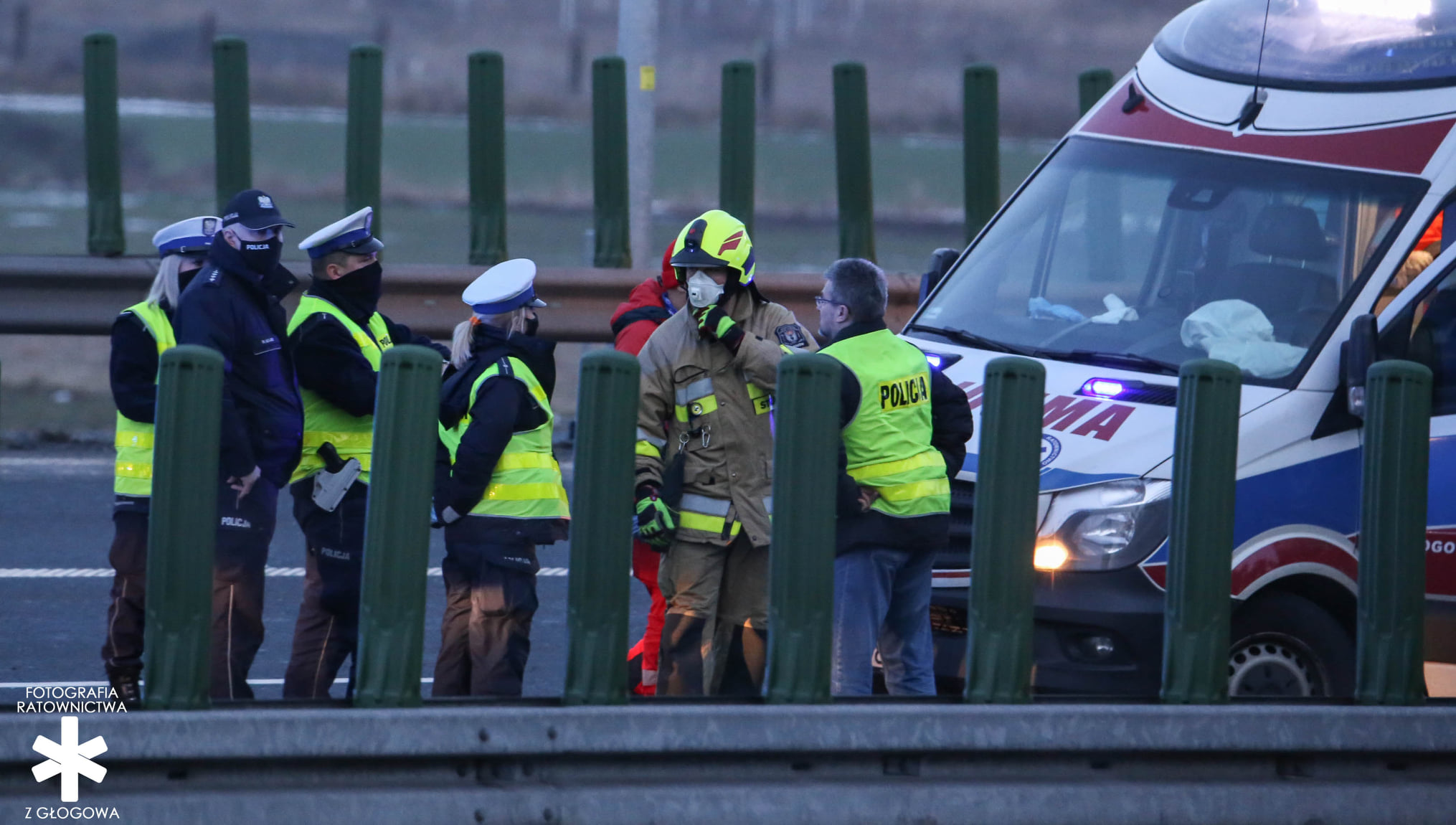 Z informacji wynikało, ze w zdarzeniu udział brały dwa samochody osobowe oraz zostały poszkodowane 3 osoby. Do działań zadysponowane zostały zastępy z PSP Polkowice, PSP Głogów oraz zastępy powiatu głogowskiego- OSP Smardzów i OSP Jerzmanowa. Ruch w kierunku Zielonej Góry został całkowicie zablokowany. Teren akcji został oświetlony, na miejsce przybył śmigłowiec Lotniczego Pogotowia Ratunkowego. Przybyły na miejsce zdarzenia lekarz Pogotowia Ratunkowego stwierdził zgon kierowcy jednego z aut. Przy pomocy sprzętu hydraulicznego strażacy przystąpili do wykonania dostępu do osób poszkodowanych znajdujących się w drugim pojeździe. Niestety w trakcie działań lekarz stwierdził zgon kolejnej osoby, która była pasażerem auta. Kierowca drugiego pojazdu został ewakuowany poza strefę działań, następnie został zabrany śmigłowcem LPR do szpitala.