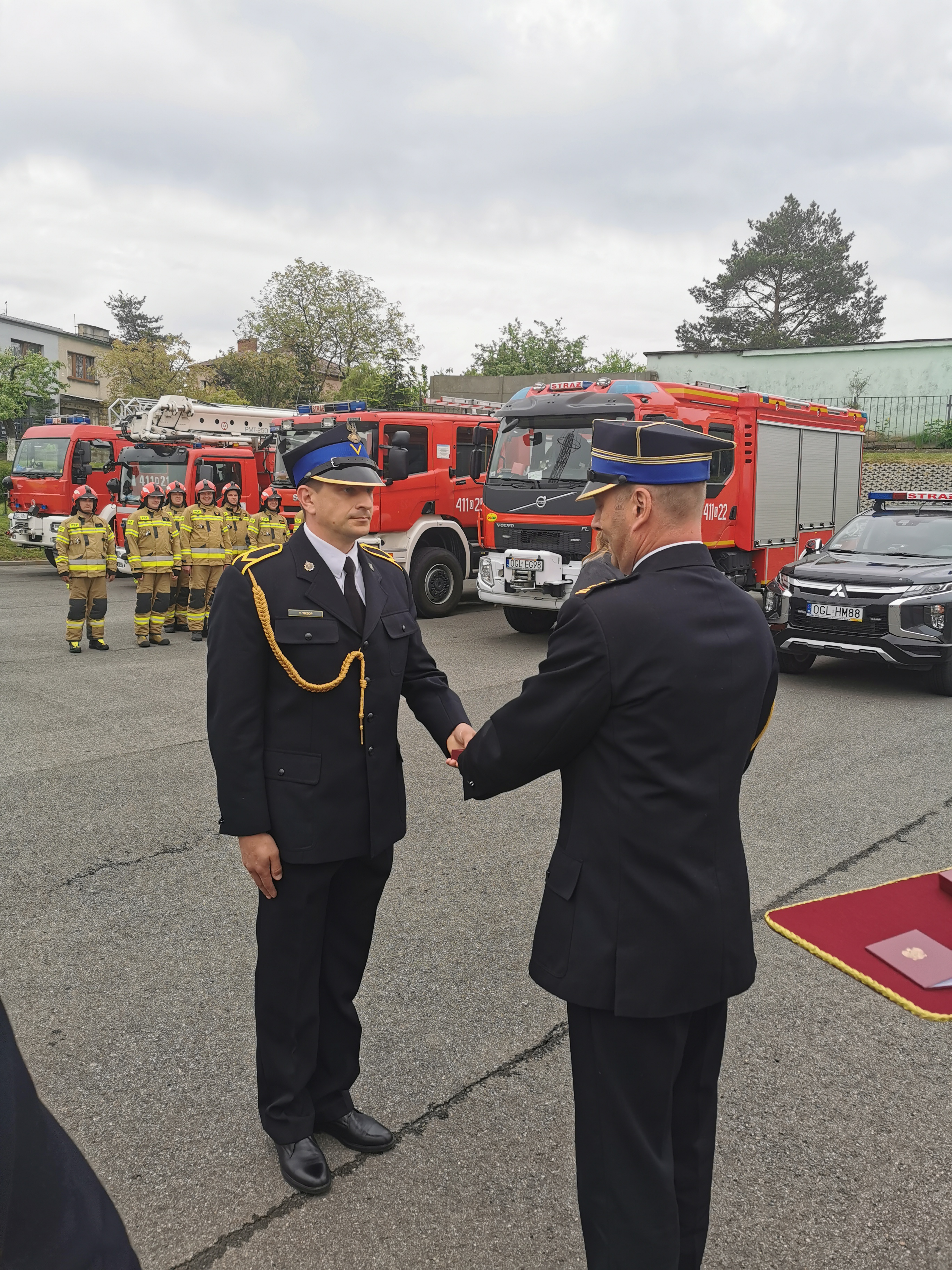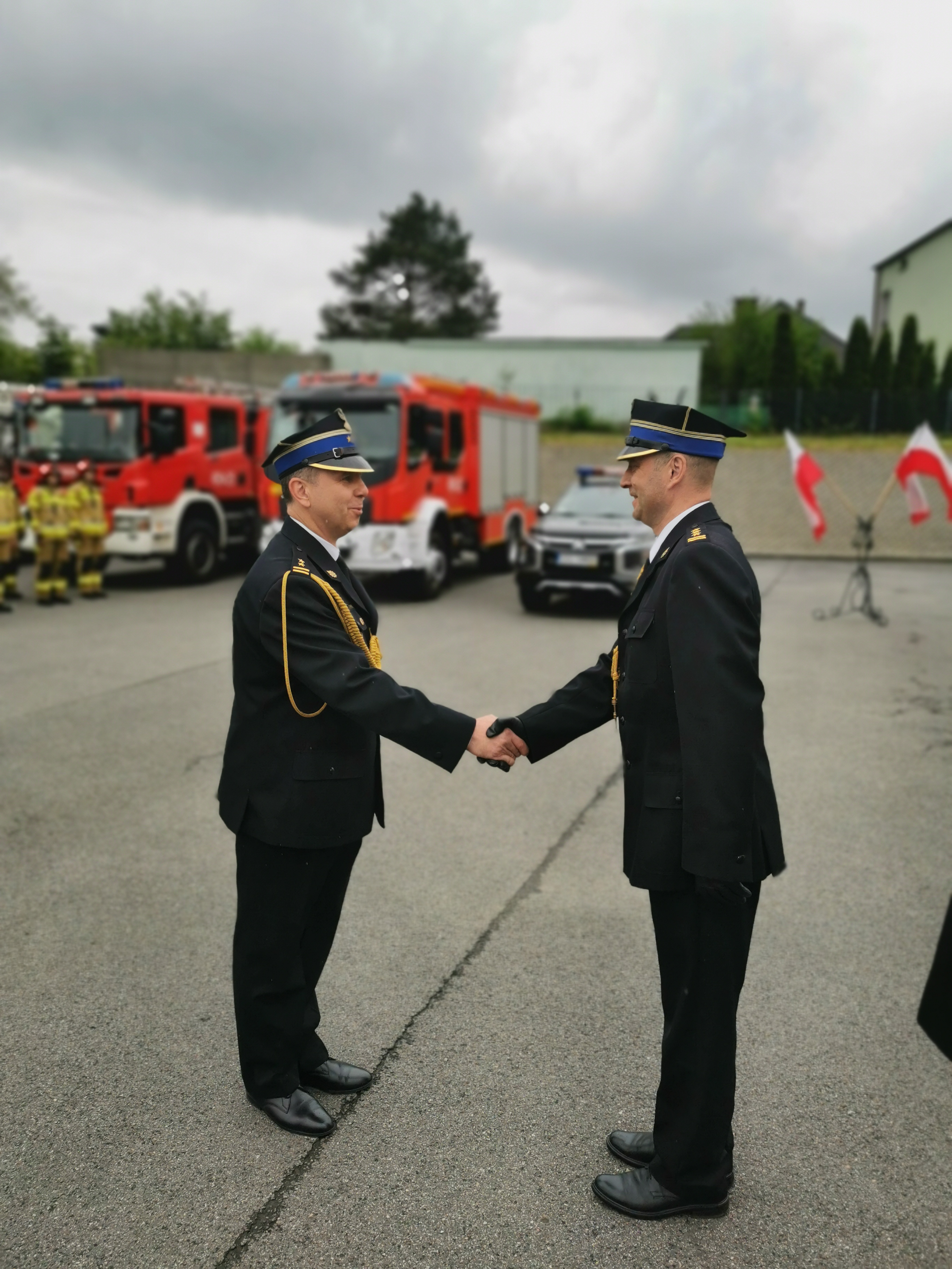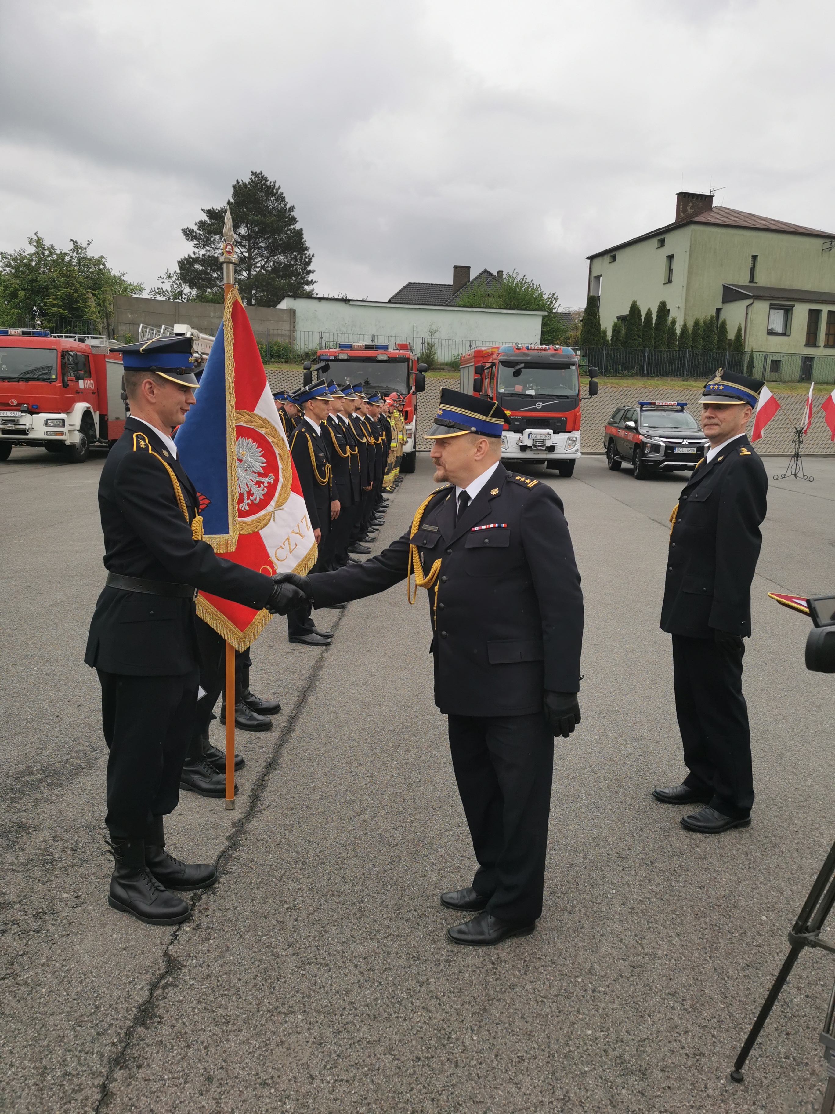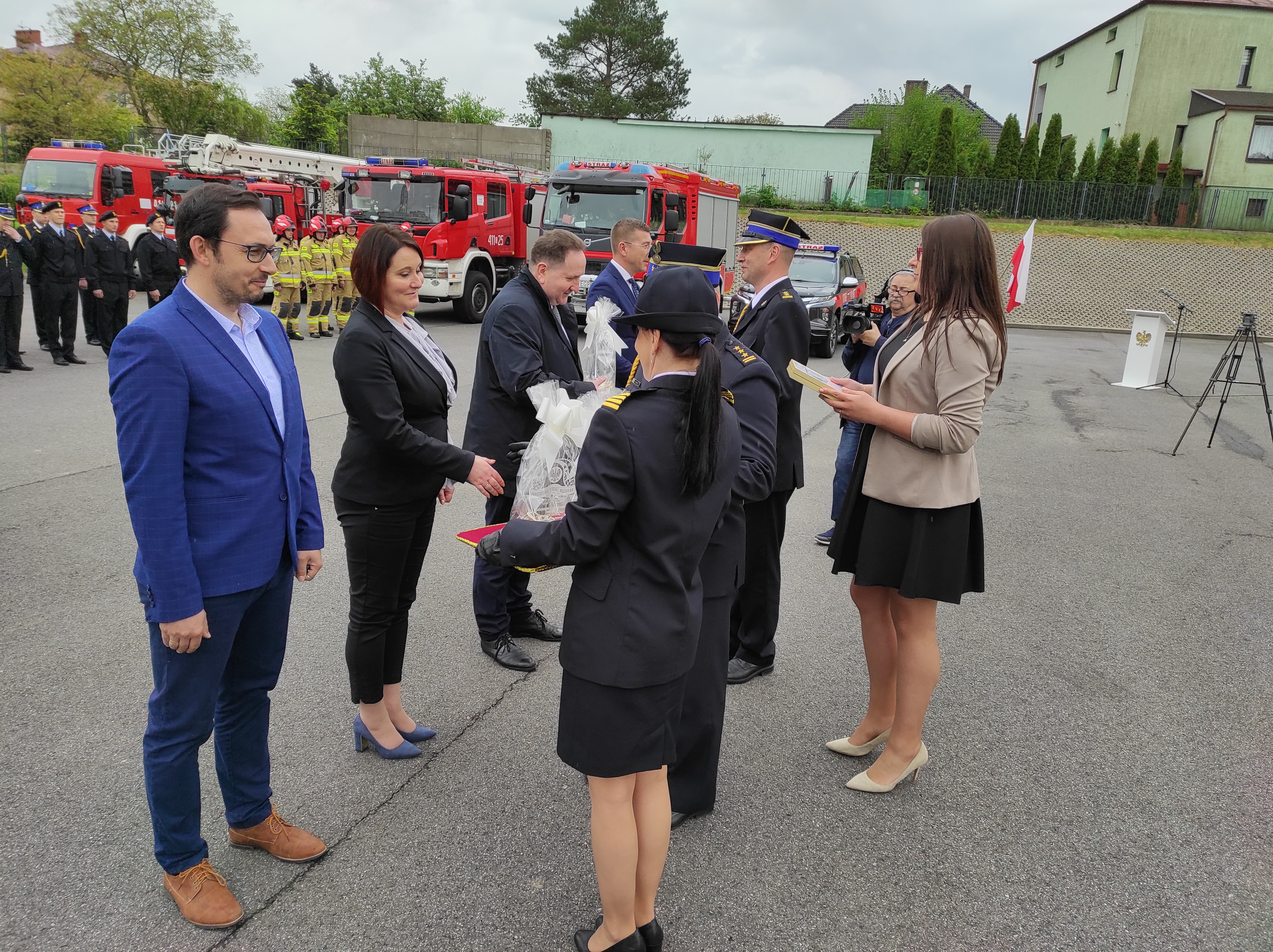 Uroczystość rozpoczęła się od złożenia meldunku Zastępcy Opolskiego Komendanta Wojewódzkiego PSP st. bryg. Arkadiuszowi Kuśmierskiemu przez dowódcę uroczystości st. kpt. Mateusza Szymusia.