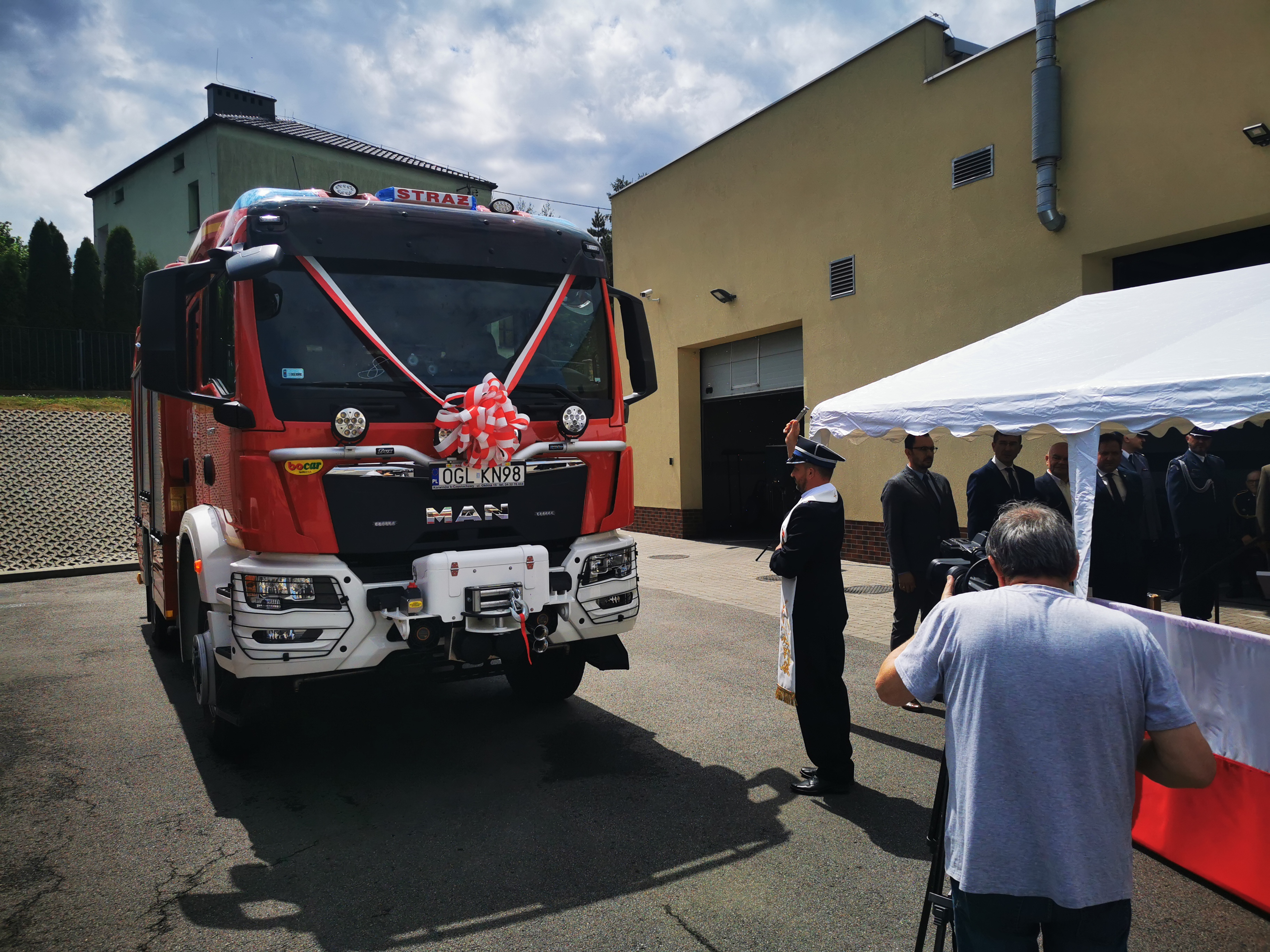 Podczas uroczystego apelu ks. Szymon Suda - Kapelan Powiatowy Strażaków poświęcił nowy ciężki samochód ratowniczo-gaśniczy, którego oficjalne przekazanie dla głubczyckiej Jednostki Ratowniczo-Gaśniczej miało miejsce 13 maja br. w Opolu w trakcie Wojewódzkich obchodów Dnia Strażaka.