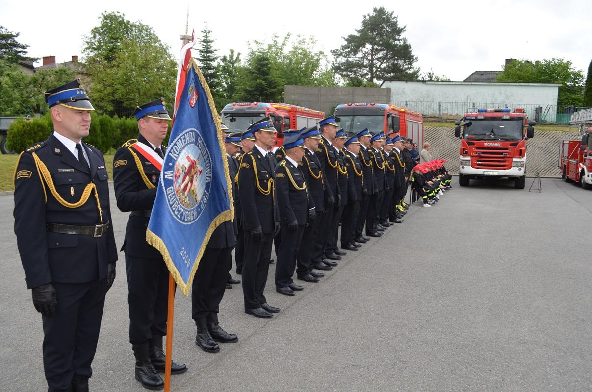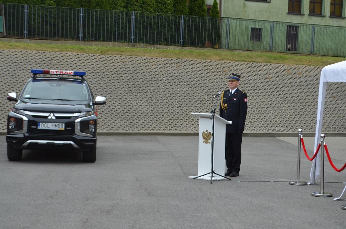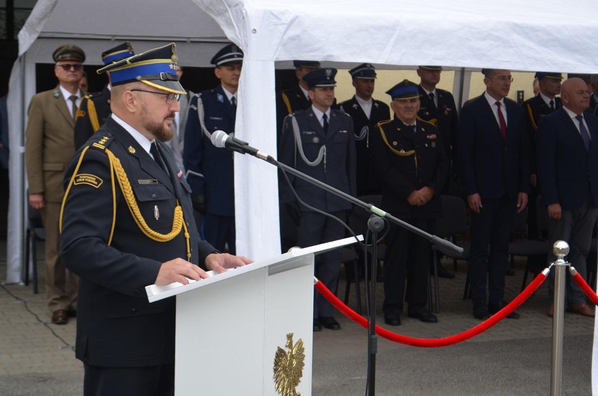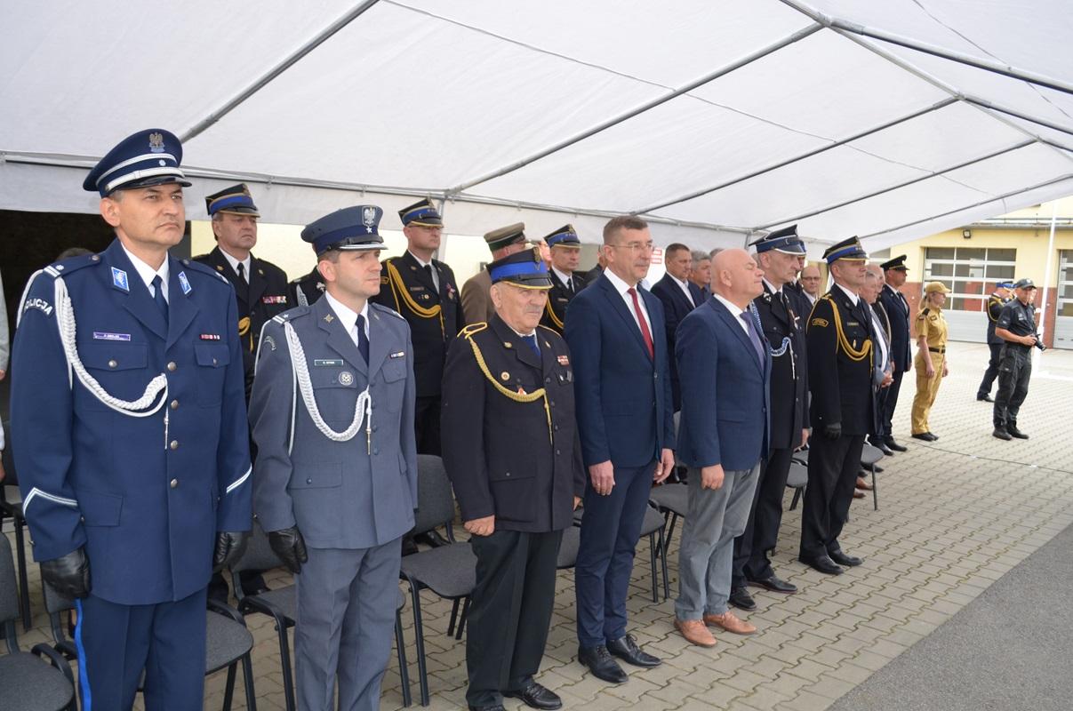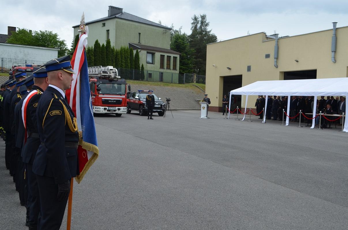 Po złożeniu meldunku przełożonemu przez st. kpt. Kacpra Węgrzyna - dowódcę uroczystości, nastąpiło podniesieniu flagi narodowej i odśpiewaniu hymnu państwowego. Następnie zgromadzonych gości oraz funkcjonariuszy i pracowników przywitał st. bryg. Wojciech Semeniuk - Komendant Powiatowy PSP w Głubczycach.