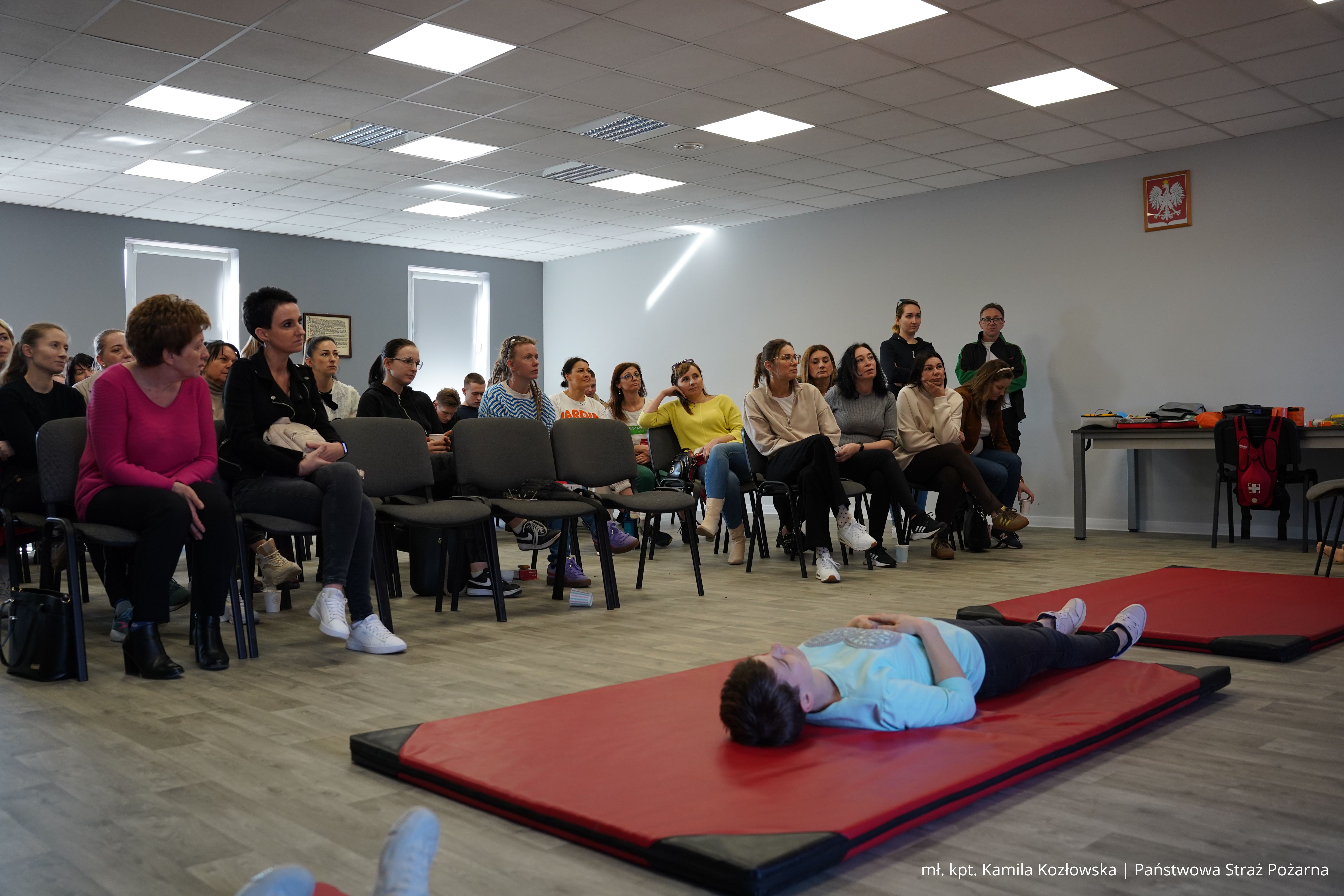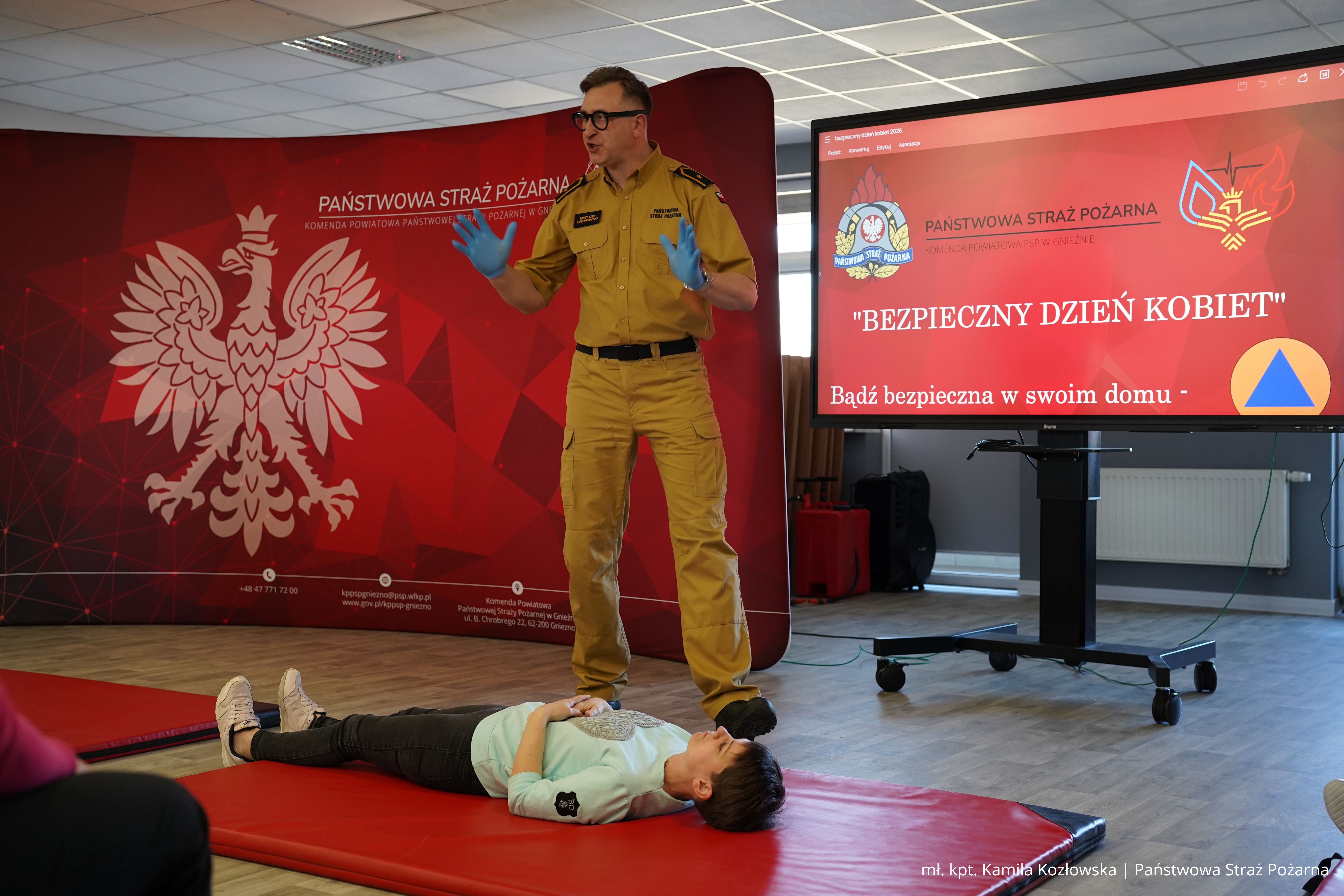 Po części teoretycznej przyszła część praktyczna. W drugim bloku pt. „Bądź pewna czyli jak udzielić pierwszej pomocy” koordynator powiatowy ratownictwa medycznego w KP PSP w Gnieźnie mł. asp. Mateusz Gronowski, dyplomowany ratownik medyczny przedstawił zasady udzielania pierwszej pomocy w różnych stopniach zagrożenia zdrowia i życia. Szczególną uwagę poświęcono udzielaniu pomocy w przypadkach nagłego zatrzymania krążenia u dzieci i niemowląt oraz wykorzystaniu w takich przypadkach defibrylatora AED. Ponadto omówiono zasady postępowania w przypadku zadławienia czy zachłyśnięcia oraz opatrywania różnego rodzaju ran. Po części wprowadzającej każda z pań miała możliwość przećwiczyć wszystkie zagadnienia na udostępnionym przez tutejszą komendę sprzęcie do ćwiczeń. Każda z pań otrzymała na zakończenie kursu dyplom potwierdzający uzyskanie nowych umiejętności.