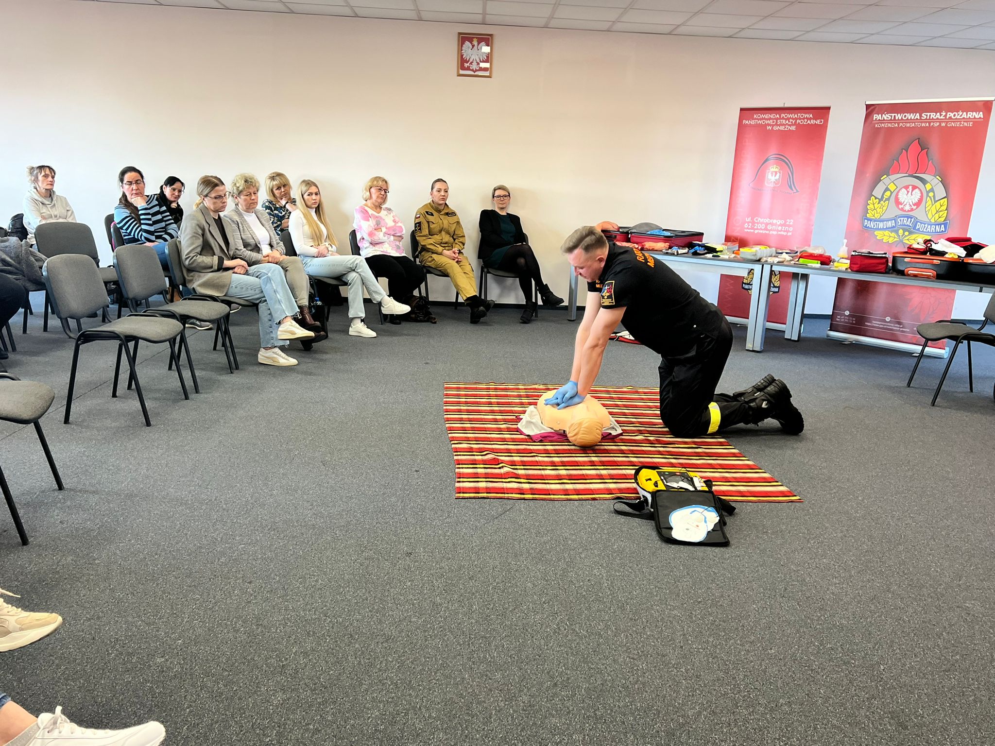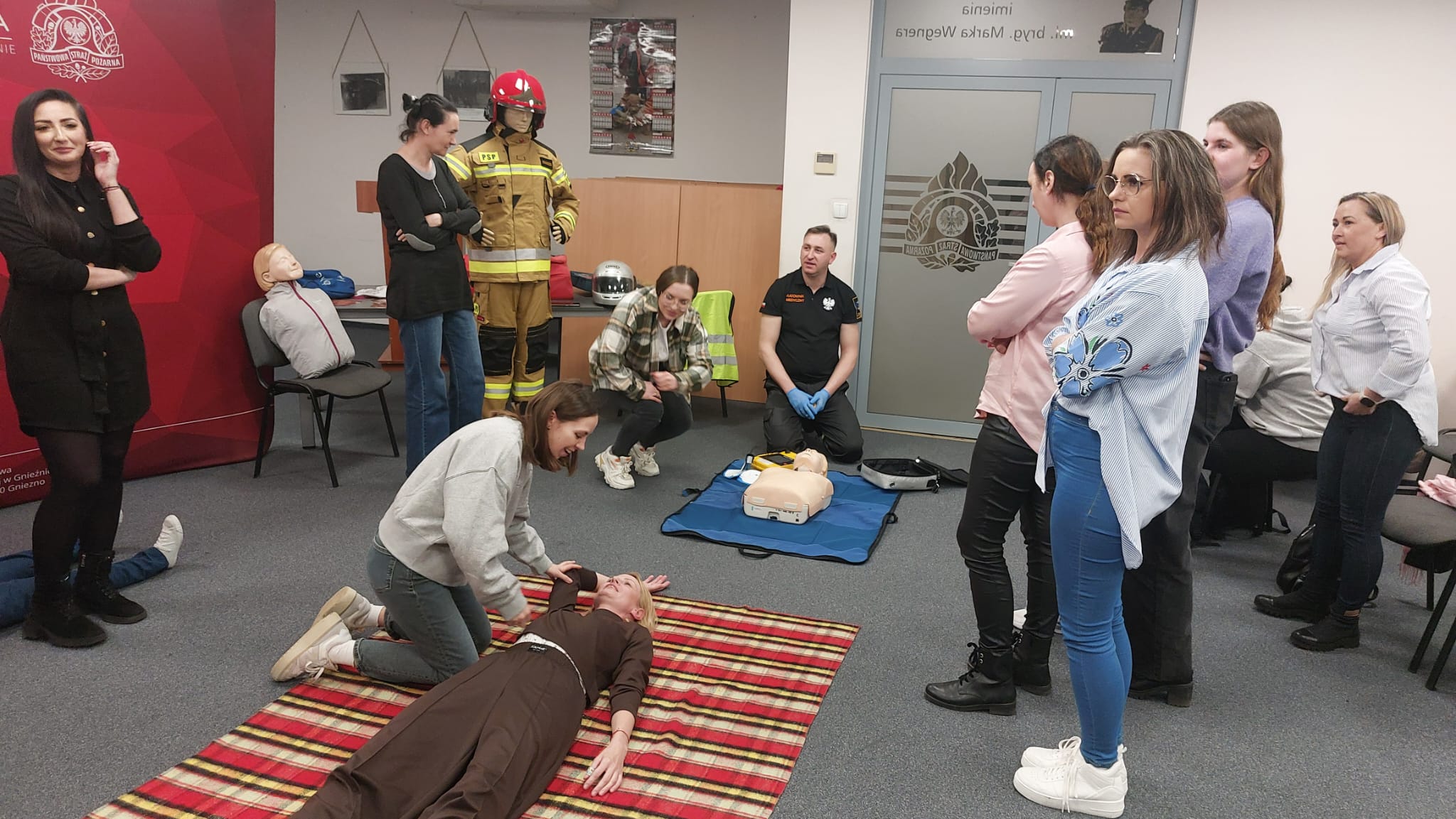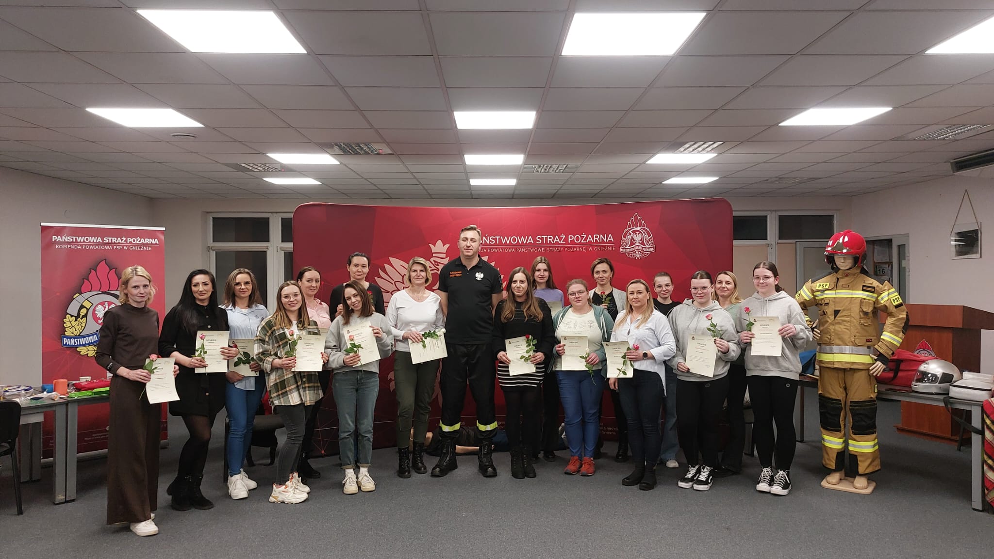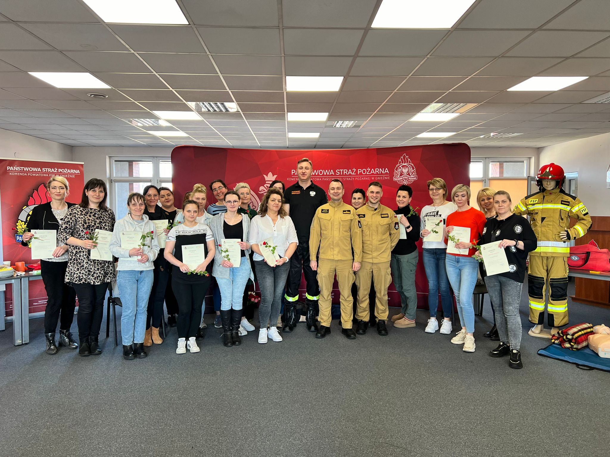 Na początku lutego br. na naszej stronie internetowej zapraszaliśmy mieszkanki powiatu gnieźnieńskiego do udziału w przedsięwzięciu pn. Bezpieczny Dzień Kobiet, który miał przybliżyć wiedzę z zakresu udzielania pomocy przedmedycznej. Zainteresowanie kursem było tak duże, że postanowiliśmy zorganizować go w dwóch sesjach przedpołudniowej i popołudniowej. W dniu 8 marca 2024 r. w Komendzie Powiatowej Państwowej Straży Pożarnej (PSP) w Gnieźnie o godzinie 10:00 komendant powiatowy PSP w Gnieźnie bryg. Marta Kacprzycka powitała licznie przybyłe panie i rozpoczęto zajęcia. Celem kursu było przyswojenie wiedzy z zakresu udzielania pierwszej pomocy przedlekarskiej. Uczestniczki zdobyły wiedzę m.in. jak zachować się w przypadku zagrożenia, w jaki sposób wezwać służby ratunkowe i przede wszystkim jak udzielić pomocy przedmedycznej osobie znajdującej się w zagrożeniu zdrowia i życia. Zajęcia dla pań przeprowadził mł. asp. Mateusz Gronowski, koordynator powiatowy w zakresie ratownictwa medycznego w gnieźnieńskiej komendzie, który posiada również wykształcenie ratownika medycznego. W zajęciach uczestniczyły również funkcjonariuszki tutejszej komendy z panią komendant na czele oraz członkinie korpusu Służby Cywilnej. Przy organizacji kursu oraz w trakcie prowadzenia zajęć koordynatora medycznego wspomagali również funkcjonariusze Wydziału Operacyjno-Szkoleniowego KP PSP Gniezno (st. sekc. Dawid Adamczyk i ogn. Michał Szarzyński) oraz Jednostki Ratowniczo-Gaśniczej (st. str. Maciej Kołodziejczak i st. str. Norbert Mazur). Na koniec każdej sesji oprócz uzyskanego dyplomu każda z pań otrzymała z rąk strażaków symboliczny kwiatek.