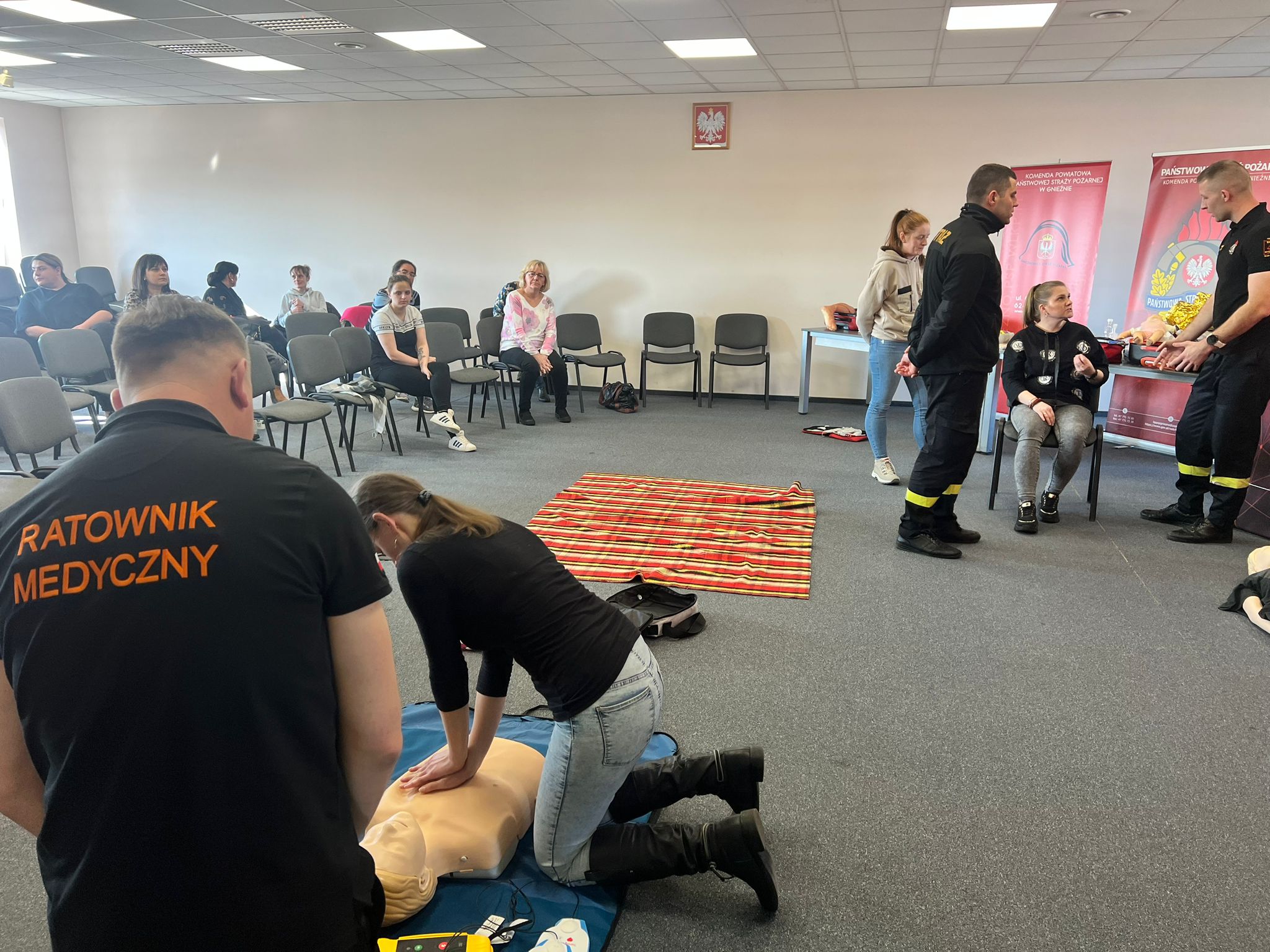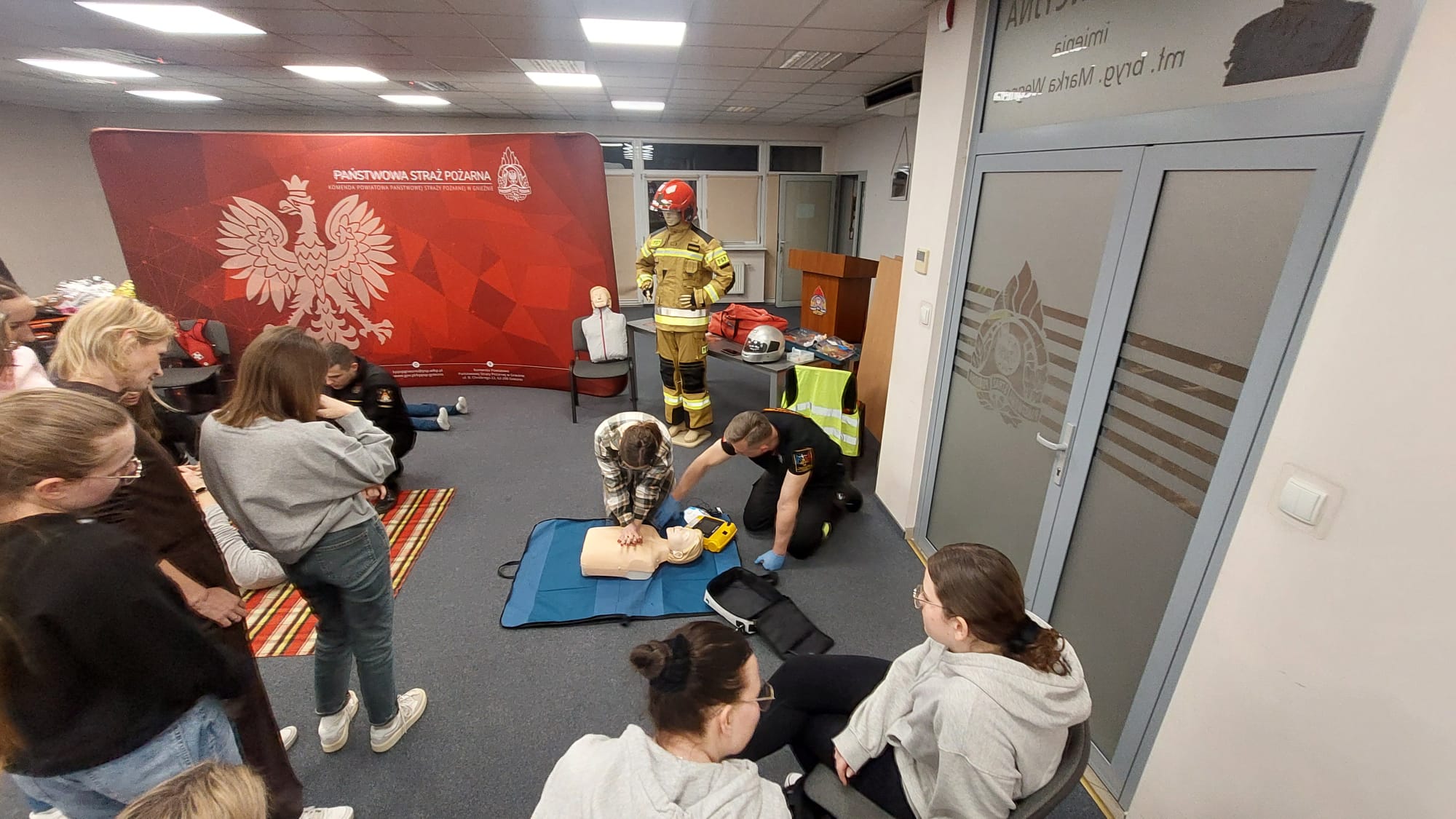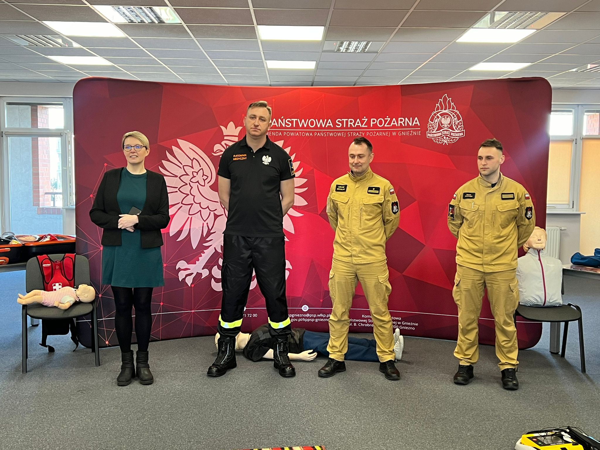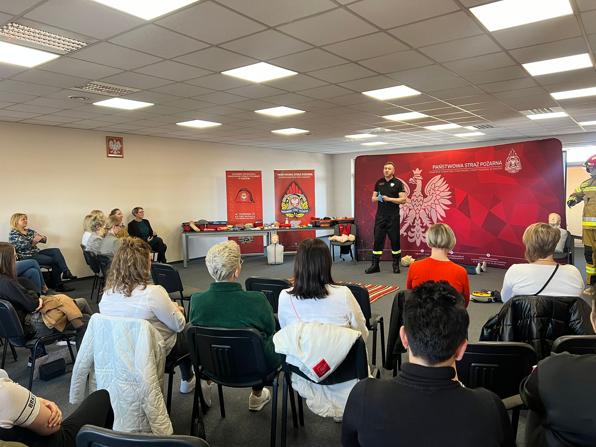 Na początku lutego br. na naszej stronie internetowej zapraszaliśmy mieszkanki powiatu gnieźnieńskiego do udziału w przedsięwzięciu pn. Bezpieczny Dzień Kobiet, który miał przybliżyć wiedzę z zakresu udzielania pomocy przedmedycznej. Zainteresowanie kursem było tak duże, że postanowiliśmy zorganizować go w dwóch sesjach przedpołudniowej i popołudniowej. W dniu 8 marca 2024 r. w Komendzie Powiatowej Państwowej Straży Pożarnej (PSP) w Gnieźnie o godzinie 10:00 komendant powiatowy PSP w Gnieźnie bryg. Marta Kacprzycka powitała licznie przybyłe panie i rozpoczęto zajęcia. Celem kursu było przyswojenie wiedzy z zakresu udzielania pierwszej pomocy przedlekarskiej. Uczestniczki zdobyły wiedzę m.in. jak zachować się w przypadku zagrożenia, w jaki sposób wezwać służby ratunkowe i przede wszystkim jak udzielić pomocy przedmedycznej osobie znajdującej się w zagrożeniu zdrowia i życia. Zajęcia dla pań przeprowadził mł. asp. Mateusz Gronowski, koordynator powiatowy w zakresie ratownictwa medycznego w gnieźnieńskiej komendzie, który posiada również wykształcenie ratownika medycznego. W zajęciach uczestniczyły również funkcjonariuszki tutejszej komendy z panią komendant na czele oraz członkinie korpusu Służby Cywilnej. Przy organizacji kursu oraz w trakcie prowadzenia zajęć koordynatora medycznego wspomagali również funkcjonariusze Wydziału Operacyjno-Szkoleniowego KP PSP Gniezno (st. sekc. Dawid Adamczyk i ogn. Michał Szarzyński) oraz Jednostki Ratowniczo-Gaśniczej (st. str. Maciej Kołodziejczak i st. str. Norbert Mazur). Na koniec każdej sesji oprócz uzyskanego dyplomu każda z pań otrzymała z rąk strażaków symboliczny kwiatek.