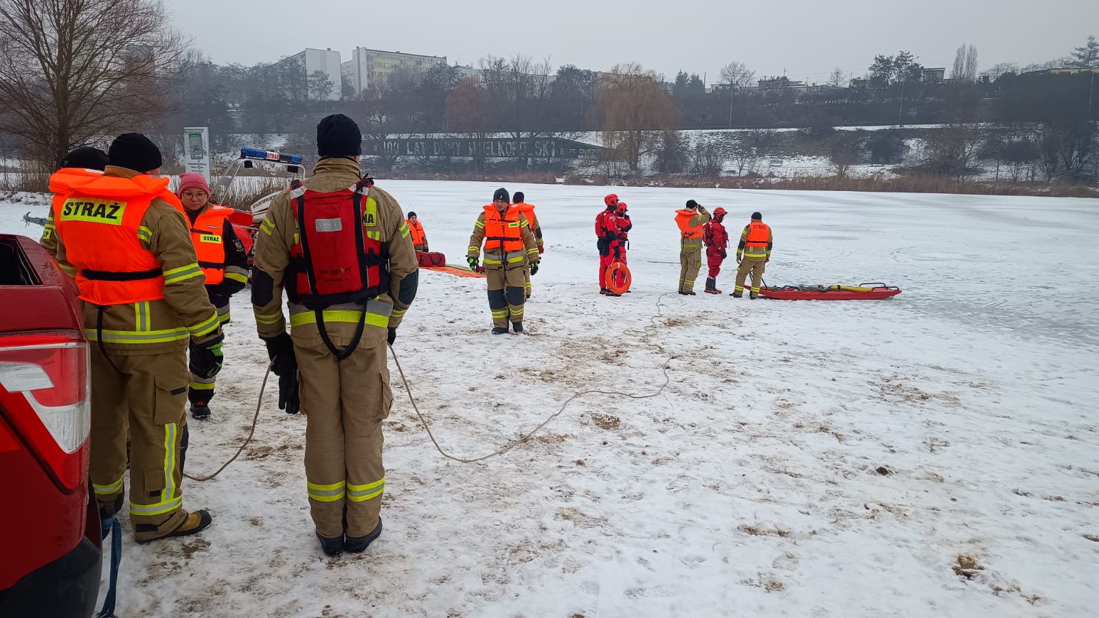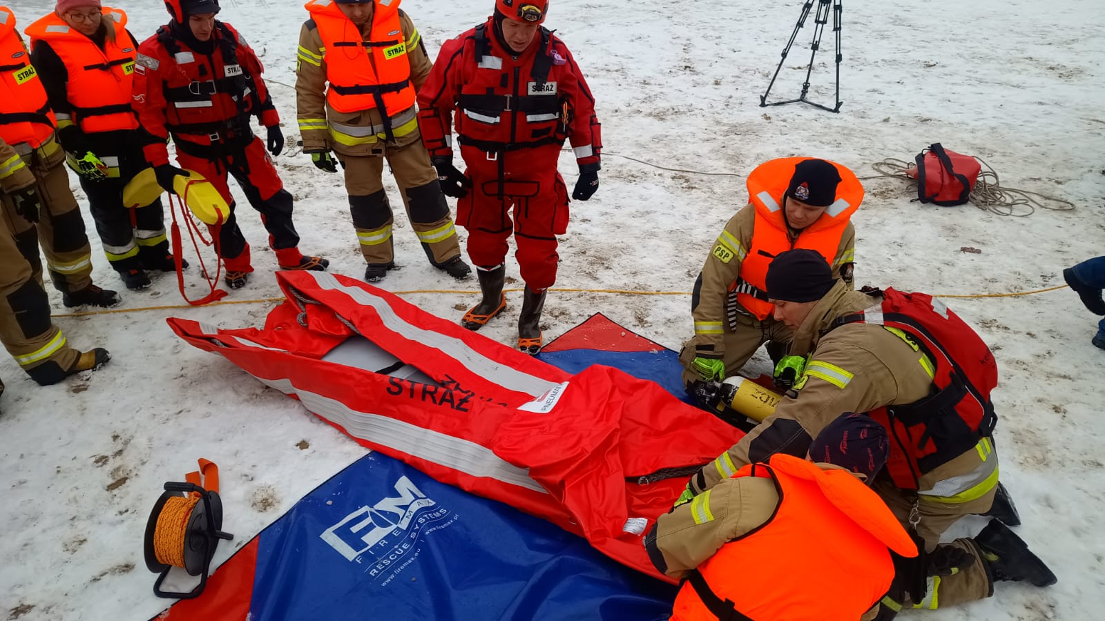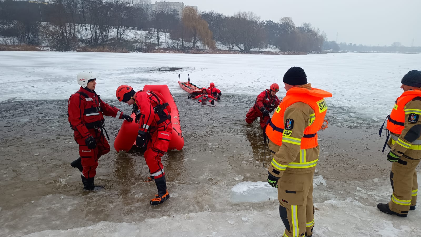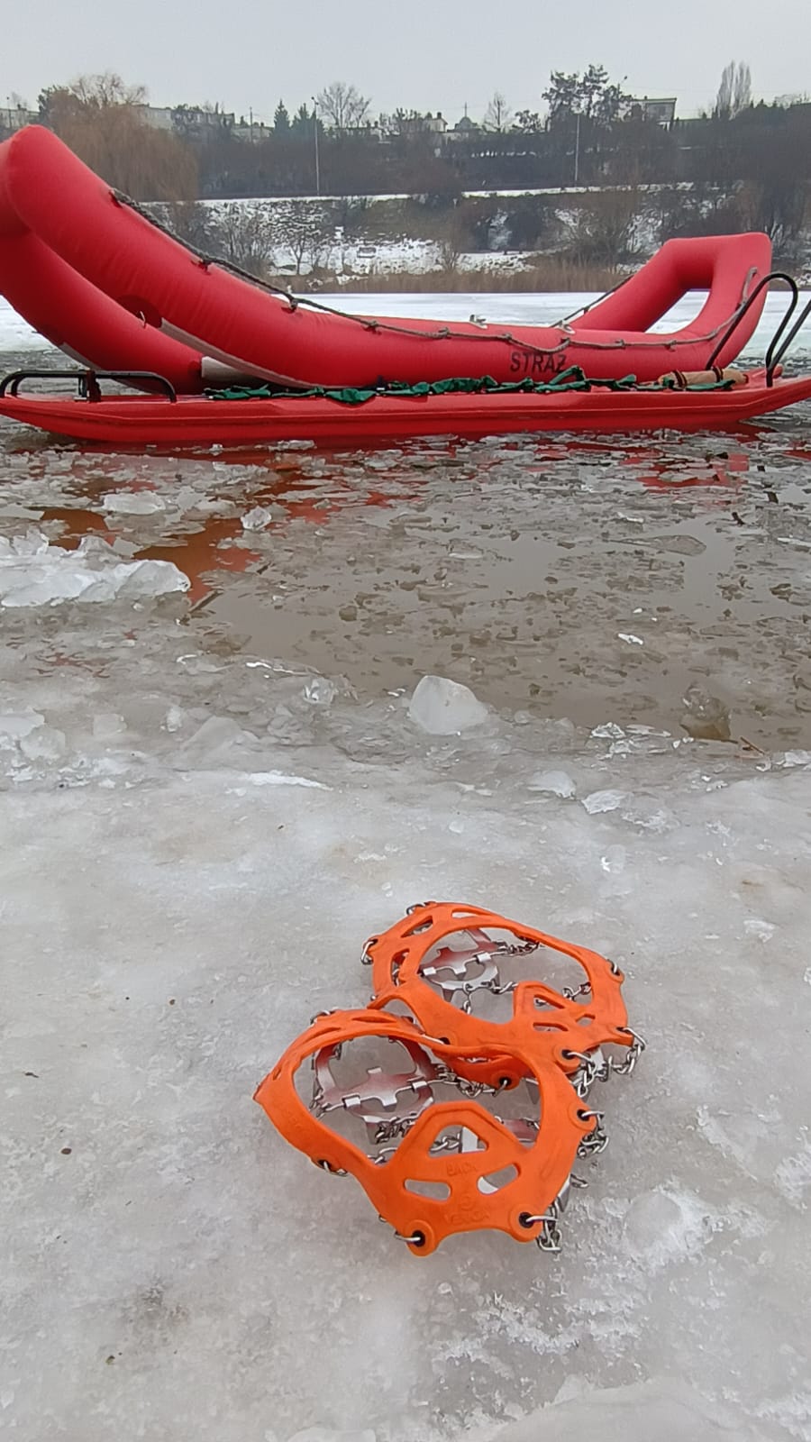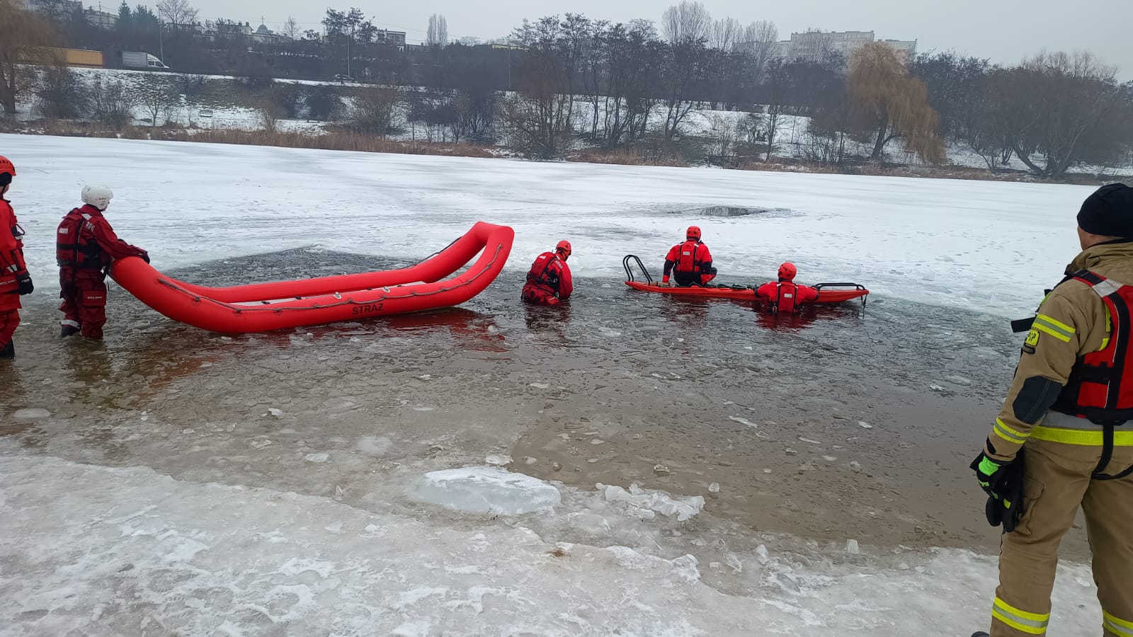 Na zakończenie ćwiczeń przeprowadzono test porównawczy pneumatycznej deski lodowej, którą do działań szkoleniowych udostępnili druhowie z Ochotniczej Straży Pożarnej w Powidzu. Sprzęt ten porównano z tradycyjną deską lodową, wykorzystywaną na co dzień przez JRG Gniezno, analizując ich funkcjonalność oraz przydatność w działaniach ratowniczych na zamarzniętych akwenach.