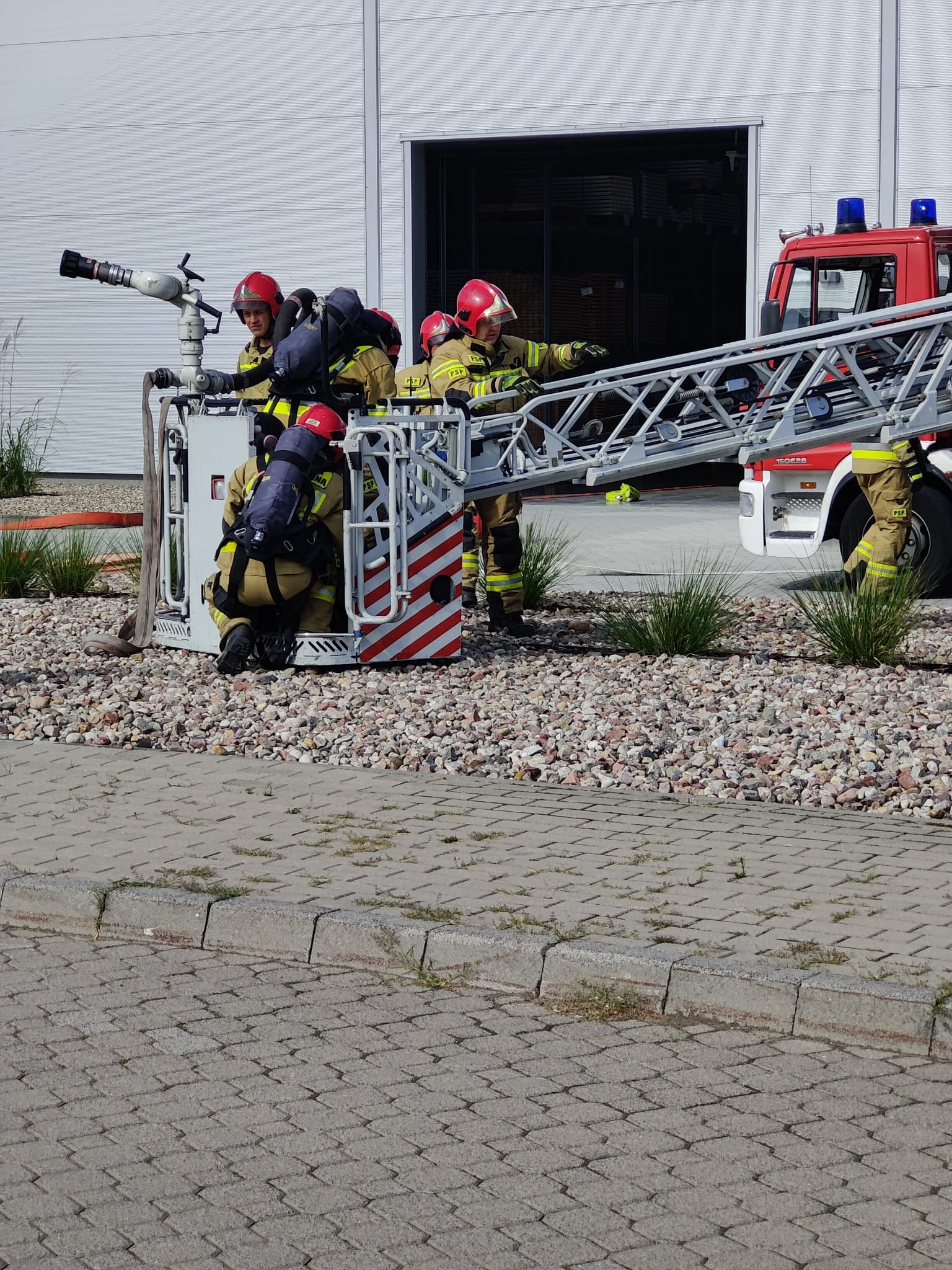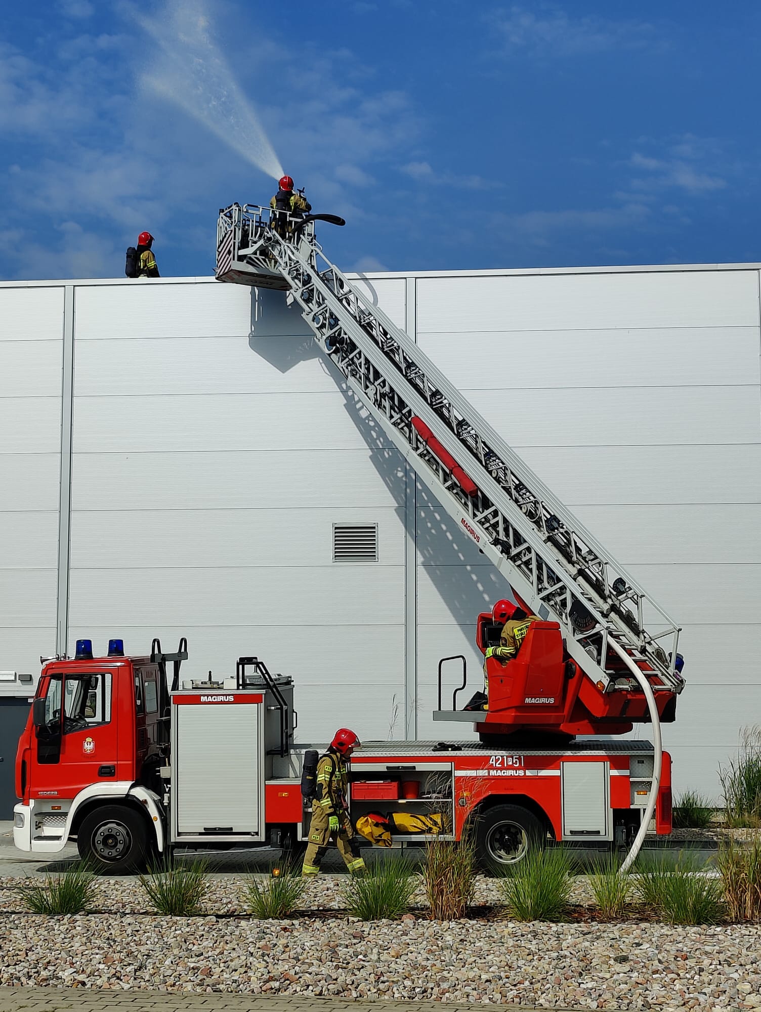 25 sierpnia 2023 r. na terenie firmy NB Polska Sp. z o.o. w Gnieźnie (Velux) odbyły się ćwiczenia ewakuacyjne dla pracowników. Przy okazji tego wydarzenia strażacy z Jednostki Ratowniczo-Gaśniczej w Gnieźnie pełniący w tym dniu służbę mieli okazję przećwiczyć organizację działań na wypadek pożaru i innych zagrożeń, które mogą wystąpić na terenie zakładu. Po wzbudzeniu alarmu pożarowego sygnał z monitoringu dotarł do Straży Pożarnej, gdzie dyżurny natychmiast zadysponował na miejsce zdarzenia zastępy z PSP. W tym czasie kierownictwo zakładu zarządziło ewakuację pracowników w miejsce zbiórki, dzięki czemu sprawdzono wewnętrzne procedury alarmowania funkcjonujące w zakładzie. Ważnym elementem tych ćwiczeń była próba możliwości użycia drabiny mechanicznej wykorzystywanej w przypadku działań ratowniczo-gaśniczych obiektów wielkokubaturowych. Strażacy z gnieźnieńskiej jednostki trenowali budowę linii gaśniczych z wykorzystaniem będącego na wyposażeniu SCD-37 działka wodno-pianowego oraz operowanie prądami gaśniczymi z kosza drabiny mechanicznej. Wcześniejsze ćwiczenie praktyczne poprzedzone było wstępem teoretycznym dot. zasad pracy na wysokości zgodnie z obowiązującymi przepisami z zakresu bezpieczeństwa i higieny służby. Wnioski i spostrzeżenia, które powstały pozwolą na jeszcze lepsze i sprawniejsze działania podczas kolejnych ćwiczeń lub działań ratowniczo-gaśniczych.