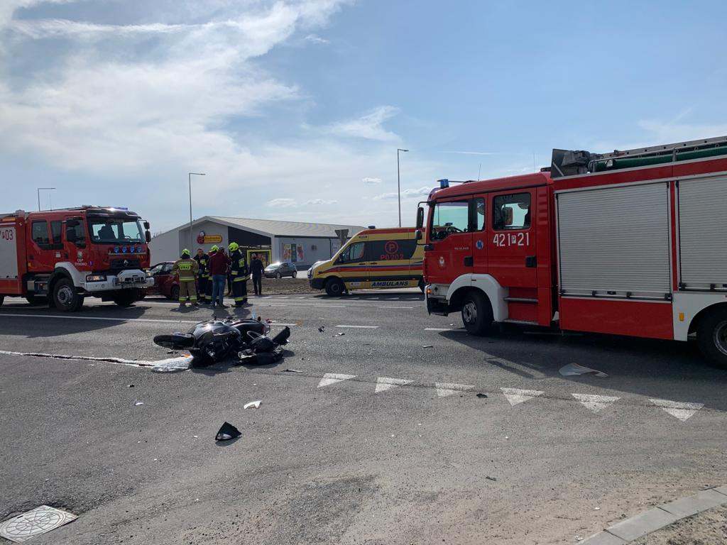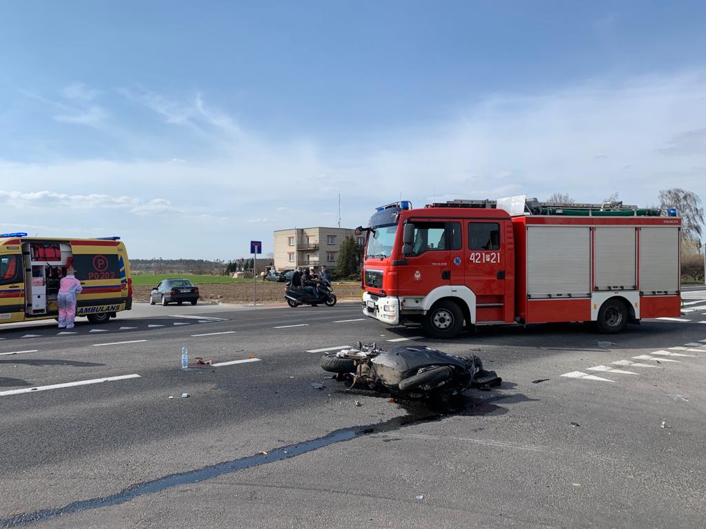 W niedzielne popołudnie 11 kwietnia 2021 roku po godzinie 15:00 do Stanowiska Kierowania Komendanta Powiatowego Państwowej Straży Pożarnej w Gnieźnie (SK KP) wpłynęła informacja o wypadku drogowych na drodze krajowej DK nr 15. Zgłoszenie dotyczyło zderzania motocykla z pojazdem osobowym, jedna z osób biorących udział w wypadku miała być poszkodowana. Zgodnie z tą informacją dyżurny SK KP na miejsce zdarzenia zadysponował zastępy z Jednostki Ratowniczo-Gaśniczej w Gnieźnie (GBA-Rt 2,5/25) oraz z Ochotniczej Straży Pożarnej z Żydowa (GBA 3/28). Po dojeździe na miejscu zdarzenia zastano leżącego na jezdni prowadzącego jednoślad, który wymagał udzielenia kwalifikowanej pierwszej pomocy. Osoby podróżujące pojazdem osobowym, który brał udział w zdarzeniu pozostawały wewnątrz pojazdu. Działania zastępów Straży Pożarnej polegały na zabezpieczeniu miejsca zdarzenia oraz udzieleniu kwalifikowanej pierwszej pomocy motocykliście oraz osobie kierującej pojazdem osobowym. W trakcie trwania działań okazało się, że kwalifikowanej pierwszej pomocy wymagają również pozostałe dwie osoby będące pasażerami pojazdu osobowego. Na miejsce zdarzenia sukcesywnie przybywały Zespoły Ratownictwa Medycznego, którym przekazywano osoby poszkodowane. Cała czwórka uczestników wypadku została przetransportowana do szpitali w Gnieźnie i we Wrześni. Na czas działań droga krajowa DK 15 była zablokowana. Będąca na miejscu zdarzenia Policja wyznaczyła objazdy i prowadziła działania zawiązane z ustaleniem okoliczności powstania wypadku. Po ich zakończeniu dalsze działania zastępów polegały na sorpcji płynów eksploatacyjnych. Czas działań, w których udział wzięło 11 strażaków PSP i OSP wyniósł 1 godzinę i 56 minut.