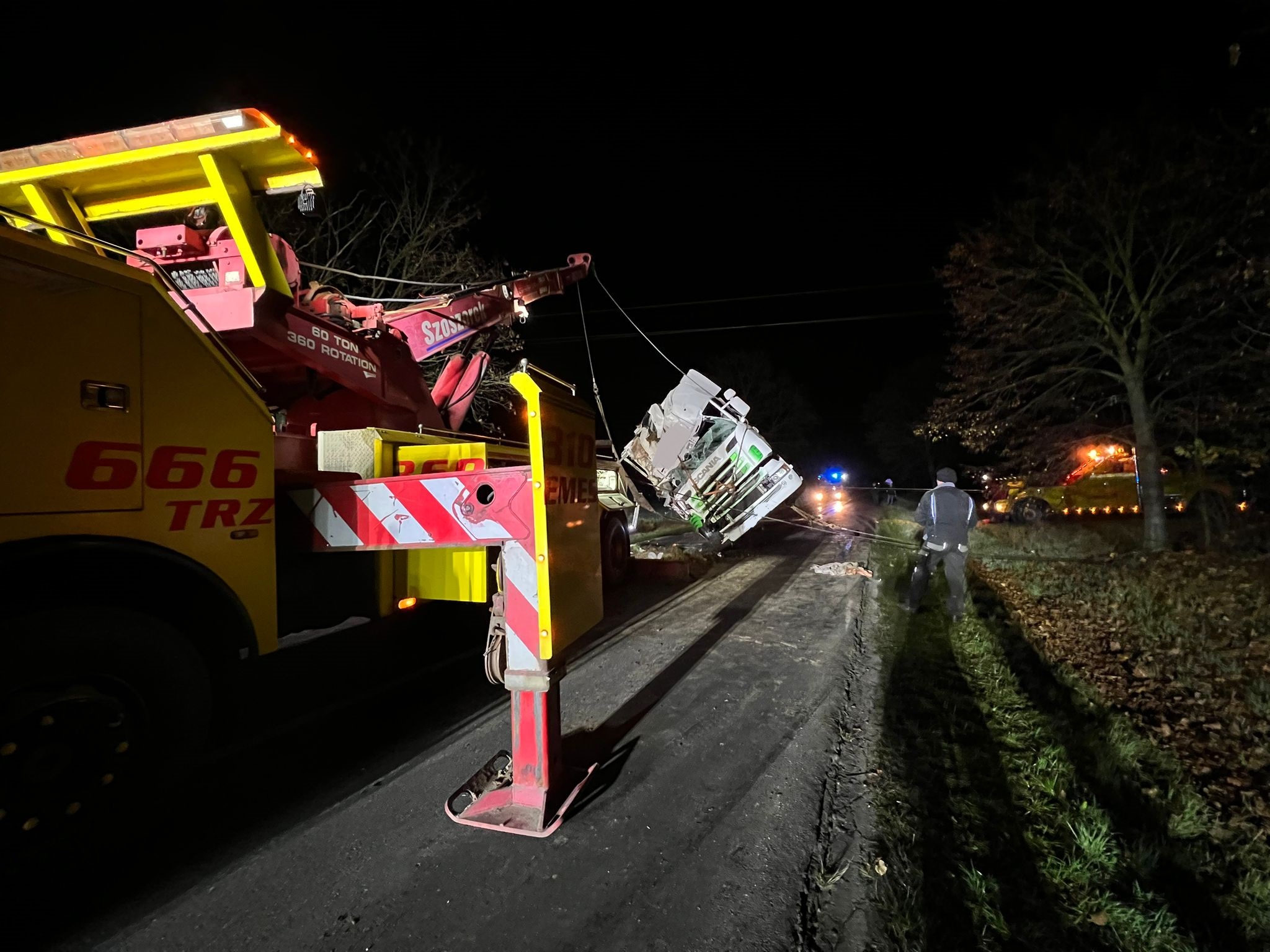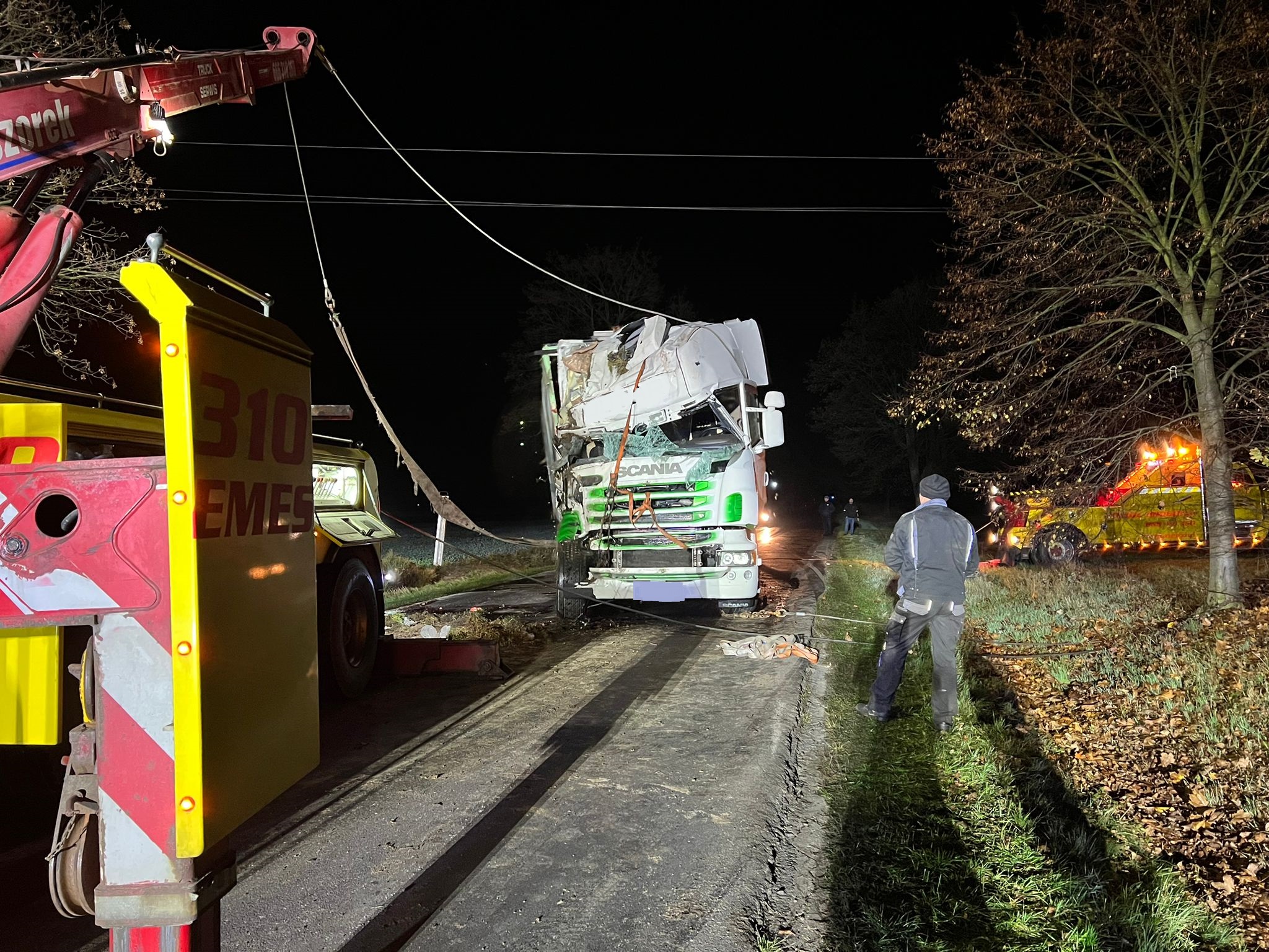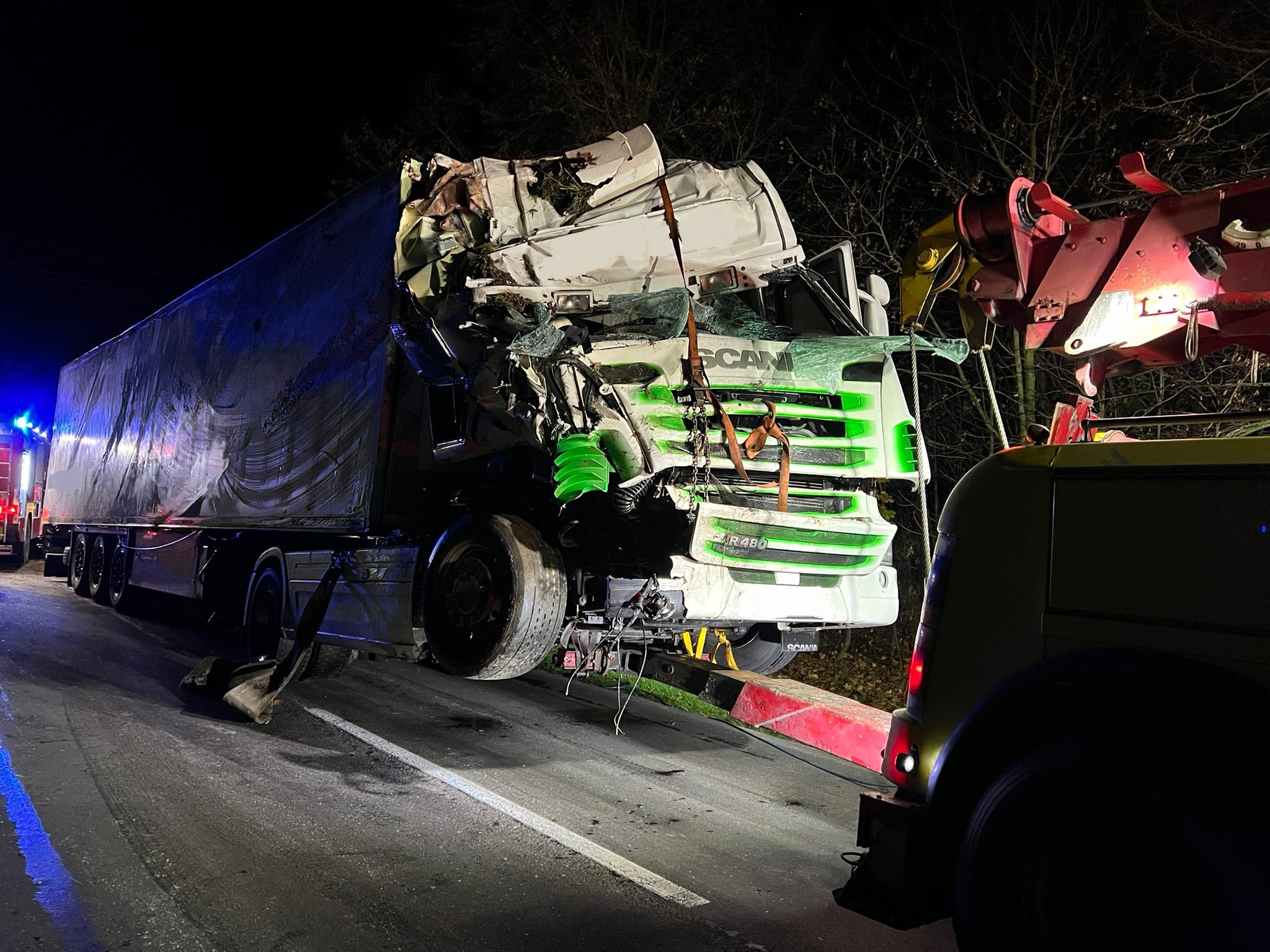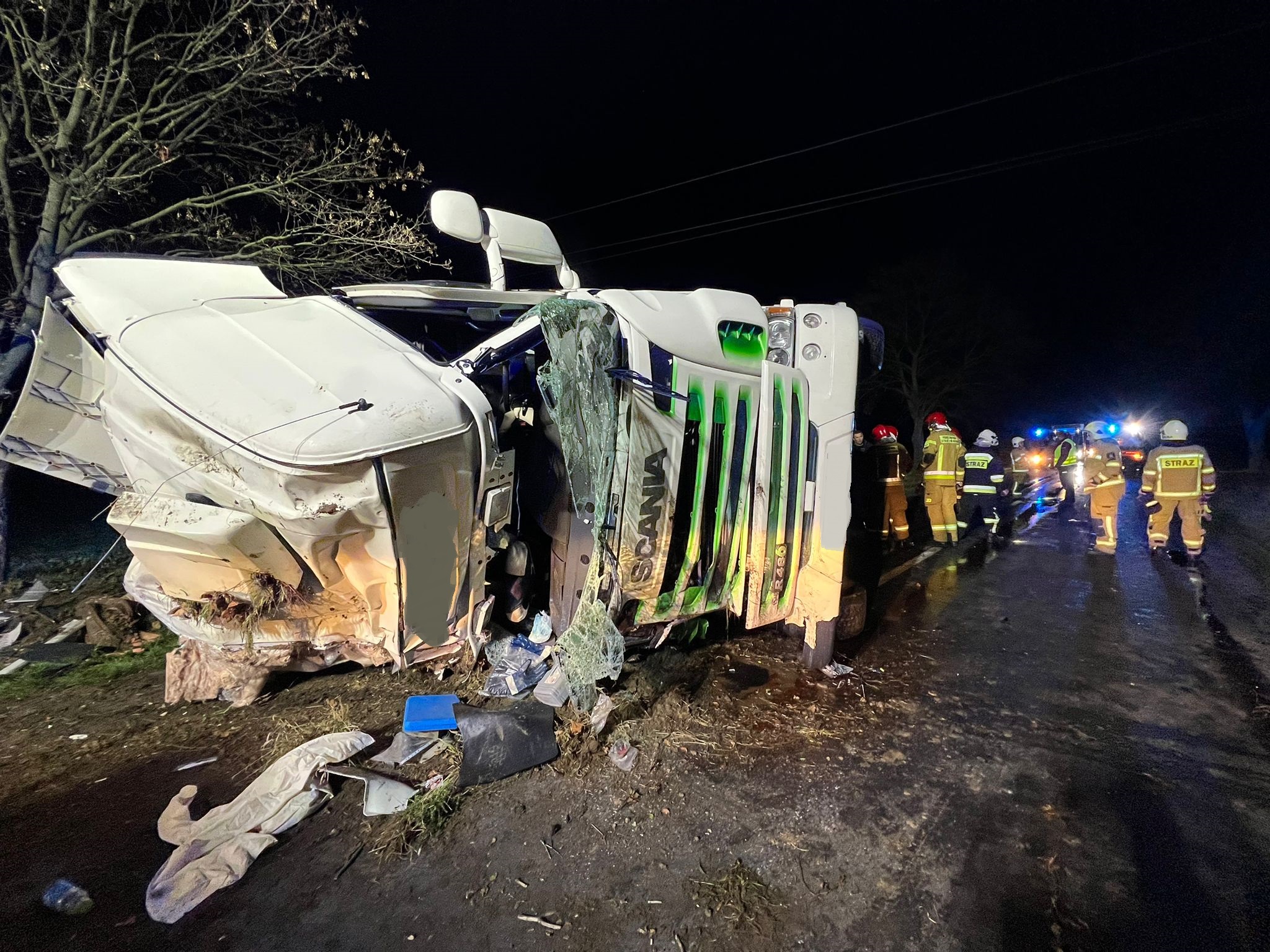W pierwszej części akcji działania Straży Pożarnej polegały na zabezpieczeniu miejsca zdarzenia, następnie strażacy przeprowadzili rozpoznanie ratownicze i oświetlili teren działań. Udzielono również poszkodowanemu kierowcy kwalifikowanej pierwszej pomocy a po przybyciu Zespołu Ratownictwa Medycznego został on przebadany w karetce przez ratowników medycznych – nie wymagał hospitalizacji. Właściciel transportu podstawił na teren akcji samochody zastępcze do których, przeładowano transportowany ładunek. Specjalistyczna Pomoc Drogowa postawiła zestaw na koła i odholowała uszkodzony pojazd. Na czas prowadzonych działań Policja zorganizowała objazdy. Dokładne okoliczności zdarzenia ustala Policja.