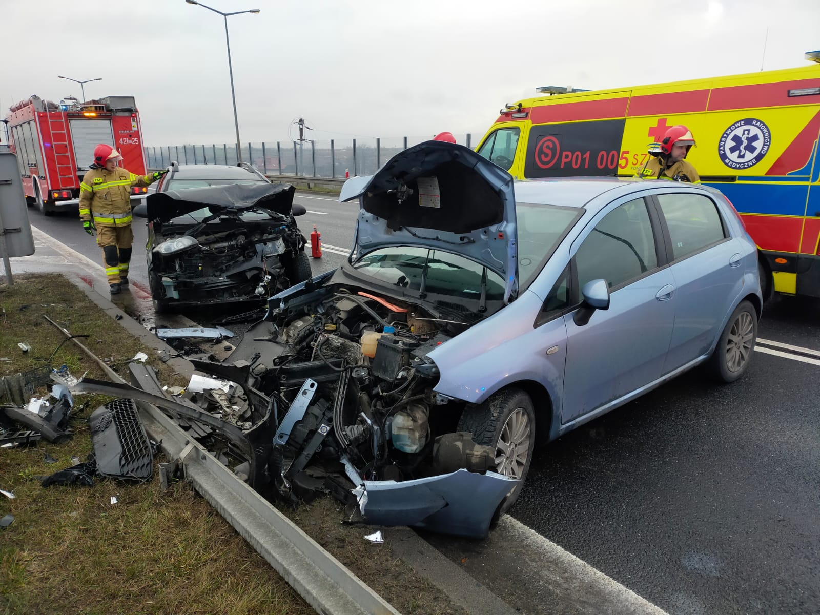 Działania Straży Pożarnej polegały na zabezpieczeniu miejsca zdarzenia, odłączeniu zasilania w uszkodzonych samochodach oraz pomocy ratownikom medycznym w transporcie do karetki (na noszach typu deska) jednego z poszkodowanych. Pozostałe dwie osoby przy asyście ratowników medycznych samodzielnie przeszły do karetki. Decyzją ZRM dwie osoby zostały zabrane karetką do szpitala na szczegółowe badania. Na koniec akcji strażacy zebrali z jezdni rozlane płyny eksploatacyjne przy użyciu sorbentu. Dokładne okoliczności zdarzenia ustala Policja. Na czas prowadzonych działań ruch odbywał się z utrudnieniami.