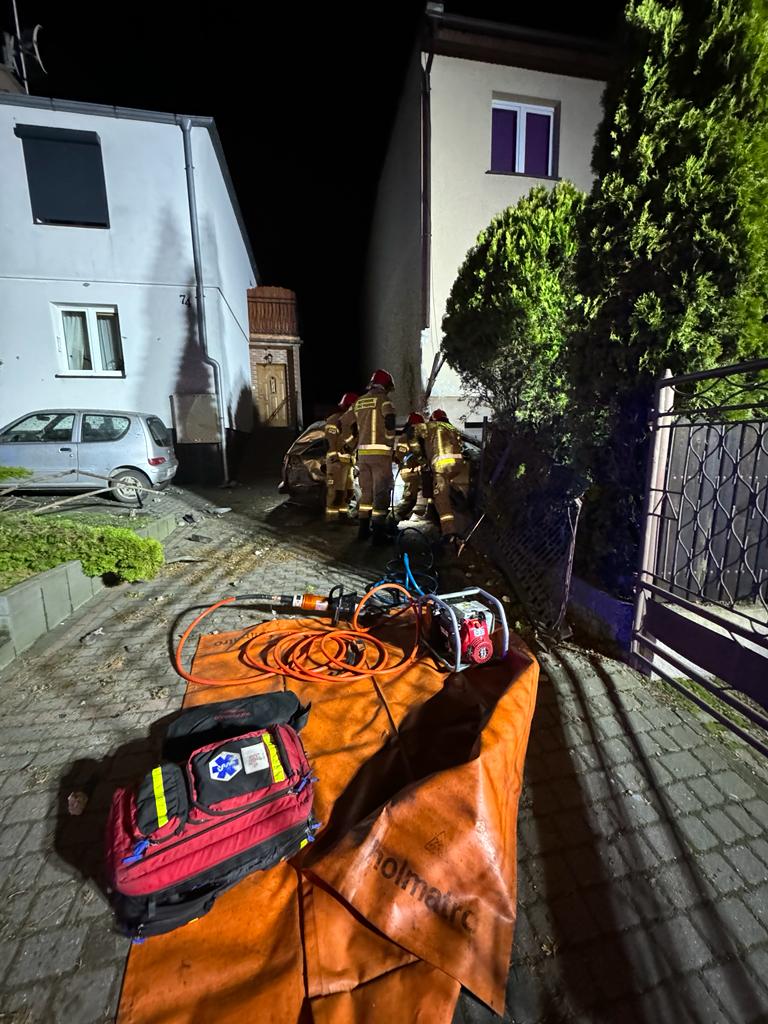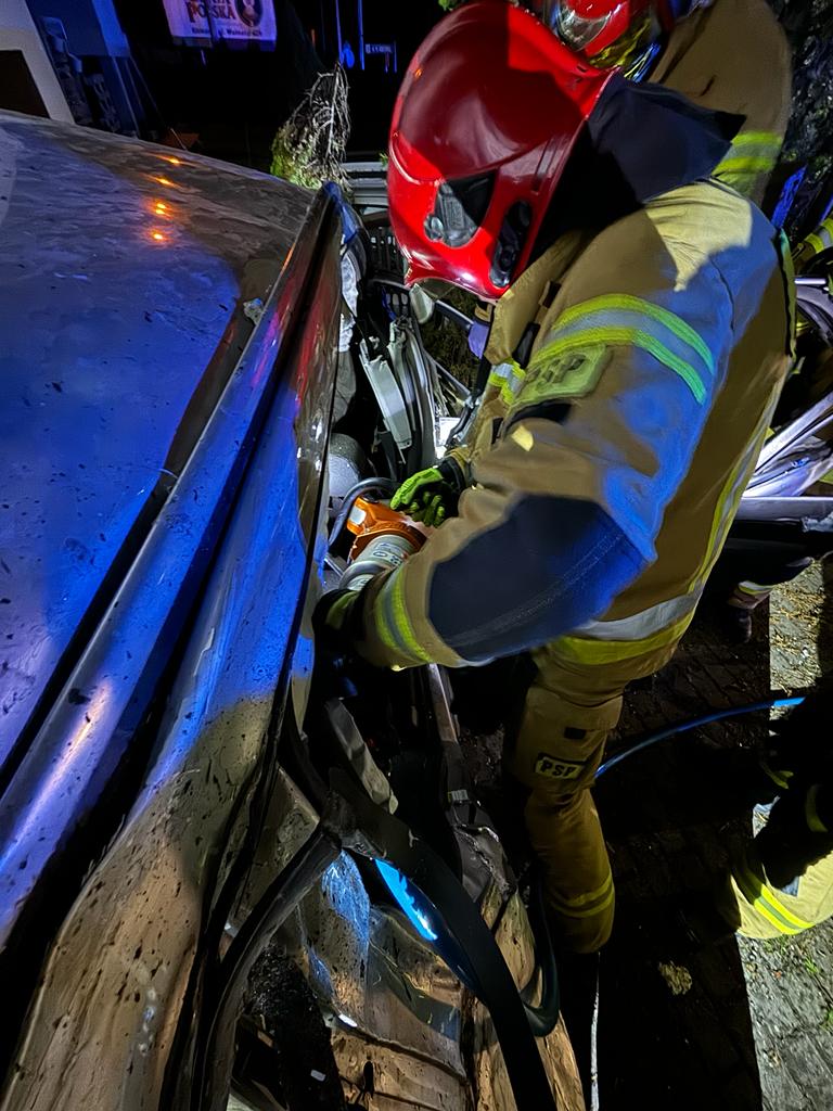W pierwszej części akcji działania Straży Pożarnej polegały na zabezpieczeniu miejsca zdarzenia, przeprowadzeniu rozpoznania ratowniczego i oświetleniu terenu działań. Następnie przy użyciu narzędzi hydraulicznych wykonano dostęp do osoby poszkodowanej znajdującej się w pojeździe. W między czasie strażacy udzielili poszkodowanemu kwalifikowanej pierwszej pomocy. Po przybyciu Zespołu Ratownictwa Medycznego poszkodowanego ewakuowano do karetki i przetransportowano do szpitala. Na miejsce przybyło także Pogotowie Energetyczne, które zabezpieczyło uszkodzoną latarnię. Dokładne okoliczności zdarzenia ustala Policja.