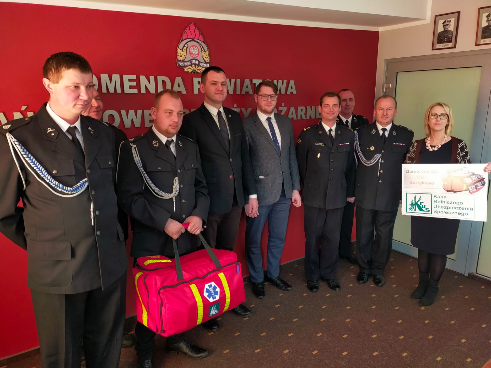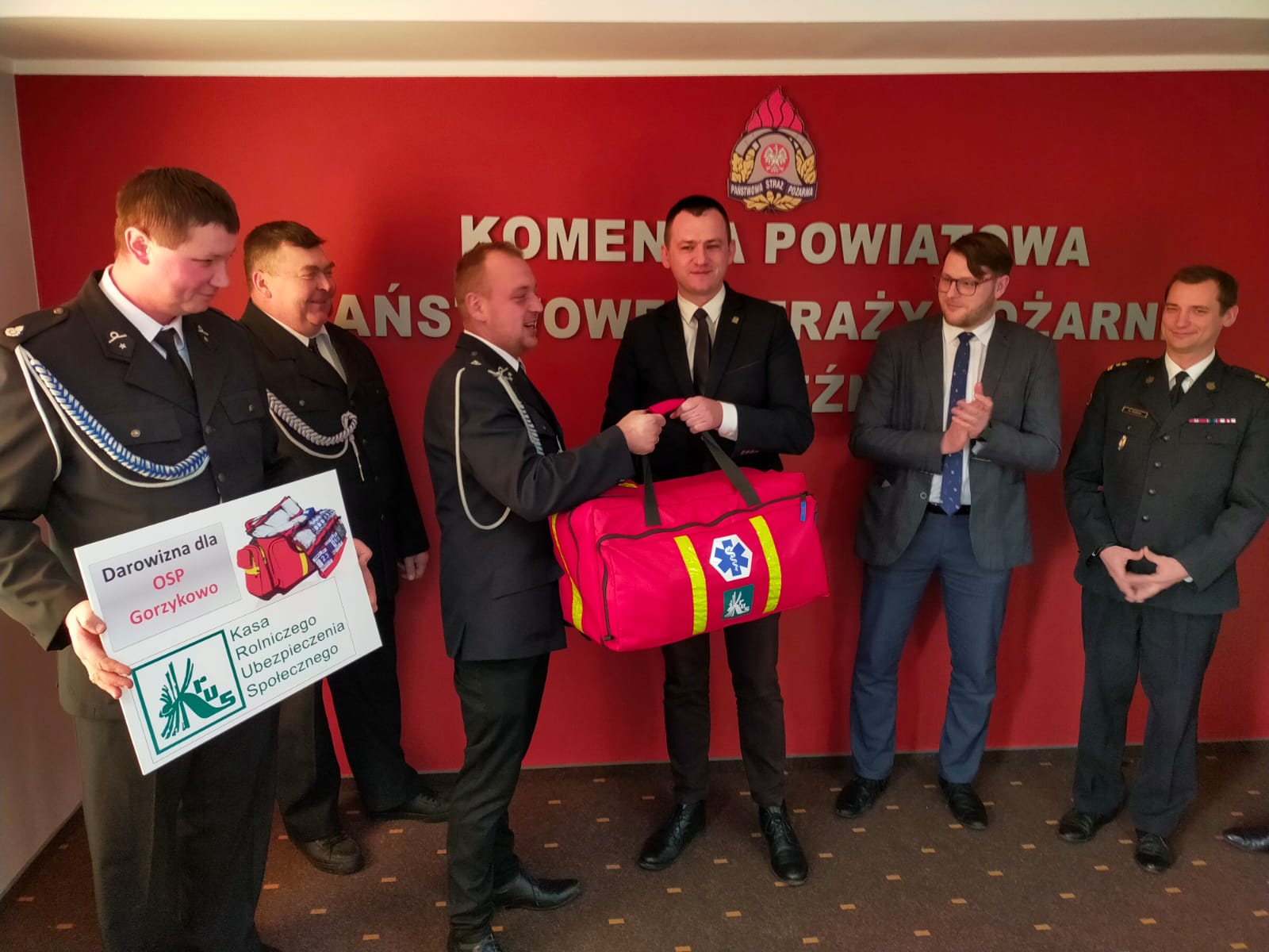 9 grudnia 2022 roku w sali konferencyjnej Komendy Powiatowej PSP w Gnieźnie odbyło się uroczyste przekazania torby medycznej dla jednostki z OSP w Gorzykowie. Sprzęt ten został ufundowany przez Kasę Rolniczego Ubezpieczenia Społecznego, a uroczystego wręczenia dokonał dyrektor Oddziału Regionalnego KRUS w Poznaniu Pan Łukasz Grabowski oraz kierownik placówki terenowej KRUS w Gnieźnie pani Beata Adamczyk. W uroczystości wręczenia udział wzięli m.in. Wojciech Szymczak dyrektor biura Posła na Sejm RP – Pana Zbigniewa Dolaty, komendant PSP w Gnieźnie bryg. Mariusz Dębski, radny powiatowy Pan Andrzej Kwapich oraz prezes zarządu oddziału miejsko-gminnego Związku Ochotniczych Straży Pożarnej RP w Witkowie pan Marian Łukowski. Przedstawiciele obdarowanej jednostek z OSP w Gorzykowie składają serdeczne podziękowania za udzielone wsparcie.
