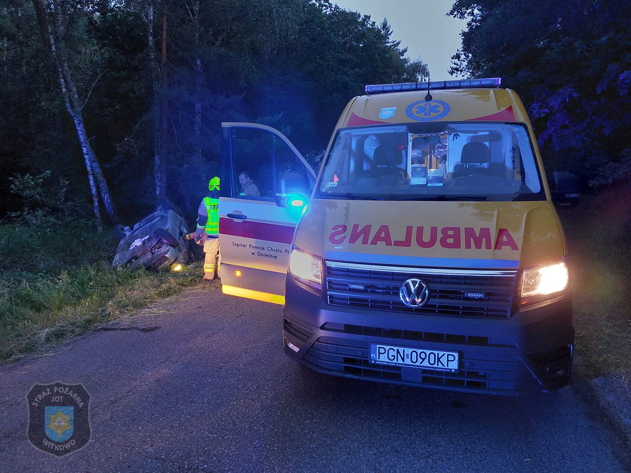 W nocy po godzinie 1:00 w Skorzęcinie (gm. Witkowo) doszło do wypadku z udziałem samochodu osobowego, który po wypadnięciu z drogi dachował. Na miejsce zdarzenia przybyły zadysponowane zastępy z JRG Gniezno, OSP Skorzęcin i OSP Witkowo. Po dojeździe na miejscu zdarzenia zastano samochód osobowy na dachu. Trzy osoby podróżujące pojazdem opuściły go przed przybyciem służb. Dwie z nich wymagały udzielenia kwalifikowanej pierwszej pomocy, której udzielili strażacy, a następnie zostały przekazano ZRM, który przetransportował je do szpitala. Dalsze działania zastępów straży to sorpcja płynów eksploatacyjnych oraz pomoc w usunięciu wraku pojazdu. Okoliczności zdarzenia wyjaśnia przybyła na miejsce zdarzenia Policja.