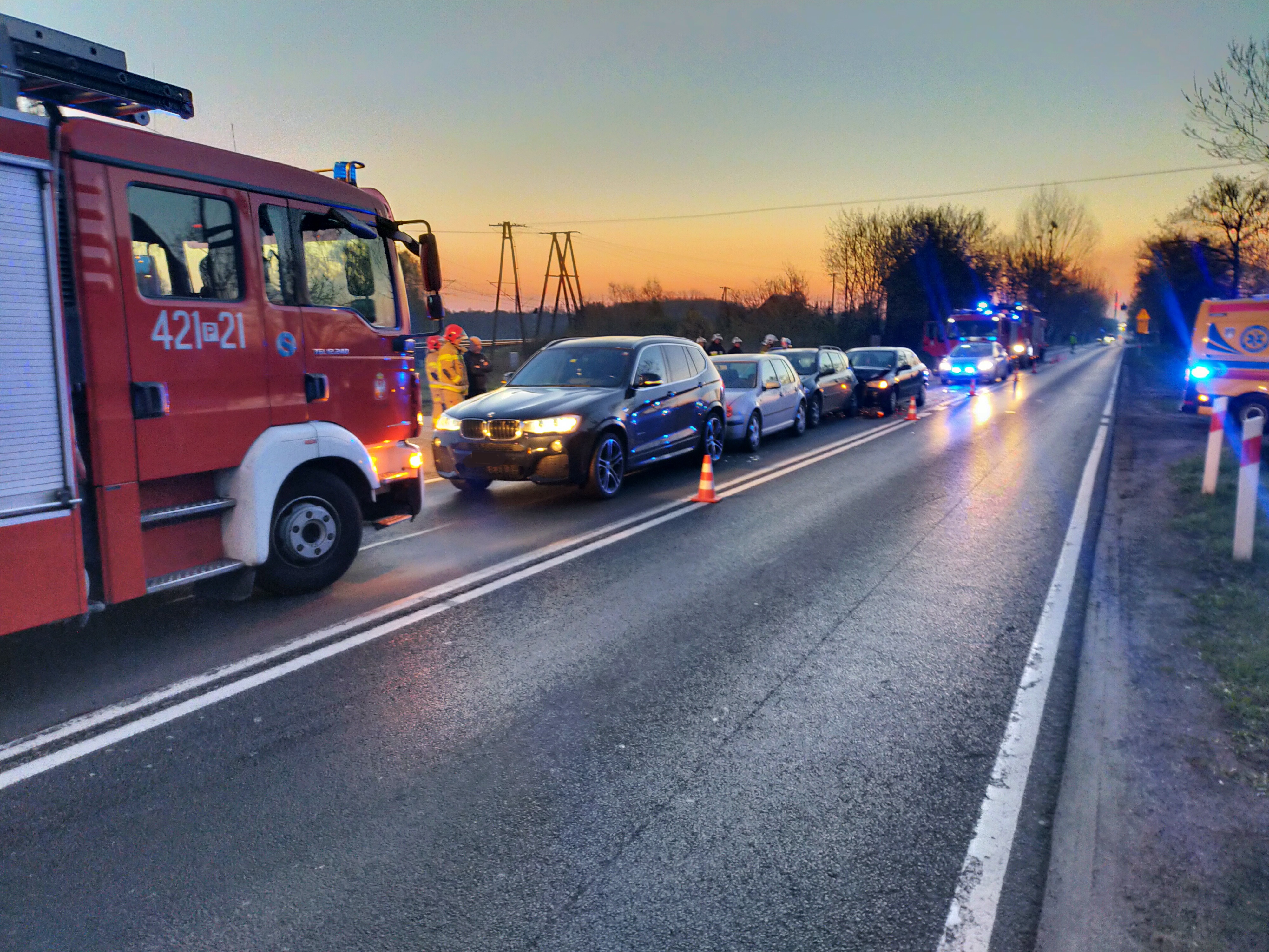 Działania Straży Pożarnej polegały na zabezpieczeniu miejsca zdarzenia i ustaleniu czy są osoby poszkodowane - łącznie samochodami podróżowało 11 osób. Na miejsce przybył również Zespół Ratownictwa Medycznego - nikt z osób podróżujących nie wymagał hospitalizacji w szpitalu. Dalsze działania strażaków polegały na kierowaniu ruchem drogowym wahadłowo oraz sorpcji rozlanych płynów eksploatacyjnych. Na miejscu obecna była Policja, która prowadzi czynności wyjaśniające.