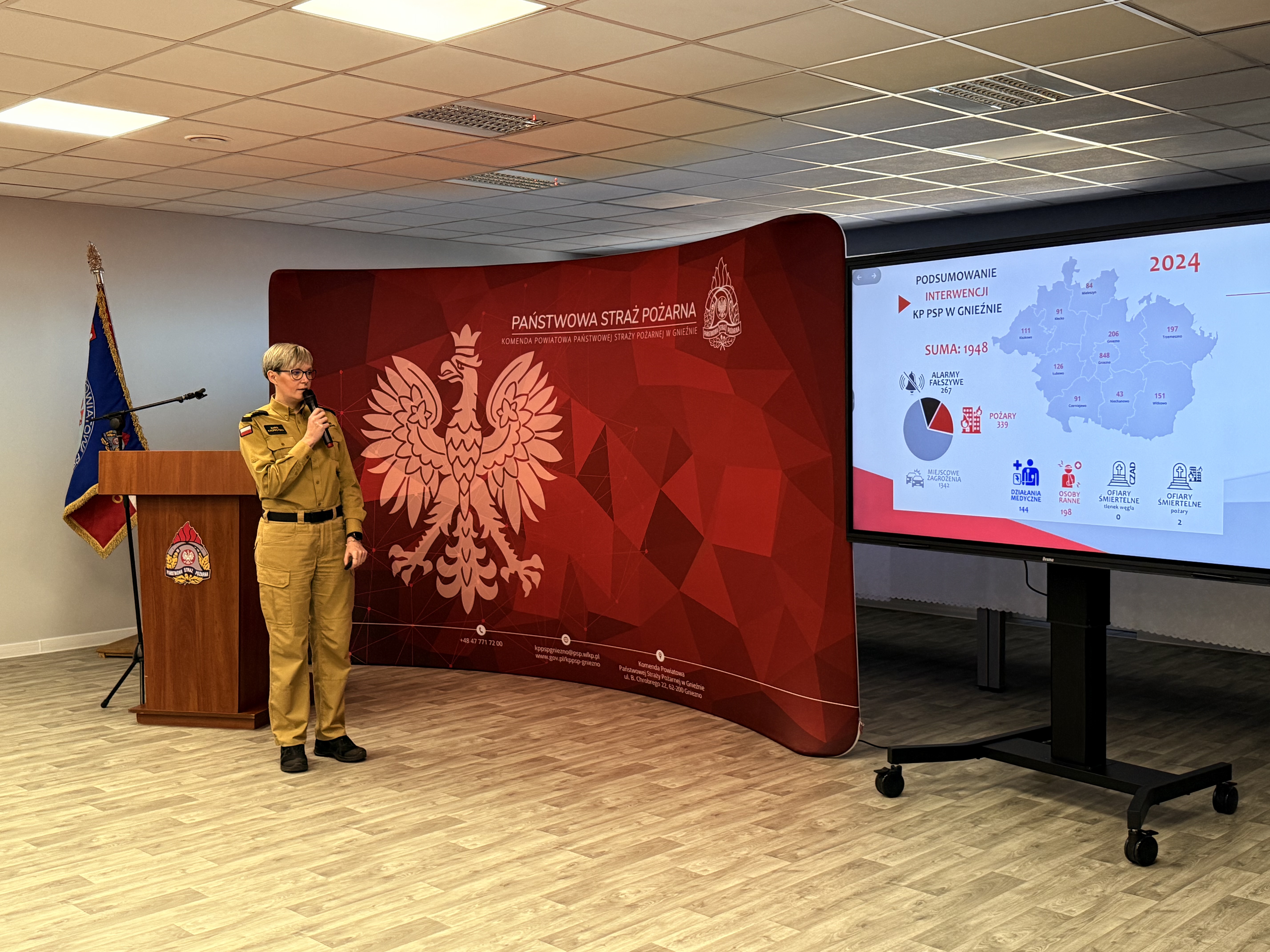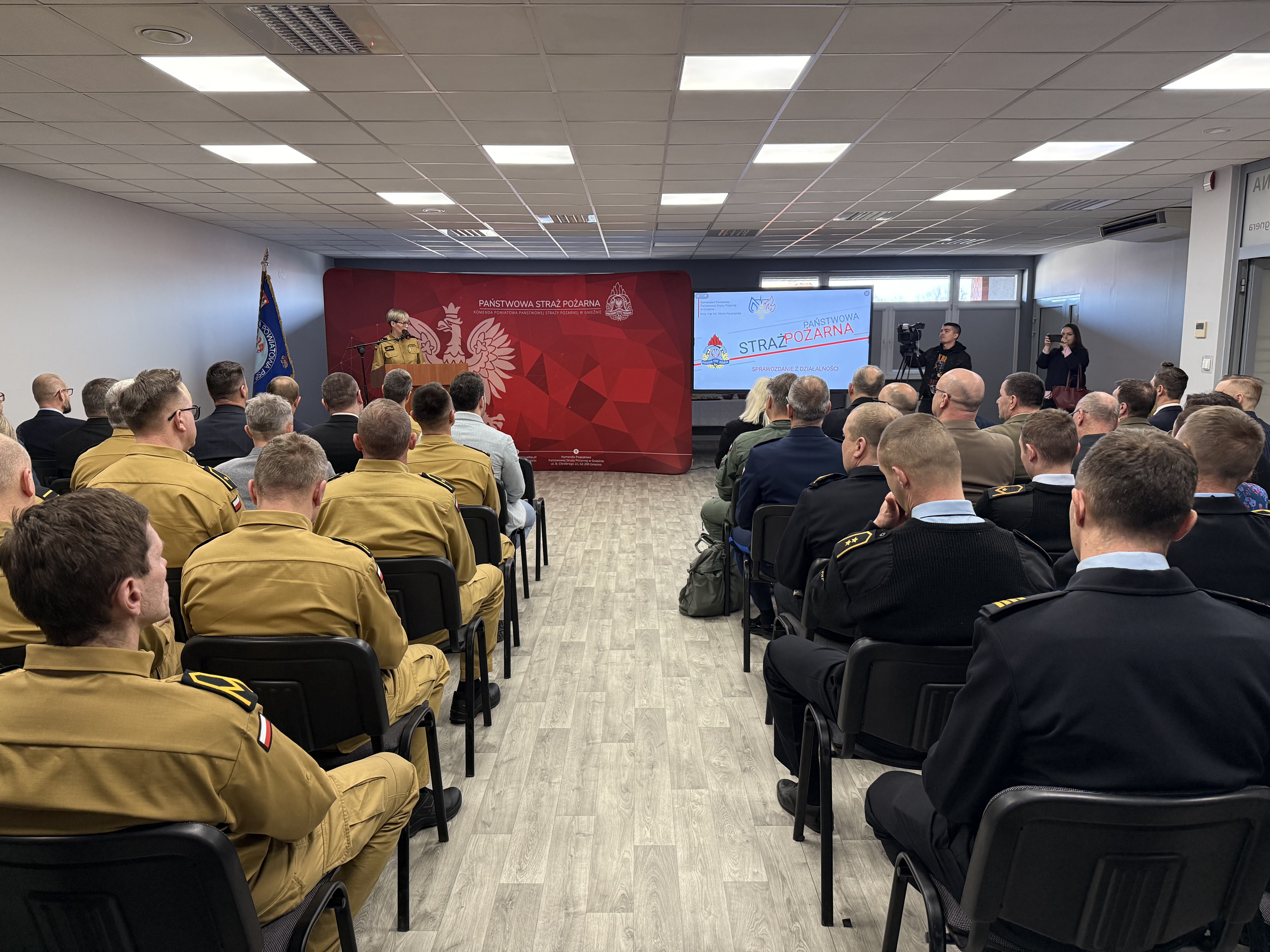5 lutego 2024 roku w sali konferencyjnej Komendy Powiatowej Państwowej Straży Pożarnej w Gnieźnie imienia mł. bryg. Marka Wegnera odbyła się odprawa służbowa. Podczas odprawy Komendant Powiatowy Państwowej Straży Pożarnej w Gnieźnie bryg. Marta Kacprzycka przedstawiła sprawozdanie z działalności gnieźnieńskich strażaków za 2024 rok, zwracając uwagę na najważniejsze dokonania w minionym roku. Następnie pani komendant podziękowała za dotychczasowe wsparcie władzom samorządowym, instytucjom publicznym i prywatnym, druhom z jednostek ochotniczych straży pożarnych oraz funkcjonariuszom i pracownikom cywilnym Komendy Powiatowej Państwowej Straży Pożarnej w Gnieźnie. Przedstawione zostały również plany do realizacji w roku 2025.