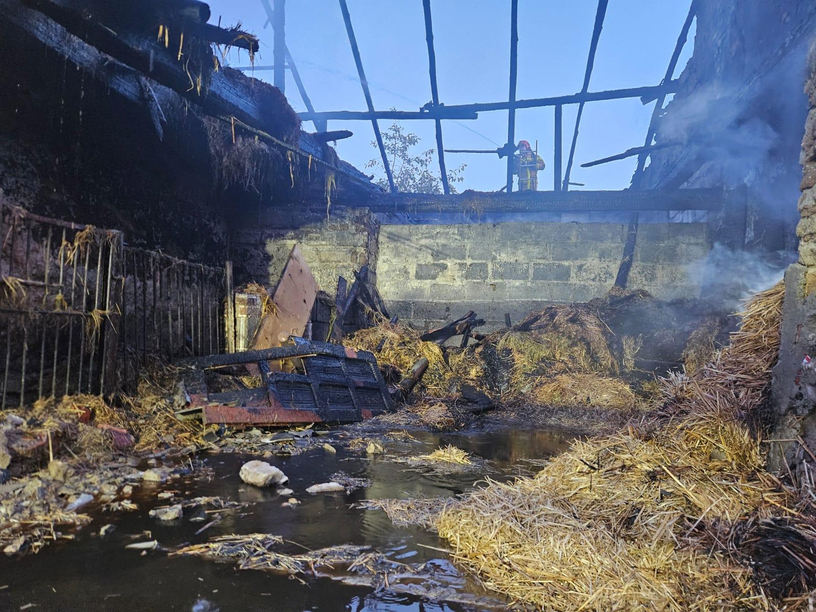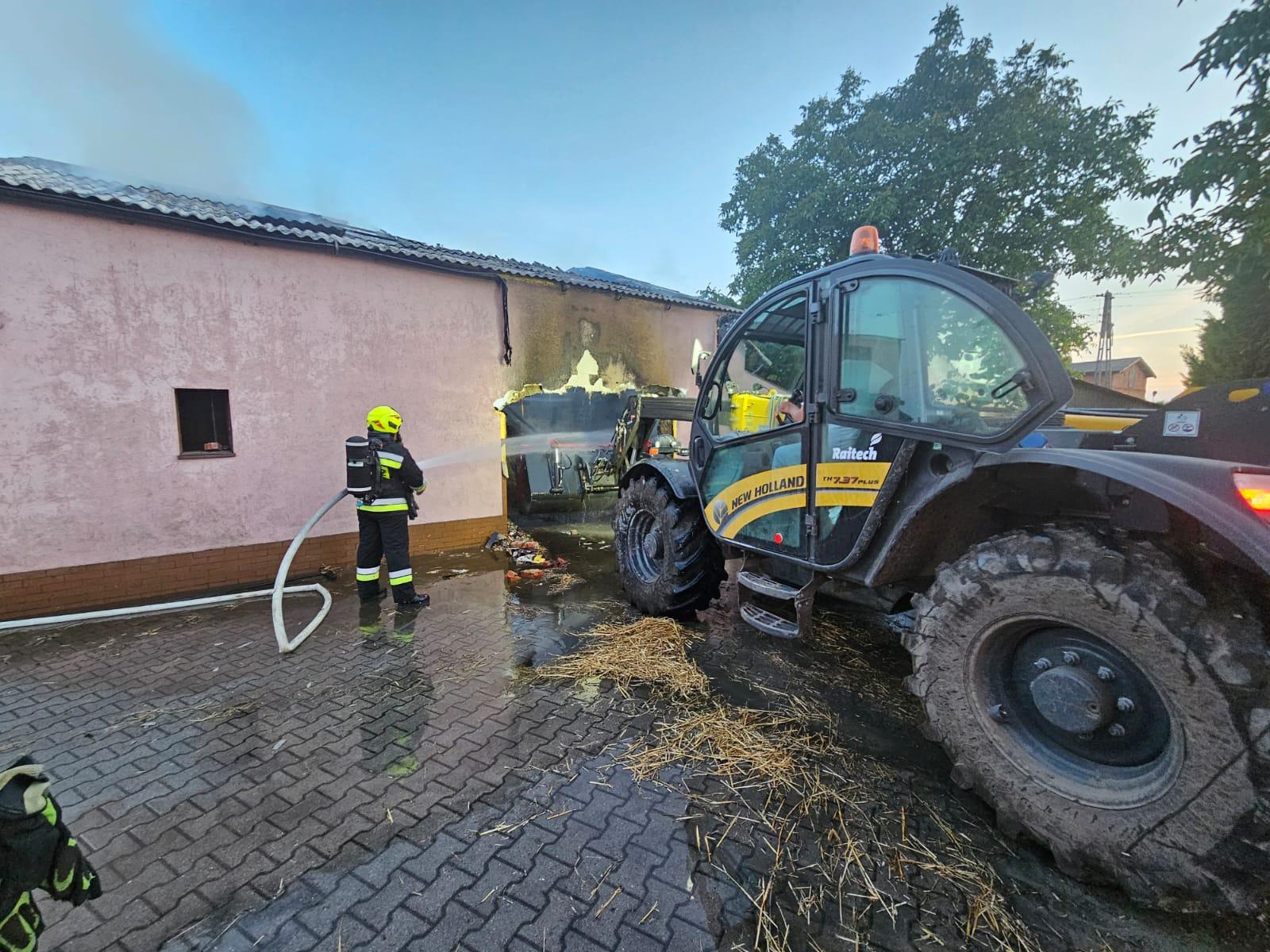 Po dotarciu na miejsce zdarzenia pierwszych zastępów zastano pożar budynku gospodarczego znajdującego się w bliskiej odległości od zabudowań mieszkalnych. Właściciel poinformował strażaków, że ewakuował większą część zwierząt na zewnątrz przed przybcyiem służb, jednakże część zwierząt (trzoda chlewna) pozostała wewnątrz mocno zadymionego budynku. We wnętrzu składowane były również baloty słomy, które objęte zostały pożarem. Działania zastępów straży pożarnej polegały na zabezpieczeniu miejsca zdarzenia, budowie linii gaśniczych i podaniu prądów gaśniczych na palący się budynek oraz ewakuacji zwierząt pozostałych w obiekcie. Większość z palących się balotów słomy została wyciągnięta przez udostępnioną przez właściciela budynku ładowarkę, a następnie dogaszona. Kolejnym elementem działań strażaków były prace rozbiórkowe konstrukcji dachowej. Niestety pomimo dużego wysiłku strażaków związanych z ewakuacją nie wszystkie zwierzęta udało się uratować. Po zakończonych działaniach pogorzelisko sprawdzono za pomocą kamery termowizyjnej.