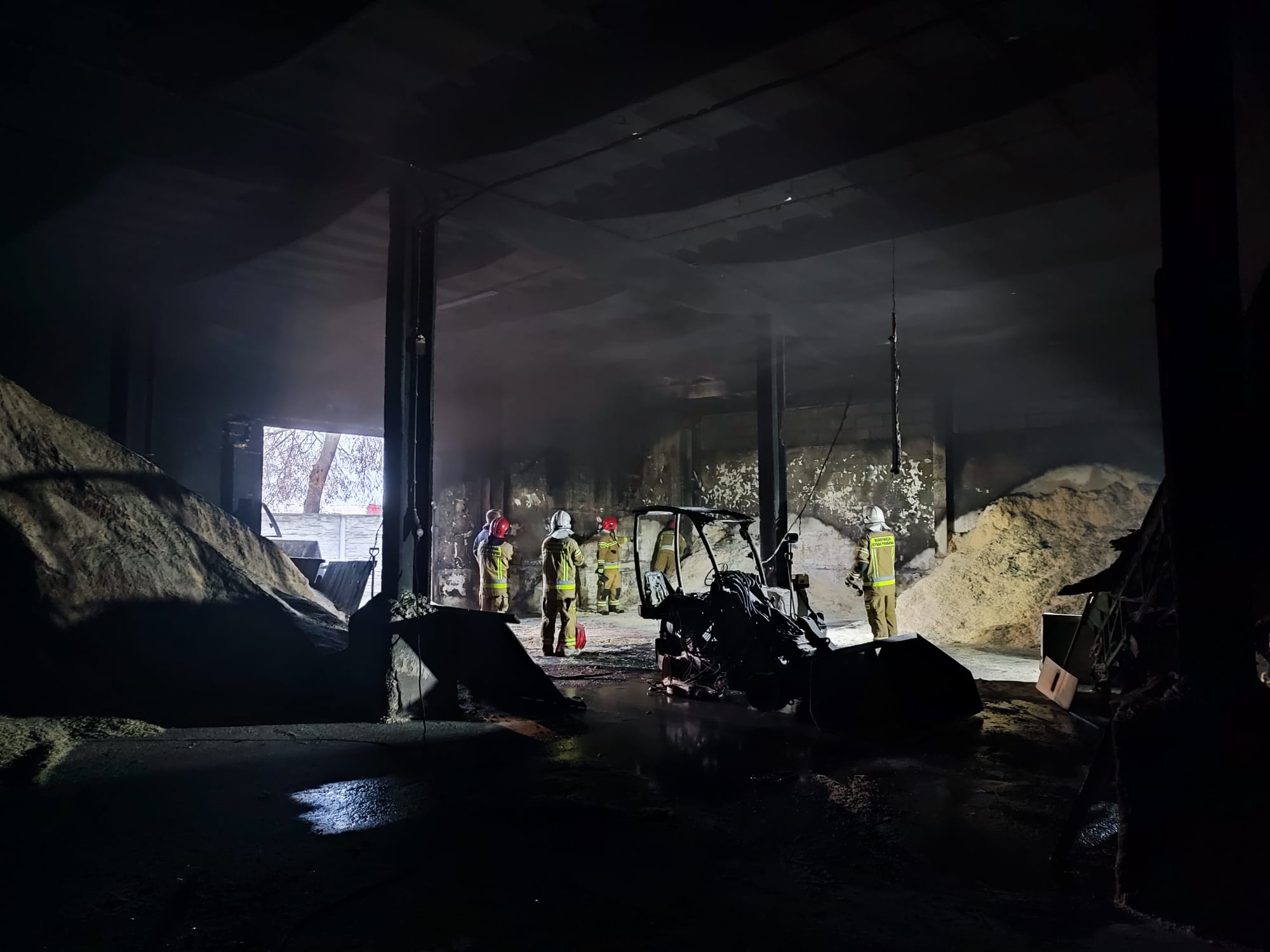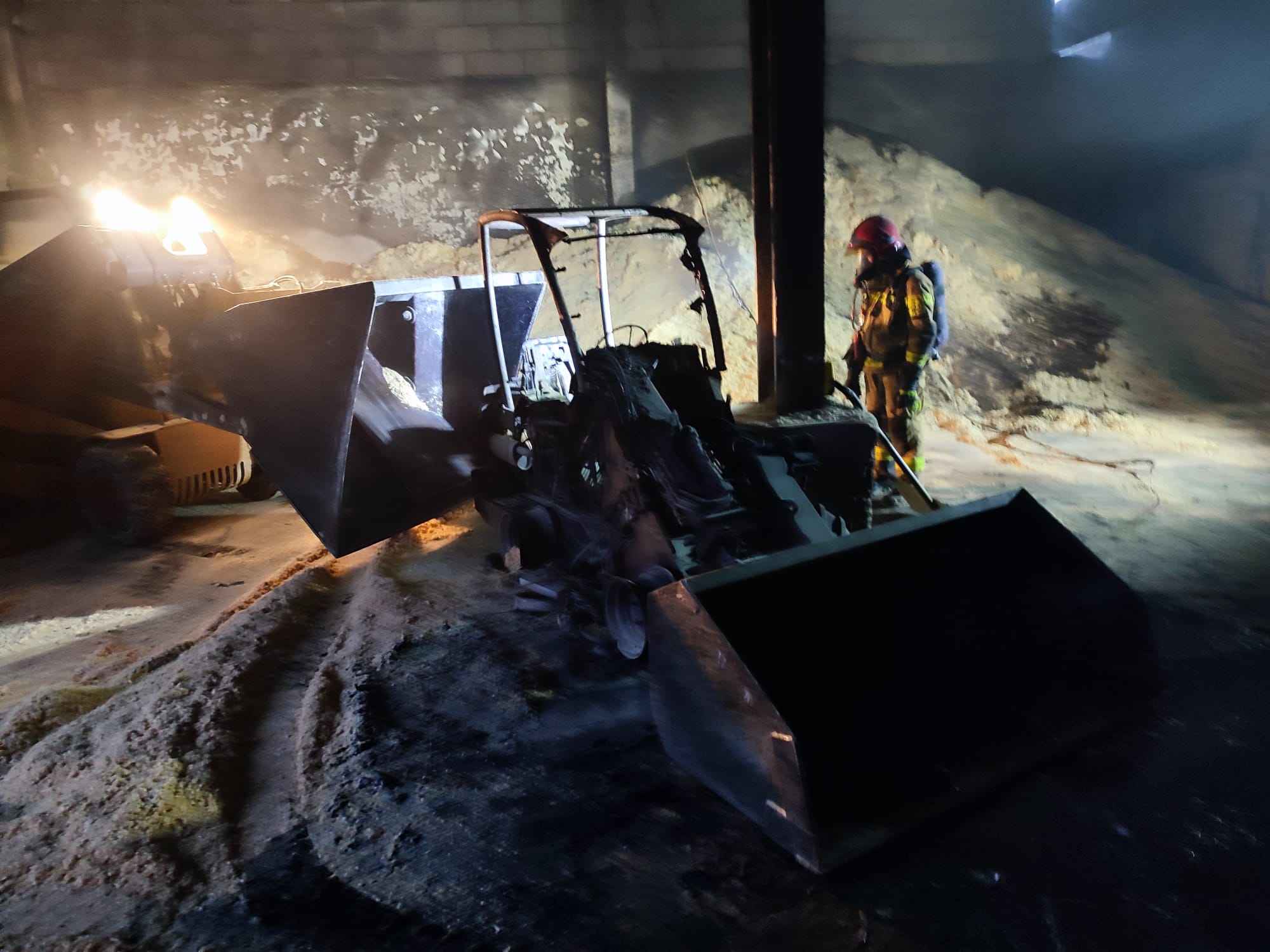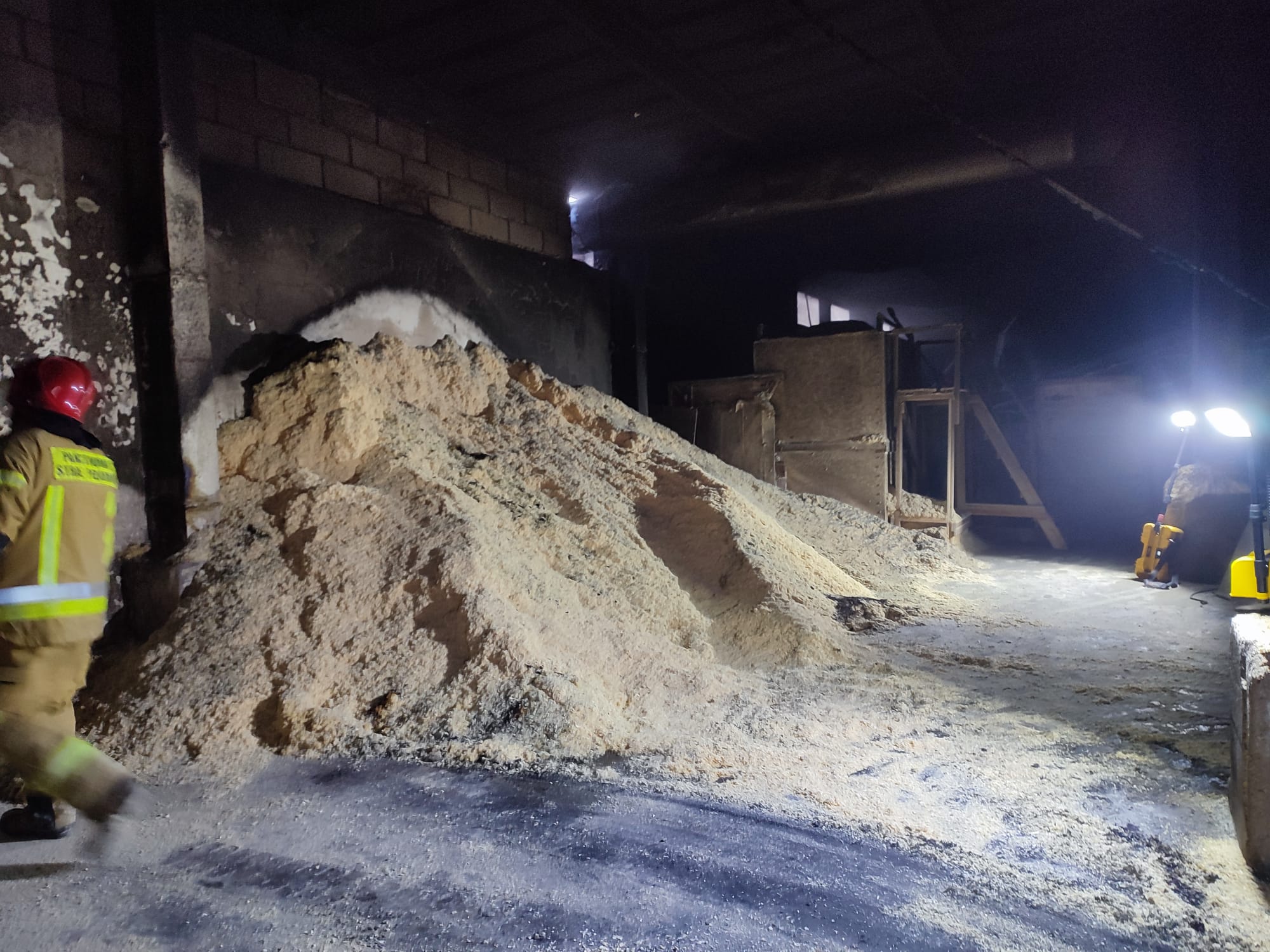 Działania Straży Pożarnej polegały na zabezpieczeniu miejsca zdarzenia oraz podaniu dwóch prądów wody w natarciu na źródło ognia. Z uwagi na duże zadymienie strażacy pracowali w aparatach ochrony dróg oddechowych. Po przewietrzeniu hali pracownik zakładu przy użyciu ładowarki wywoził z budynku nadpalone trociny, które były dogaszane na zewnątrz. W wyniku pożaru spaleniu uległa sterta trociny oraz ładowarka mechaniczna.