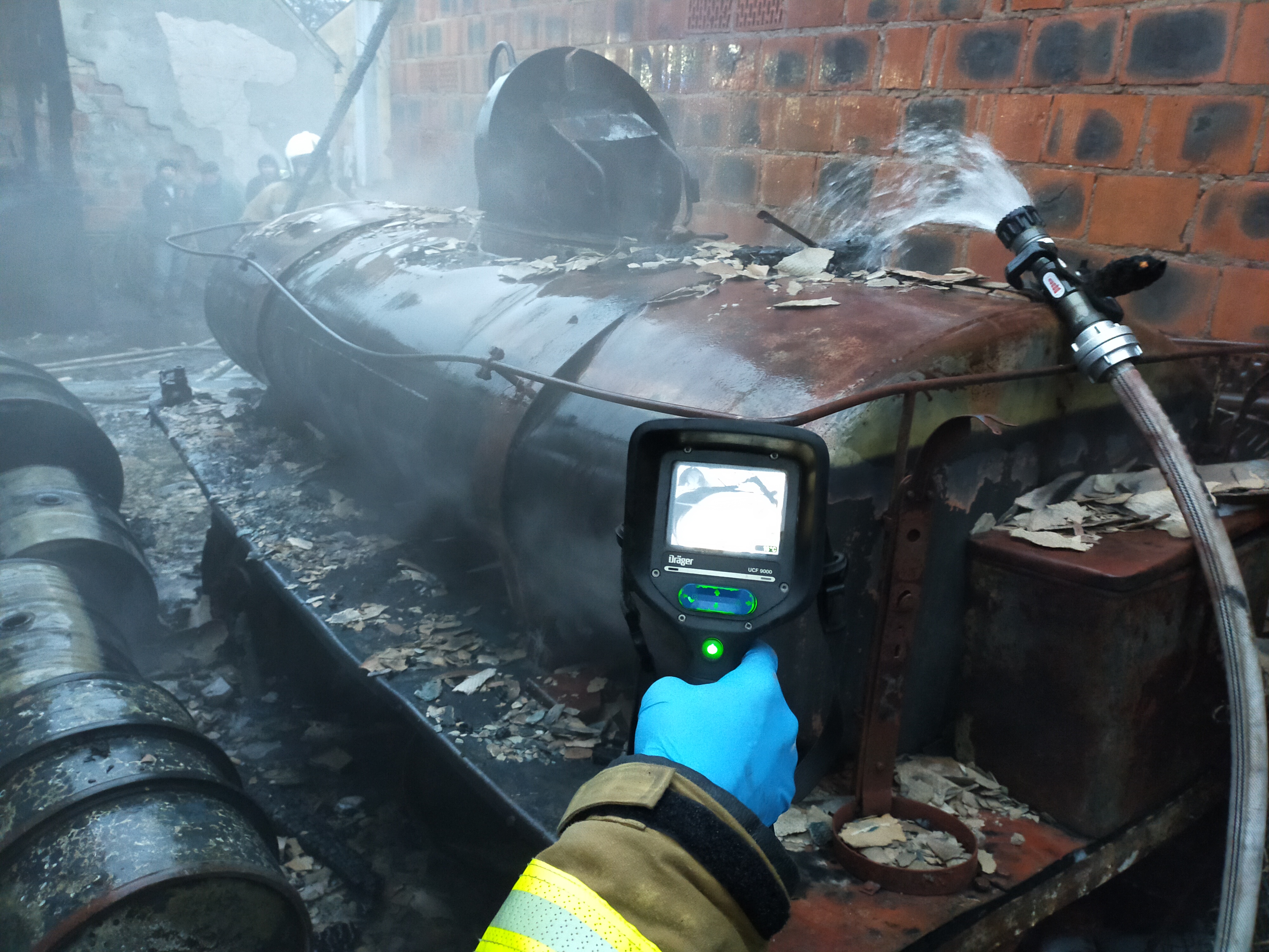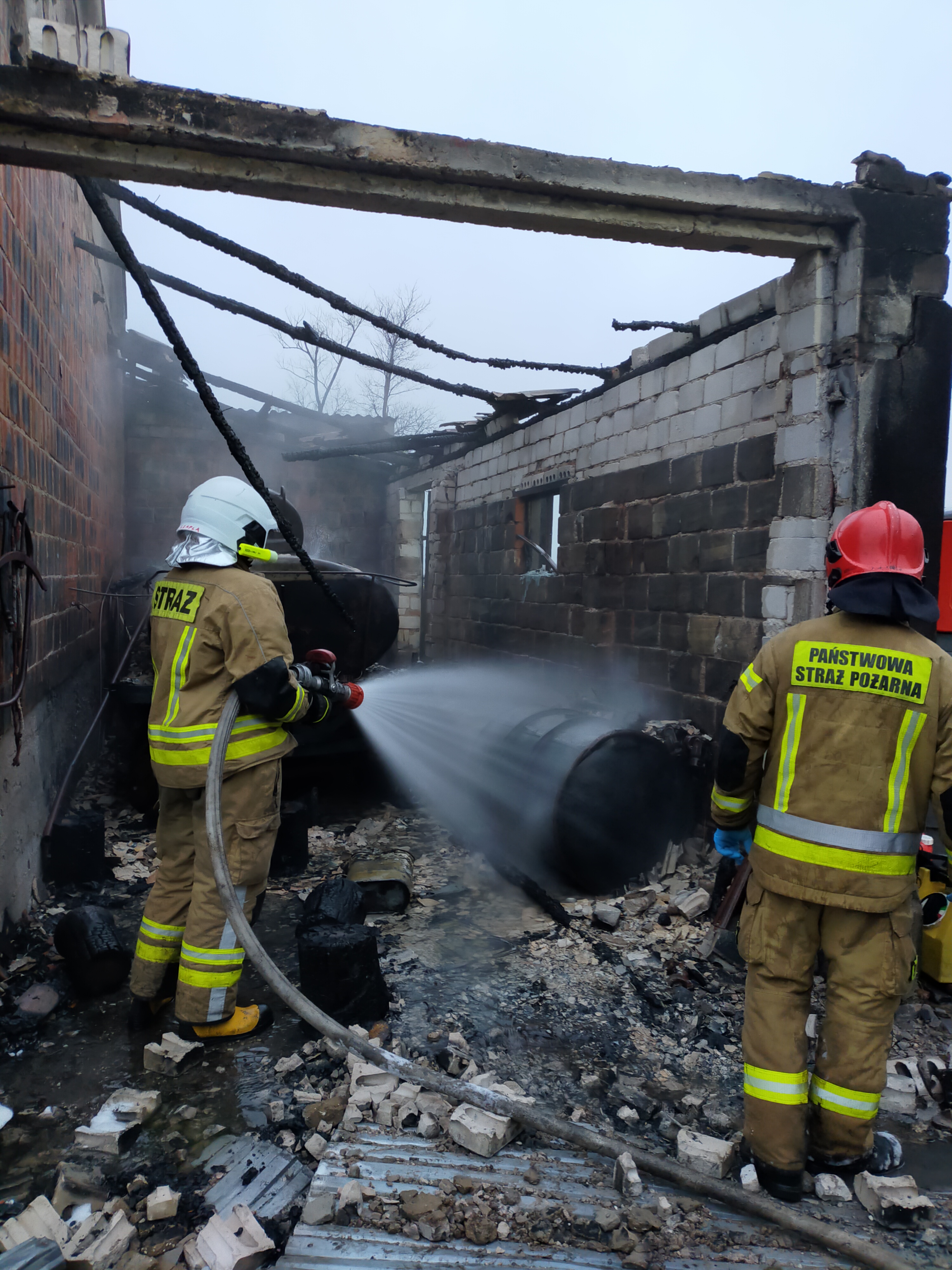 Działania Straży Pożarnej polegały na zabezpieczeniu miejsca zdarzenia oraz podaniu trzech prądów wody w natarciu na palący się obiekt oraz jednego w obronie na stodołę. Po stłumieniu płomieni przystąpiono do schładzania zbiorników poddanych działaniu termicznemu, które były szczelne oraz sprawdzono przyległą stodołę by wyeliminować ewentualne przedostanie się zarzewi ognia do wewnątrz budynku. Po schłodzeniu zbiorników miejsce pożaru pokryto pianą gaśniczą z Pro-Pack. Na miejscu obecna była również Policja.