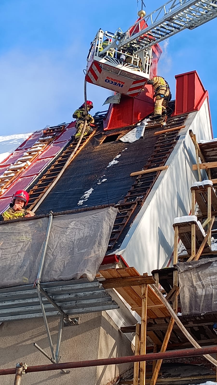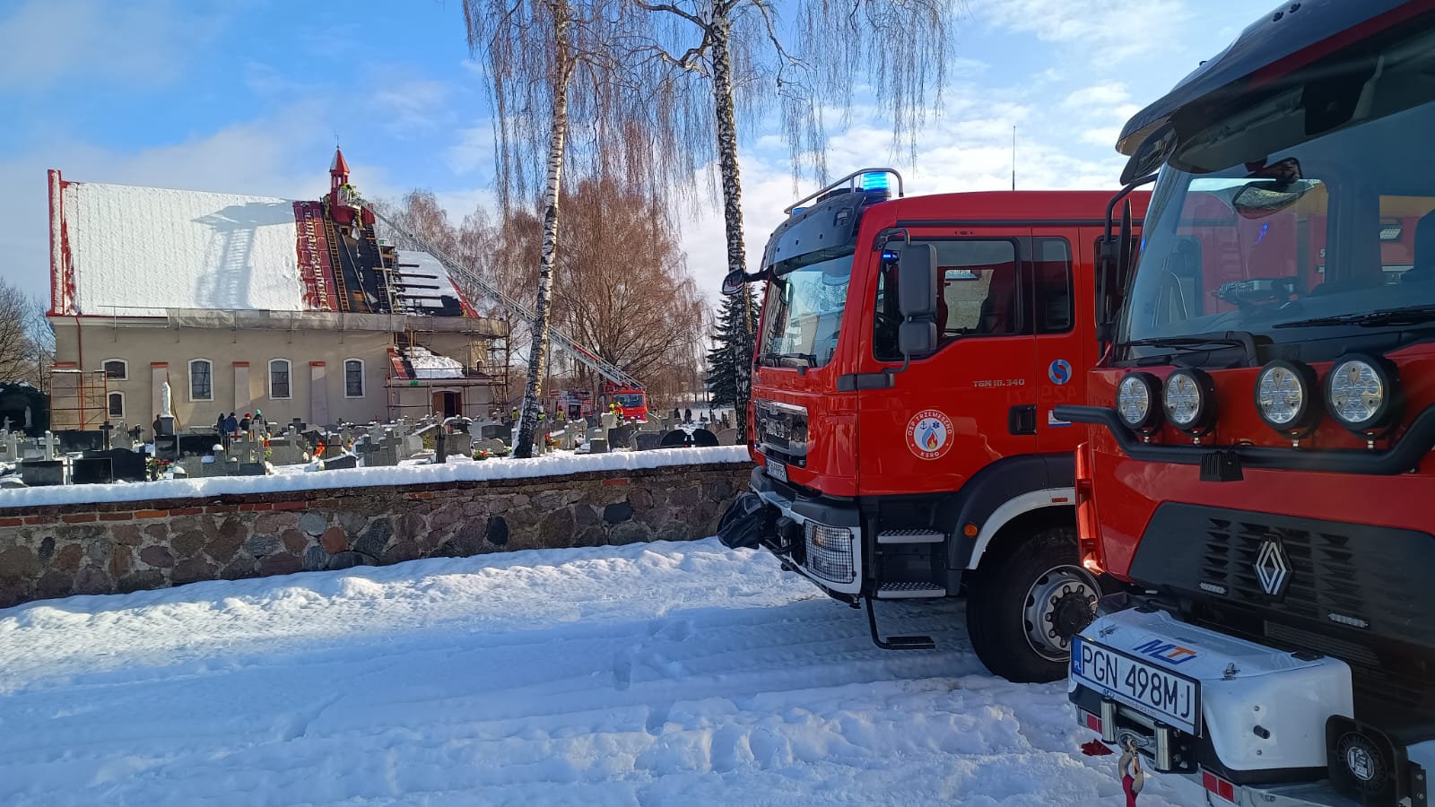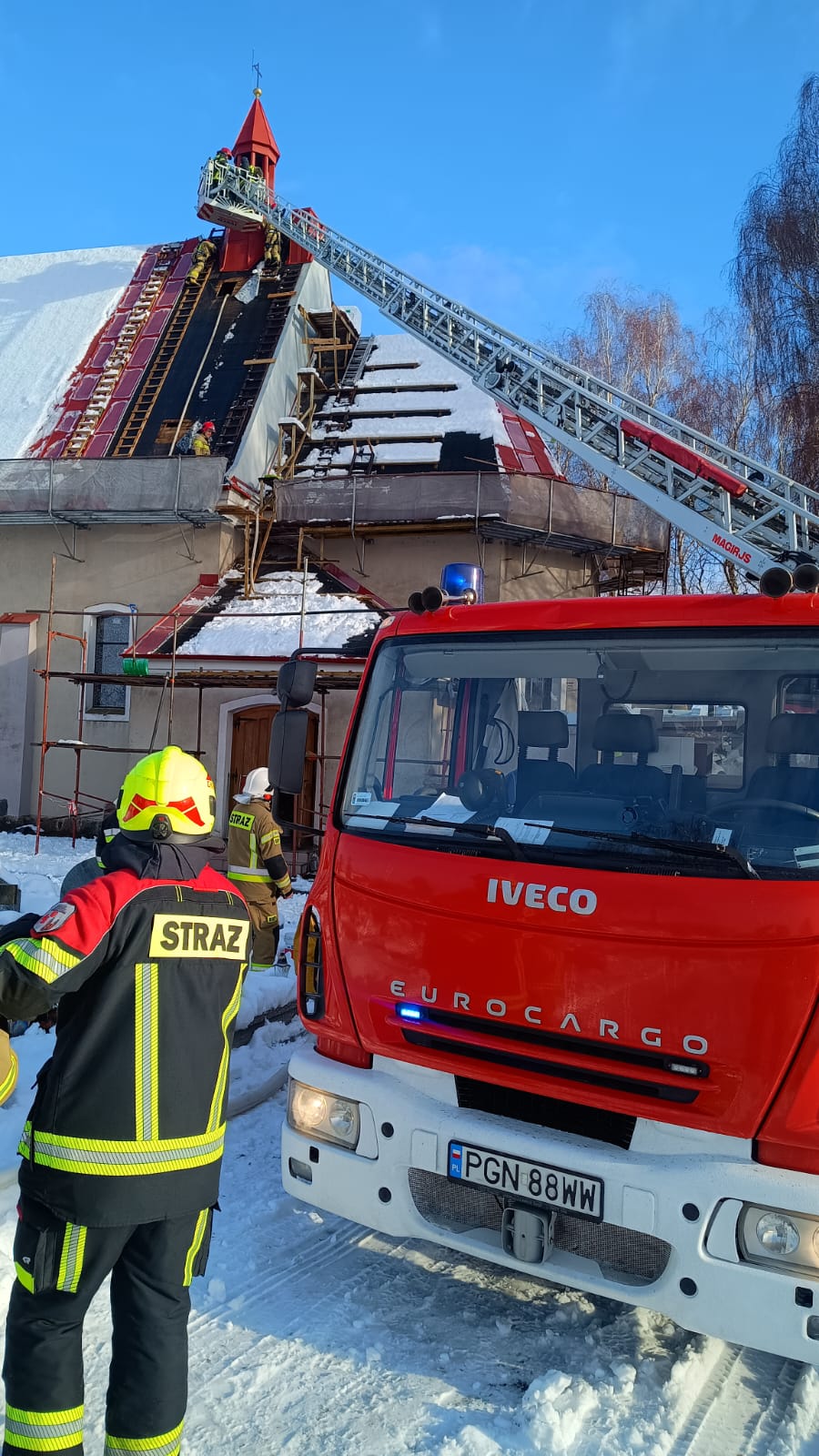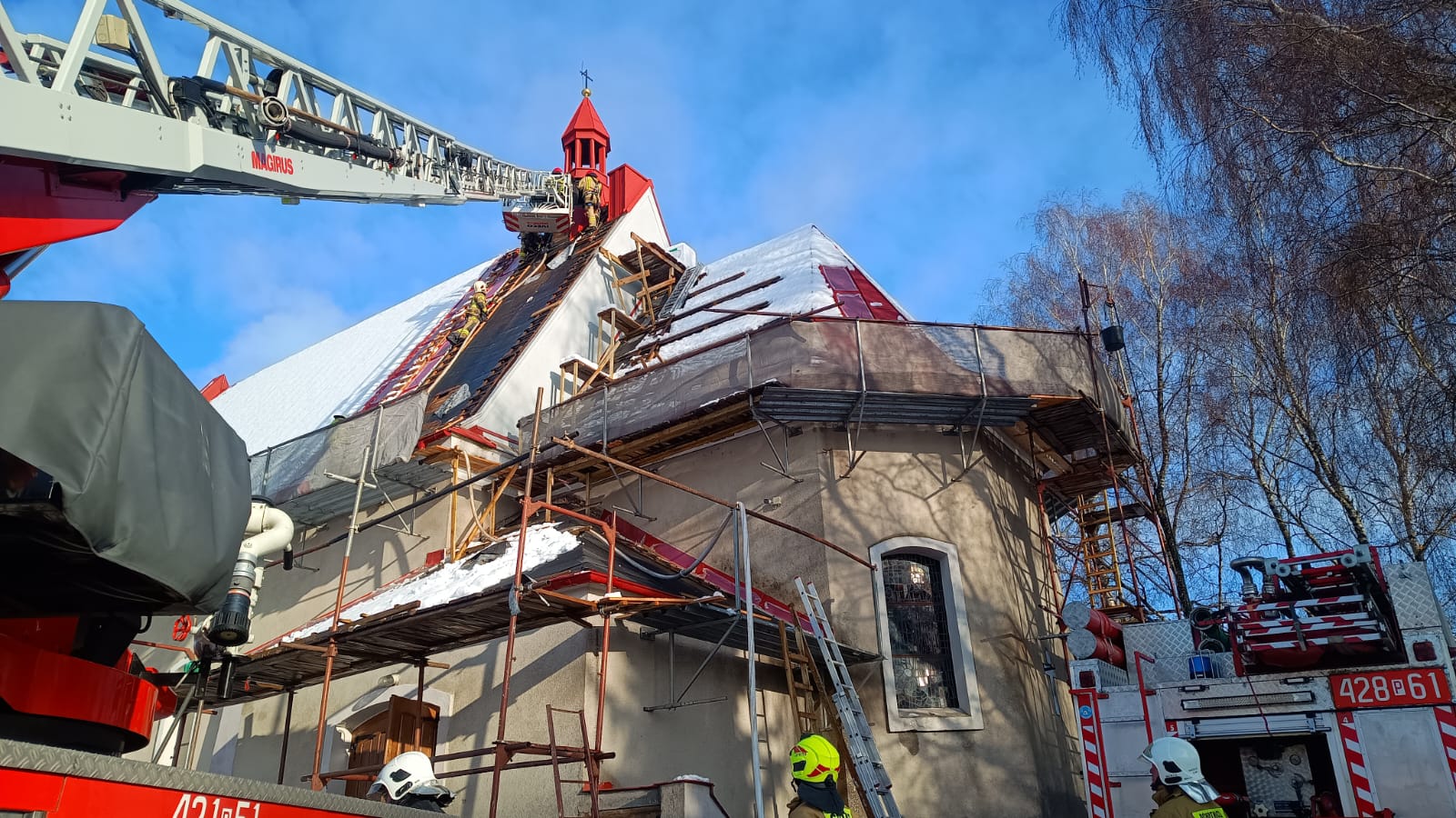 W pierwszej części akcji działania Straży Pożarnej polegały na zabezpieczeniu miejsca zdarzenia oraz zbudowaniu i wciągnięciu linii gaśniczej po rusztowaniu na dach kościoła. Następnie wykonano pilarką otwór w połaci dachu, przez który podano jeden prąd wody od wewnątrz celem ugaszenia pożaru. Po zlokalizowaniu i przygaszeniu pożaru przystąpiono do częściowej rozbiórki blachy z wieży w celu dojścia do ukrytych zarzewi ognia. Dalsze czynności strażaków skupiły się na usunięciu nadpalonych elementów konstrukcyjnych oraz dokładnym schłodzeniu i dogaszeniu wszystkich zarzewi ognia. Działania strażaków na wysokości prowadzone były z drabin przystawnych oraz z kosza drabiny mechanicznej. Dokładne okoliczności zdarzenia ustala Policja.