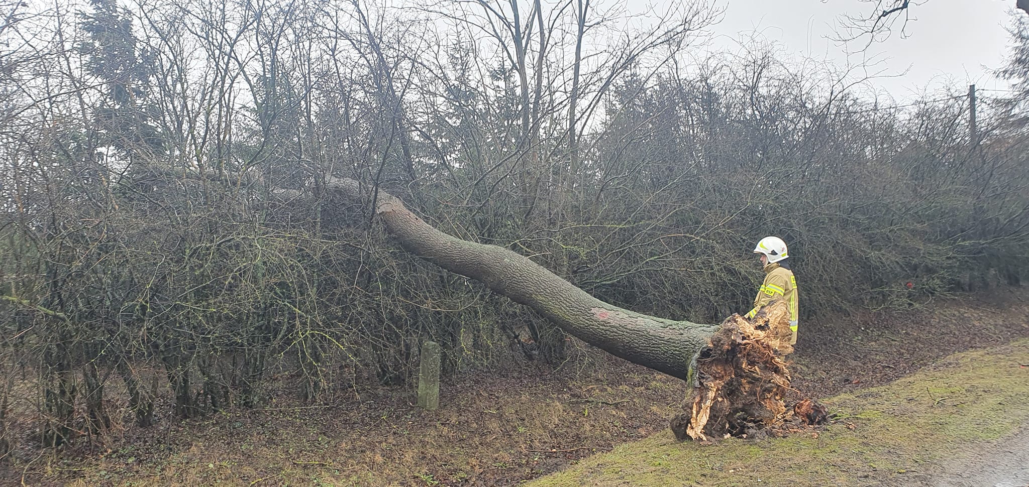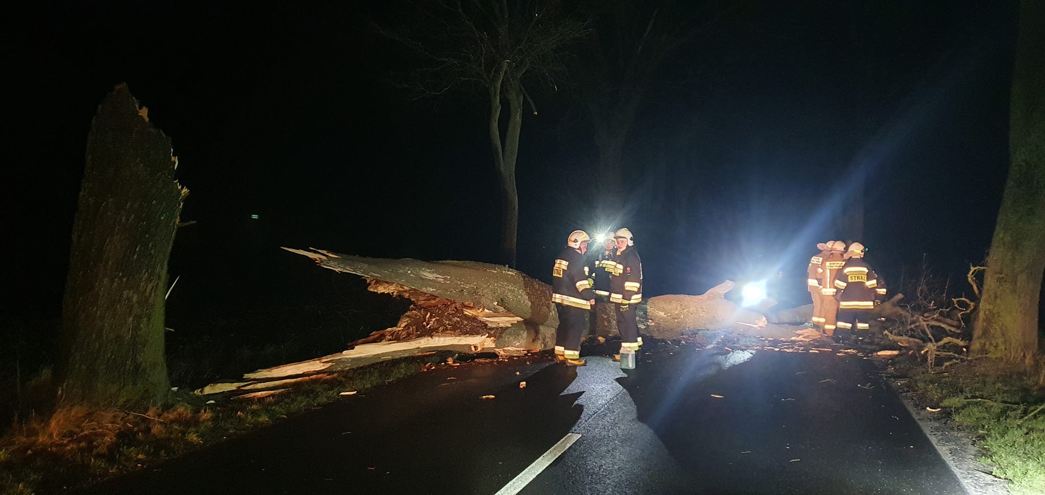 Do najbardziej niebezpiecznego zdarzenia doszło nad ranem w niedzielę 30 stycznia br. w miejscowości Kierzkowo (gm. Trzemeszno). W powalone na drodze gminnej drzewo wjechał samochód osobowy. Dwie osoby podróżujące pojazdem opuściły go przed przybyciem służb ratunkowych. Kierująca pojazdem wymagała udzielenia kwalifikowanej pierwszej pomocy. Dalsze działania polegały na zabezpieczeniu miejsca zdarzenia, odłączeniu zasilania w pojeździe. Po udzieleniu pomocy przystąpiono do usuwania powalonego drzewa oraz sorpcji płynów eksploatacyjnych. W wyniku zdarzenia jedna osoba została przetransportowana do szpitala przez Zespół Ratownictwa Medycznego. Na miejscu zdarzenia pracowały 3 zastępy strażaków: z Gniezna, Trzemeszna i Kruchowa. Na czas działań droga była całkowicie zablokowana.