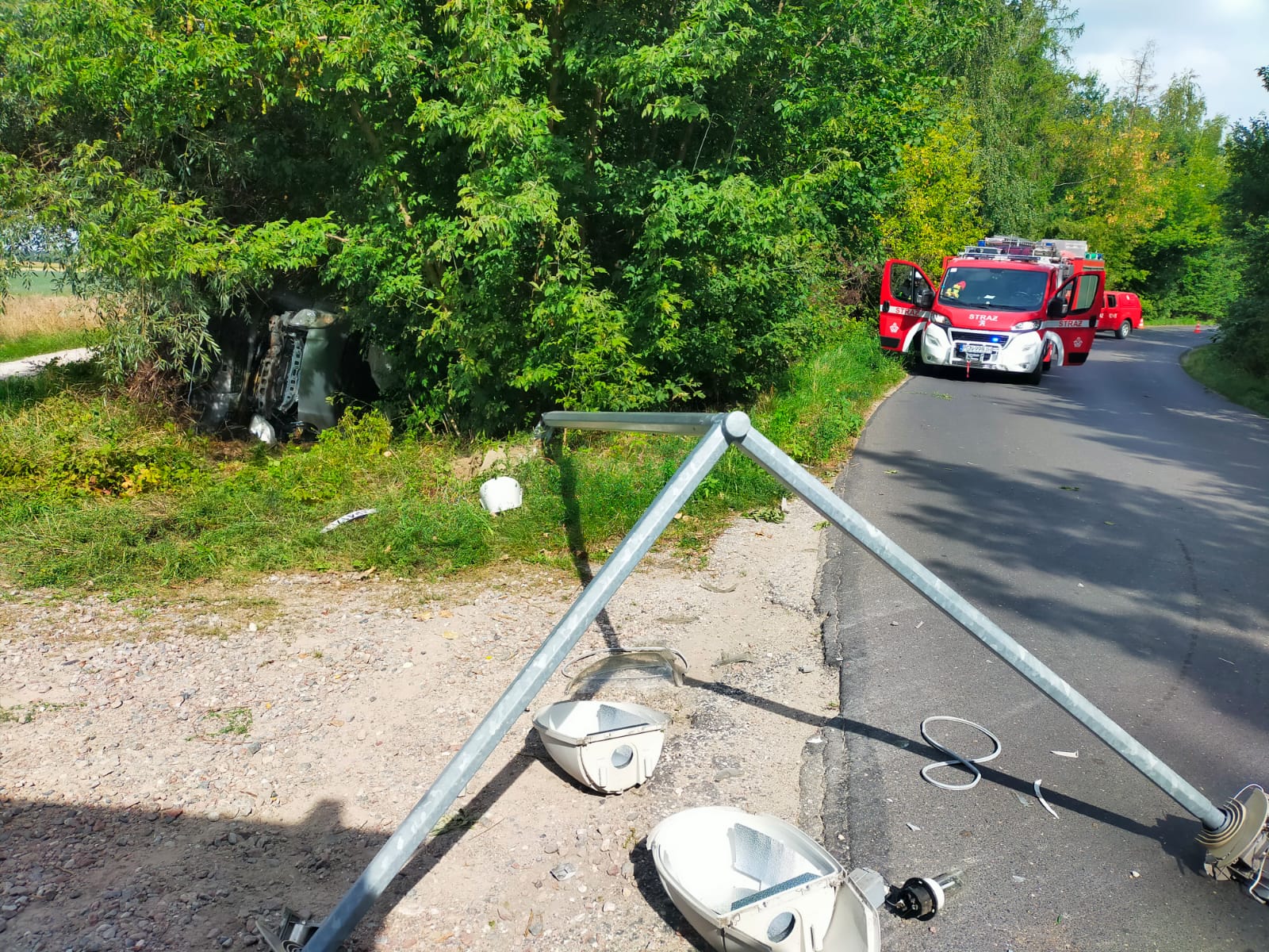 Działania Straży Pożarnej polegały na zabezpieczeniu miejsca zdarzenia, wykonaniu stabilizacji pojazdu oraz uwolnieniu kierującej poprzez otwarcie prawych drzwi. Przybyły na miejsce Zespół Ratownictwa Medycznego przebadał poszkodowaną, która nie wymagała dalszej hospitalizacji. W między czasie strażacy sprawdzili uszkodzoną lampę oświetleniową detektorem napięcia, który nie wykazywał zagrożenia. Na miejsce przybył również przedstawiciel ENEA, który potwierdził brak napięcia w uszkodzonej lamie. Na czas prowadzonych działań droga była całkowicie zablokowana. Dokładne okoliczności zdarzenia ustala Policja.