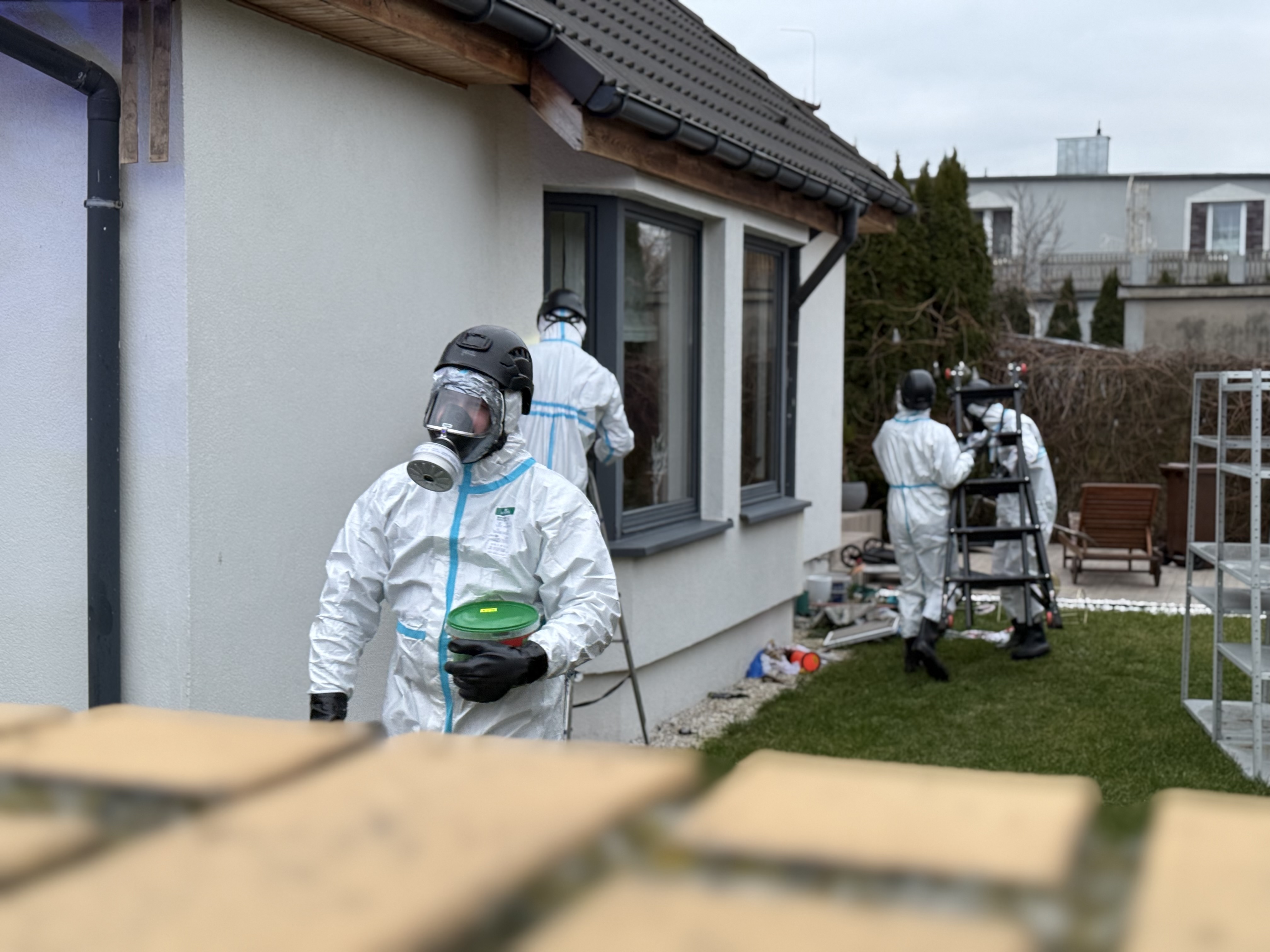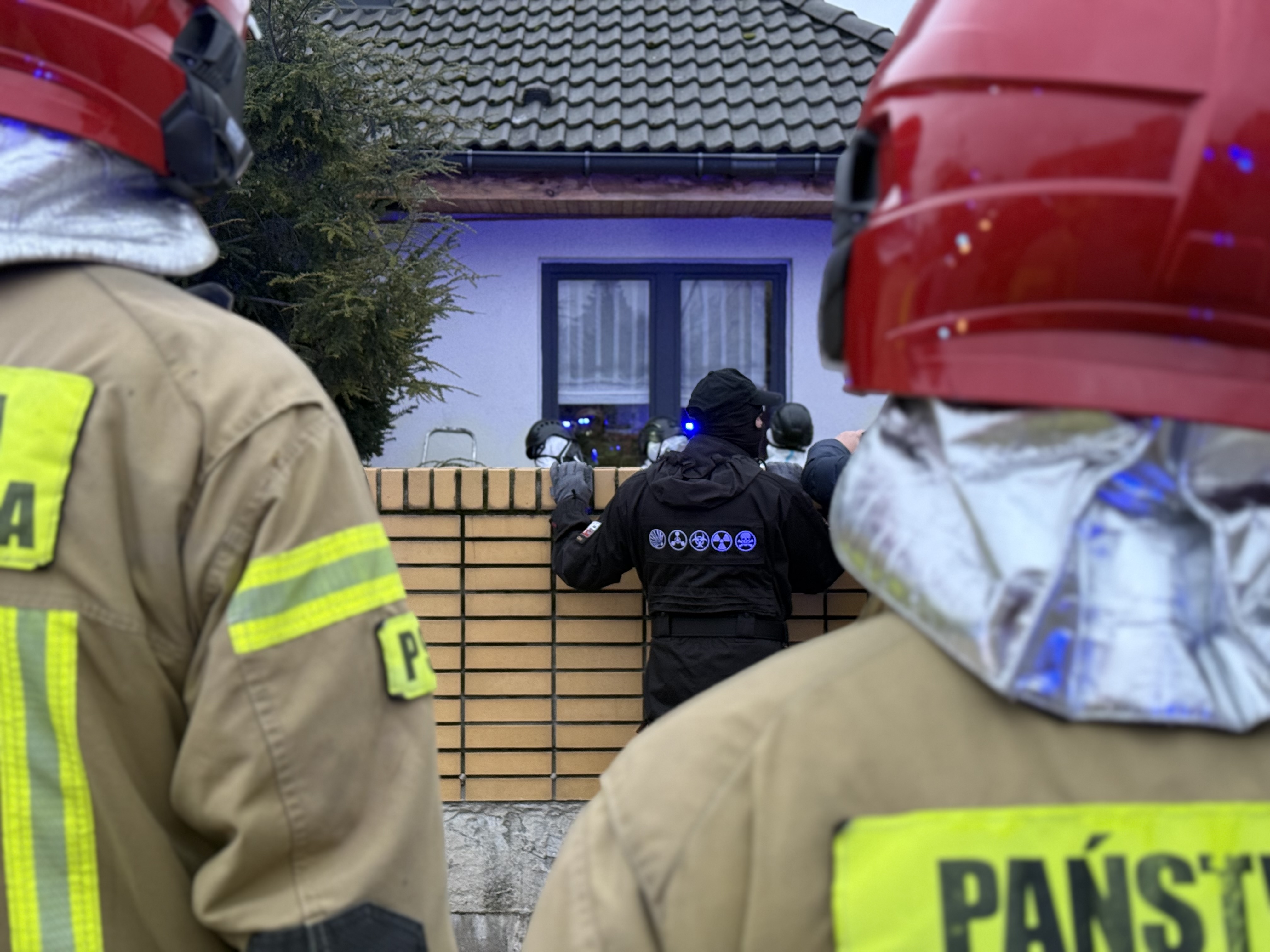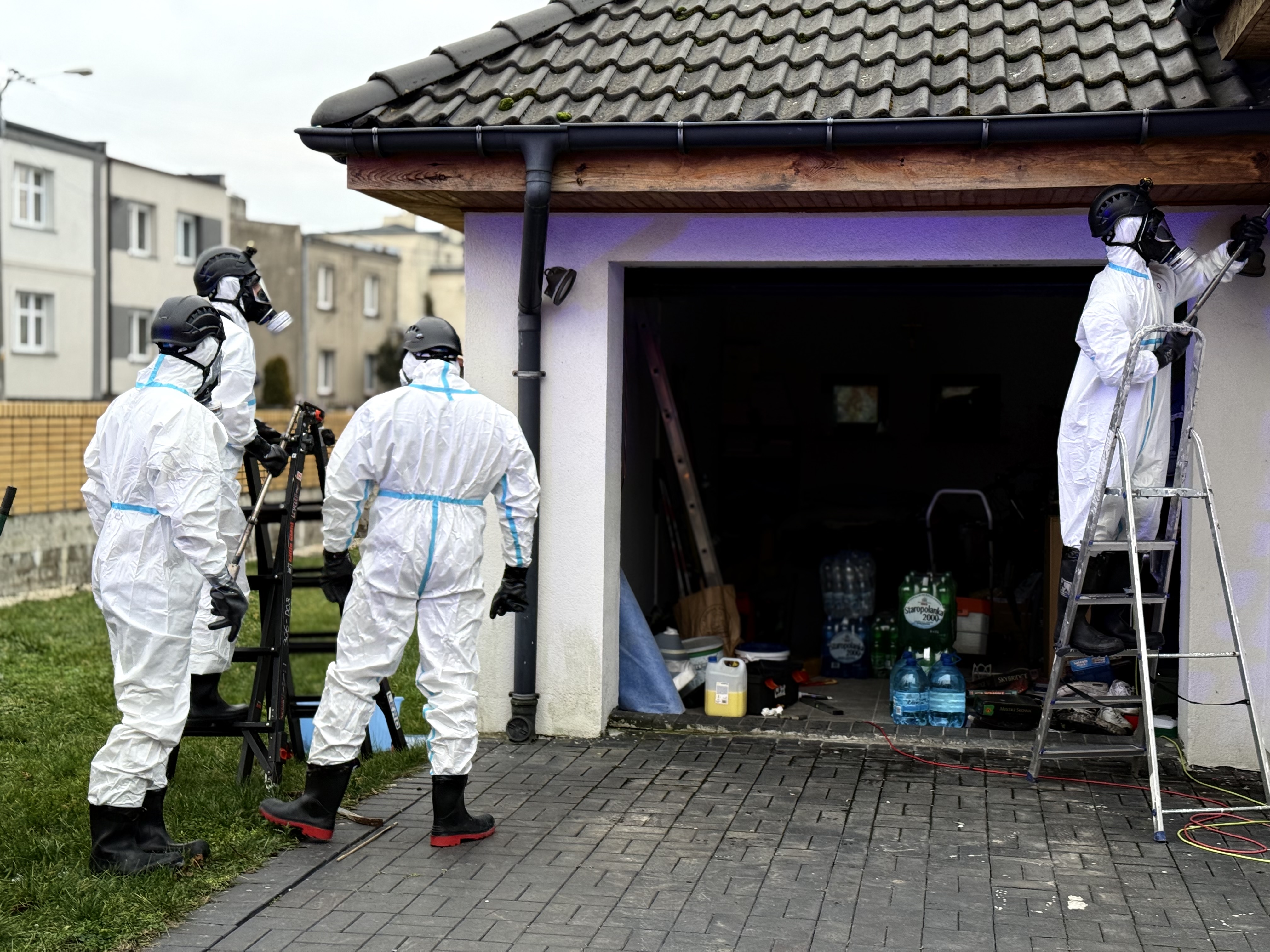 W pierwszej części akcji działania Straży Pożarnej polegały na zabezpieczeniu miejsca zdarzenia i przeprowadzeniu rozpoznania ratowniczego. W trakcie rozpoznania potwierdzono, że właściciel umieścił w boazerii dachowej dookoła budynku 16 szt. gąbek nasączonych substancją odstraszającą dzikie zwierzęta. Na miejscu obecny był Zespół Ratownictwa Medycznego, który przebadał wszystkich mieszkańców domu – żadna z trzech osób nie wymagała hospitalizacji. Dalsze działania polegały na przeprowadzeniu przez strażaków zabezpieczonych w aparaty ochrony dróg oddechowych wstępnych pomiarów w pomieszczeniach budynku - mierniki nie wskazywały zagrożenia jednakże z uwagi na specyficzny zapach unoszący się w całym domu na miejsce zdarzenia zadysponowano Specjalistyczną Grupę Ratownictwa Chemiczno-Ekologicznego z Poznania. Na czas prowadzonych działań ruch na ul. Matejki w rejonie działań został całkowicie zablokowany. Po przeprowadzeniu ponownych pomiarów „grupa chemiczna” zabezpieczona w specjalne kombinezony przystąpiła do częściowej rozbiórki podbitki i usunięcia nasączonych gąbek, które zabezpieczono w zamkniętym pojemniku. Po tych czynnościach ponownie przewietrzono cały dom – miernik nie wskazywał zagrożenia a w pomieszczeniach nie było czuć specyficznego zapachu. Na miejscu obecna była również Policja.