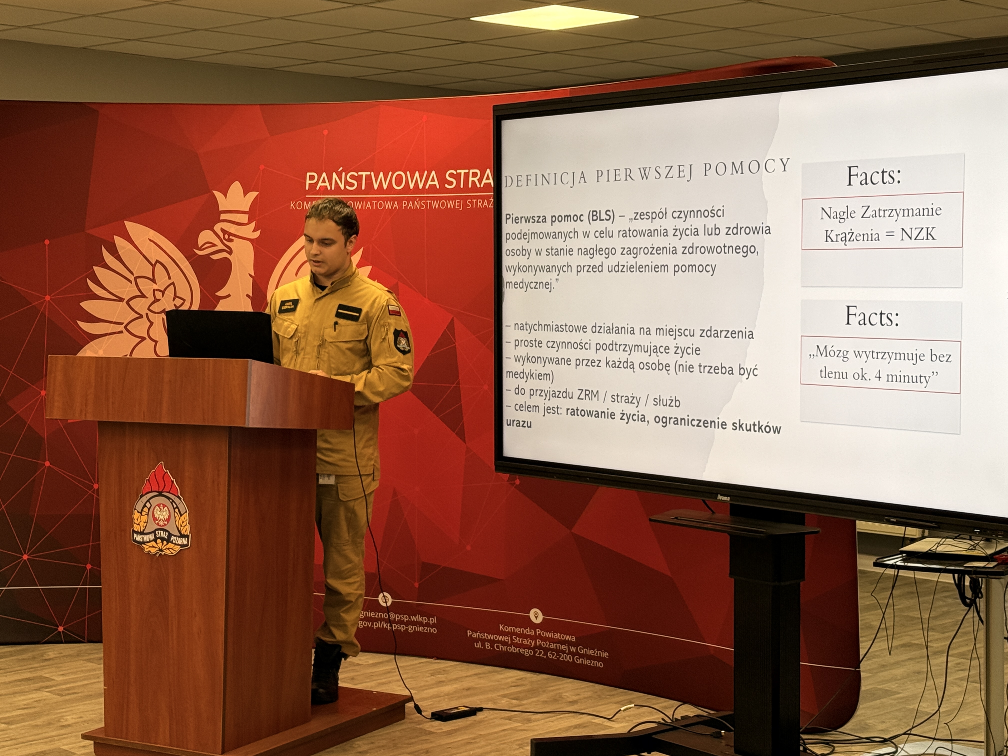 Zajęcia miały na celu podniesienie świadomości oraz praktycznych umiejętności w zakresie reagowania podczas nagłych zdarzeń. Spotkanie poprowadzili: st. str. Kamil Gierałka oraz mł. ogn. Marcin Wankowski, funkcjonariusze KP PSP w Gnieźnie, którzy poza codzienną służbą wykorzystują swoje doświadczenie ratownicze do prowadzenia szkoleń z pierwszej pomocy.