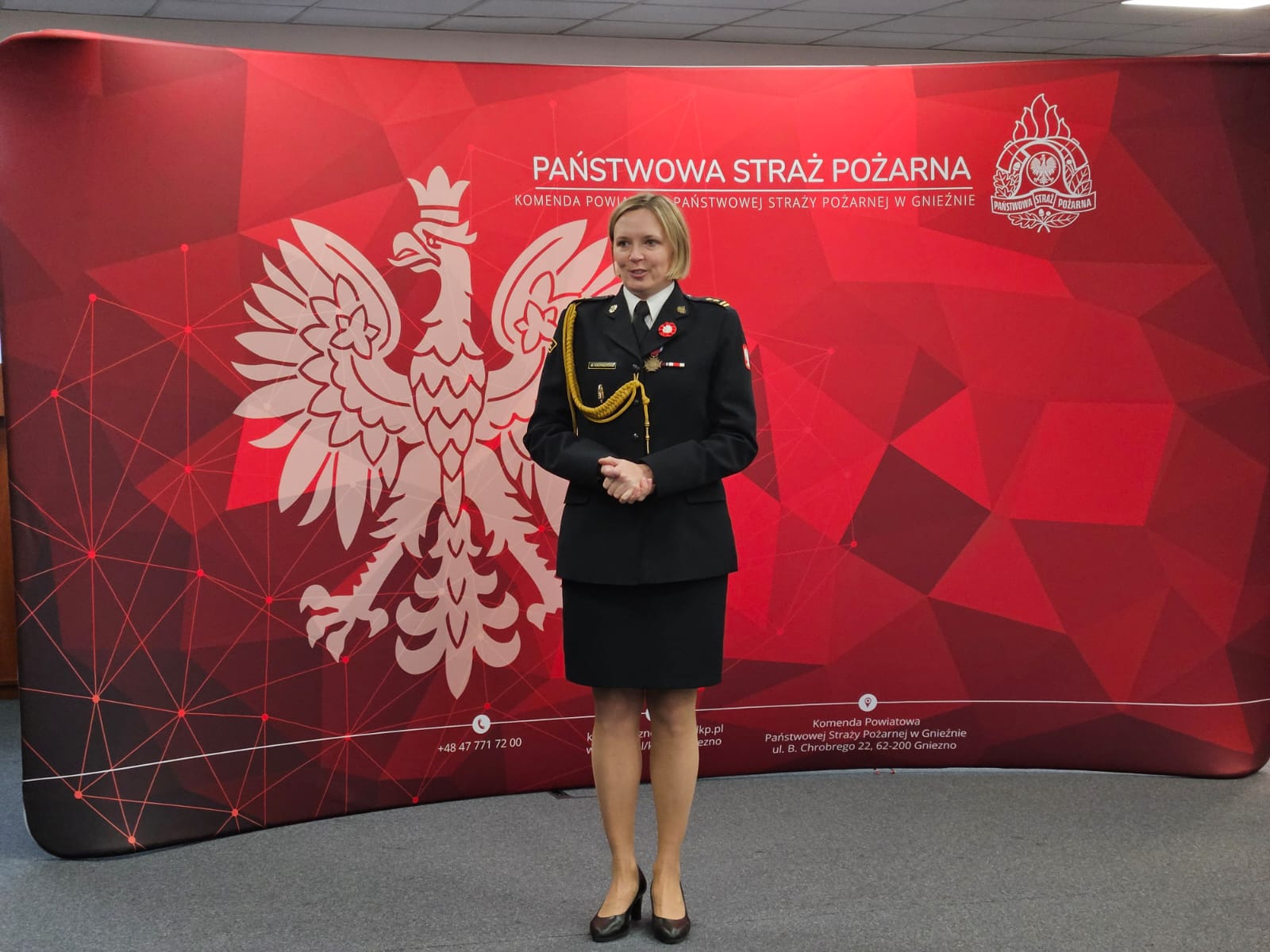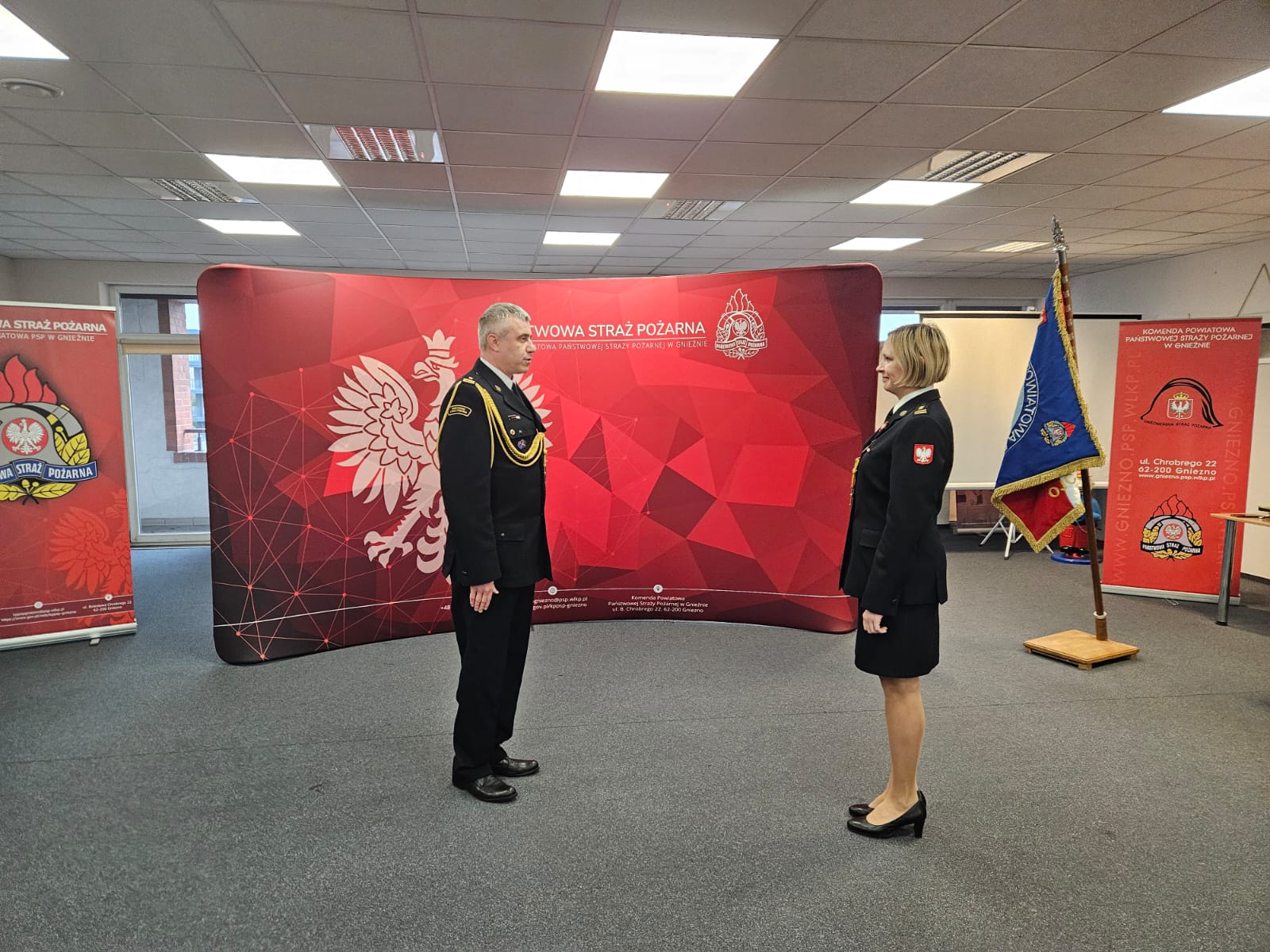 Uroczystość rozpoczęła się od złożenia meldunku przez dowódcę uroczystości mł. bryg. Jarosława Łagutoczkina Komendantowi Powiatowemu Państwowej Straży Pożarnej w Gnieźnie bryg. Marcie Kacprzyckiej oraz odśpiewania hymnu państwowego.