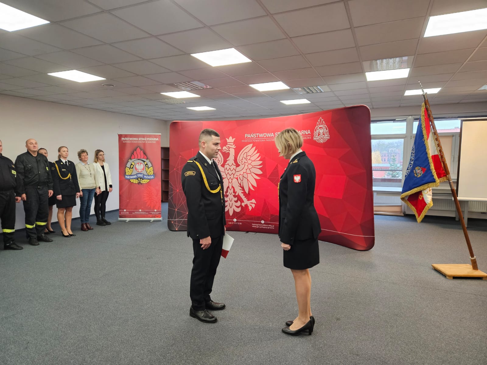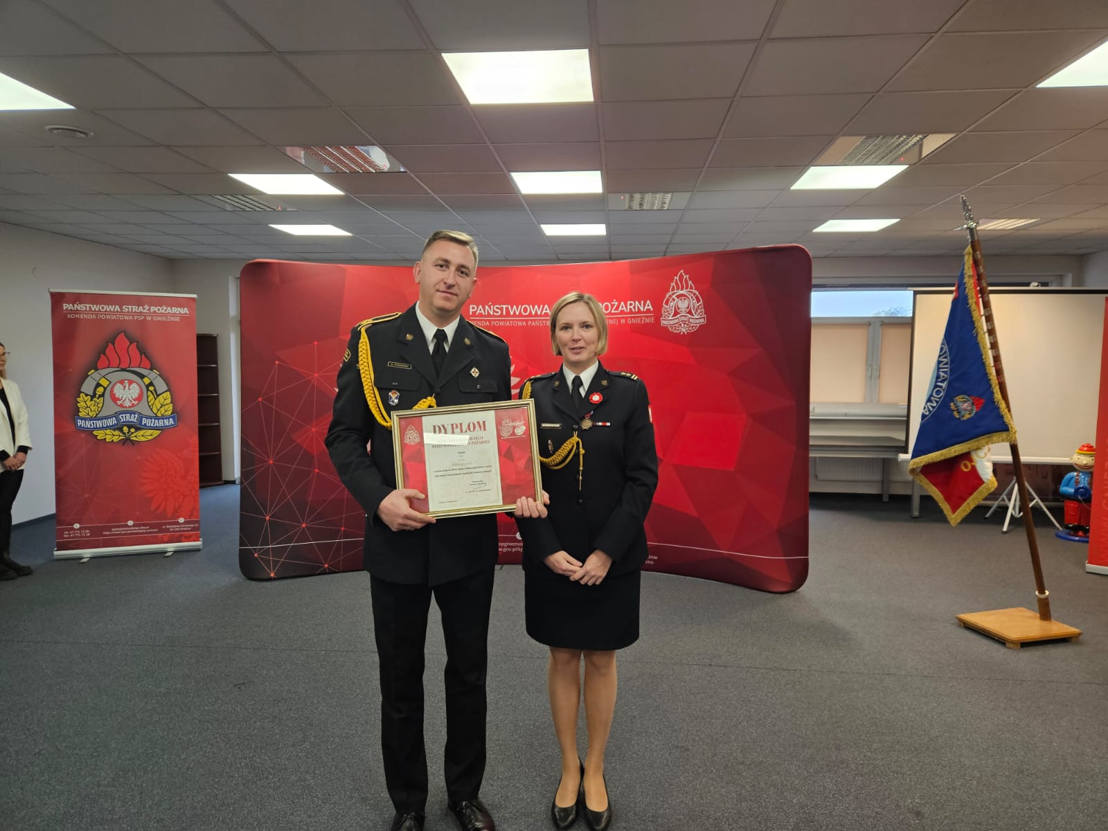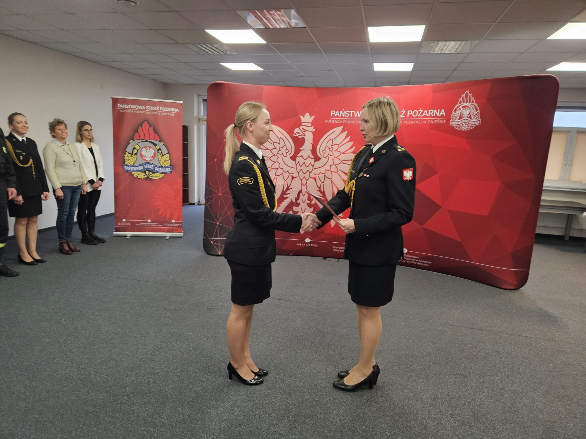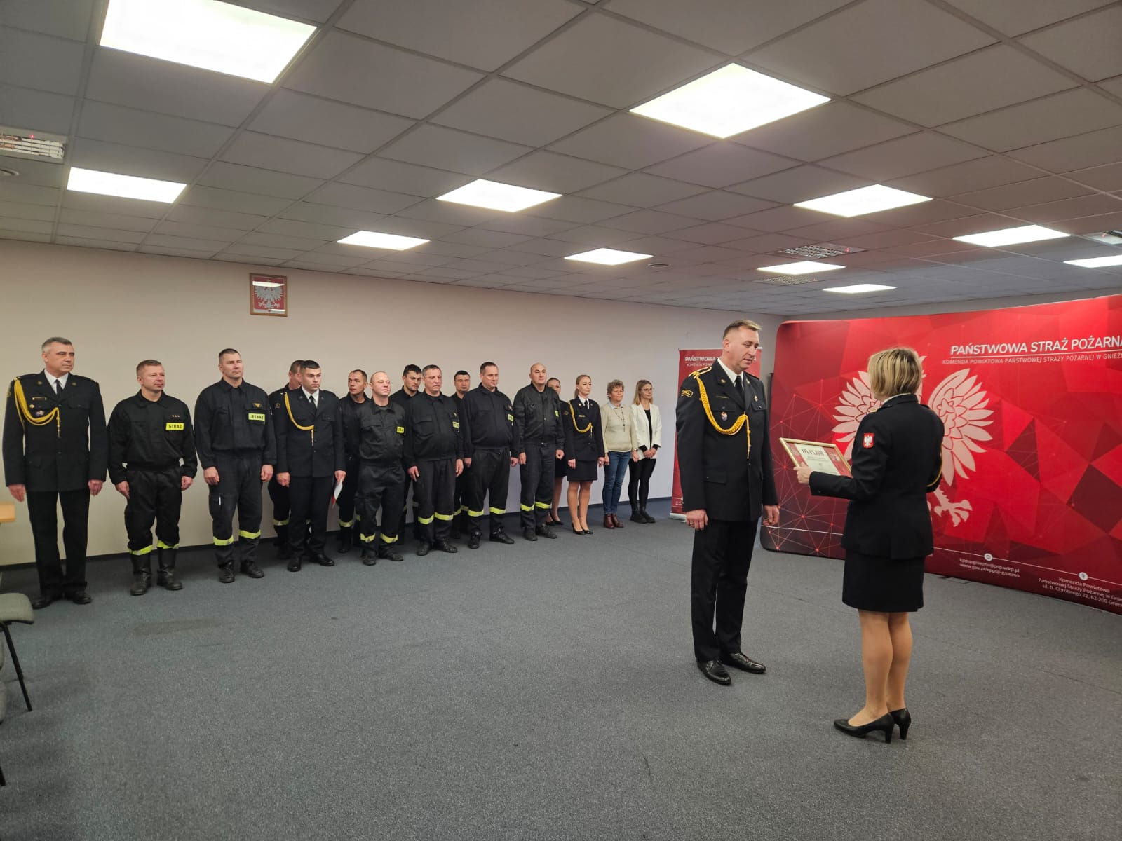 Podczas uroczystej zbiórki bryg. Marta Kacprzycka wręczyła awans na stopień starszego strażaka str. Maciejowi Kołodziejczakowi. Następnie wręczone zostały wyróżnienia. W uznaniu zasług za ofiarną służbę Dyplom Komendanta Głównego Państwowej Straży Pożarnej otrzymał mł.asp. Mateusz Gronowski, natomiast Wielkopolski Komendant Wojewódzki Państwowej Straży Pożarnej przyznał nagrody uznaniowe ogn. Tomaszowi Pakulskiemu oraz sekc. Kamili Kozłowskiej.