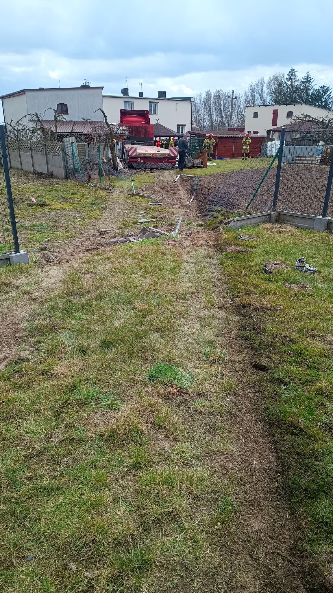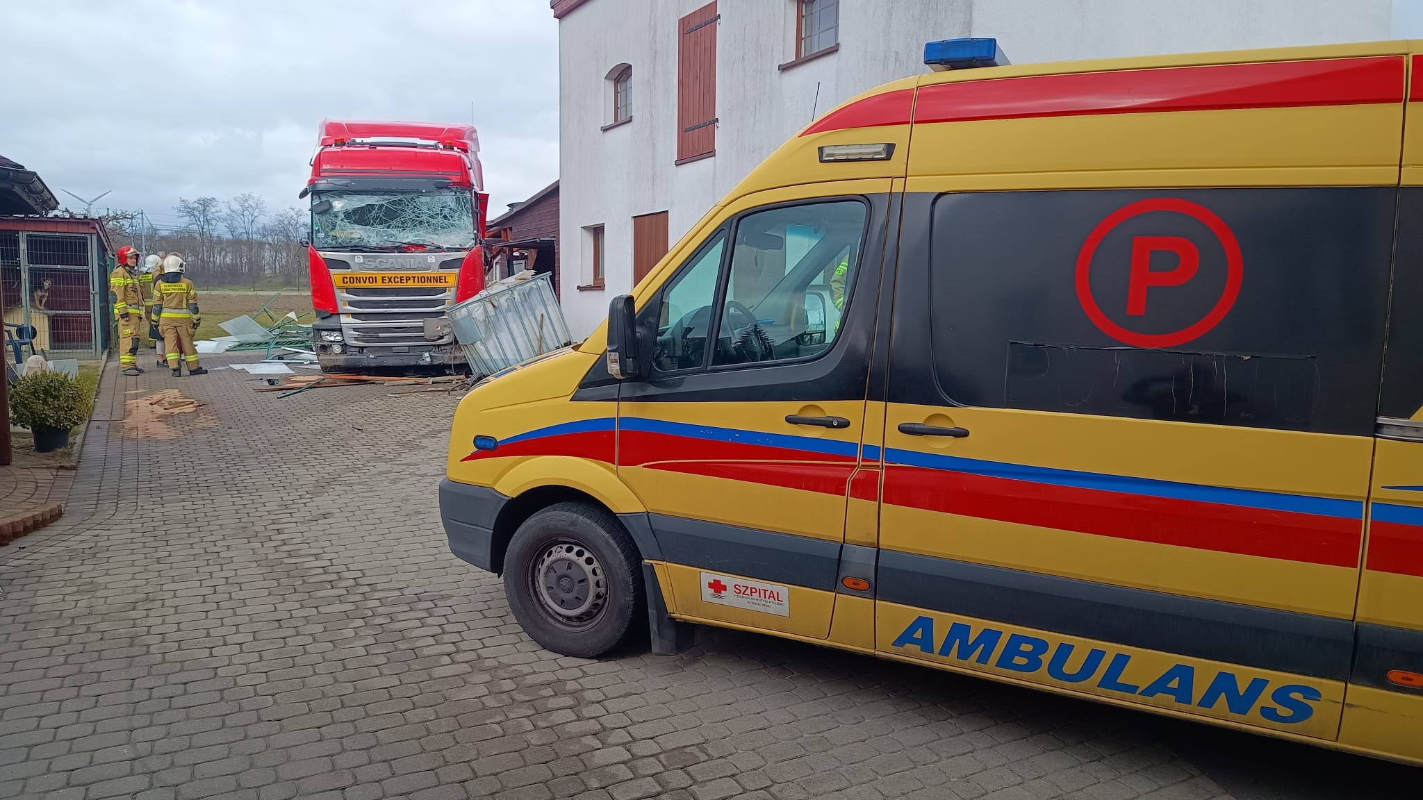 Działania Straży Pożarnej polegały na zabezpieczeniu miejsca zdarzenia, następnie strażacy przy użyciu łomu otworzyli drzwi pasażera, przez które kierowca opuścił samodzielnie pojazd. Nie doznał on żadnych obrażeń ale nie pamiętał samego zdarzenia. Strażacy udzielili poszkodowanemu kierowcy kwalifikowanej pierwszej pomocy do czasu przyjazdu Zespołu Ratownictwa Medycznego. Po przebadaniu go przez ratowników medycznych został on przetransportowany karetką na SOR. W międzyczasie strażacy zatamowali wyciek paliwa z uszkodzonego baku samochodu ciężarowego oraz zebrali rozlany olej napędowy przy użyciu sorbentu. Na miejsce zdarzenia przyjechał również holownik, który wyciągnął TIRa z prywatnej posesji i odholował na parking. Dokładne okoliczności zdarzenia ustala Policja.