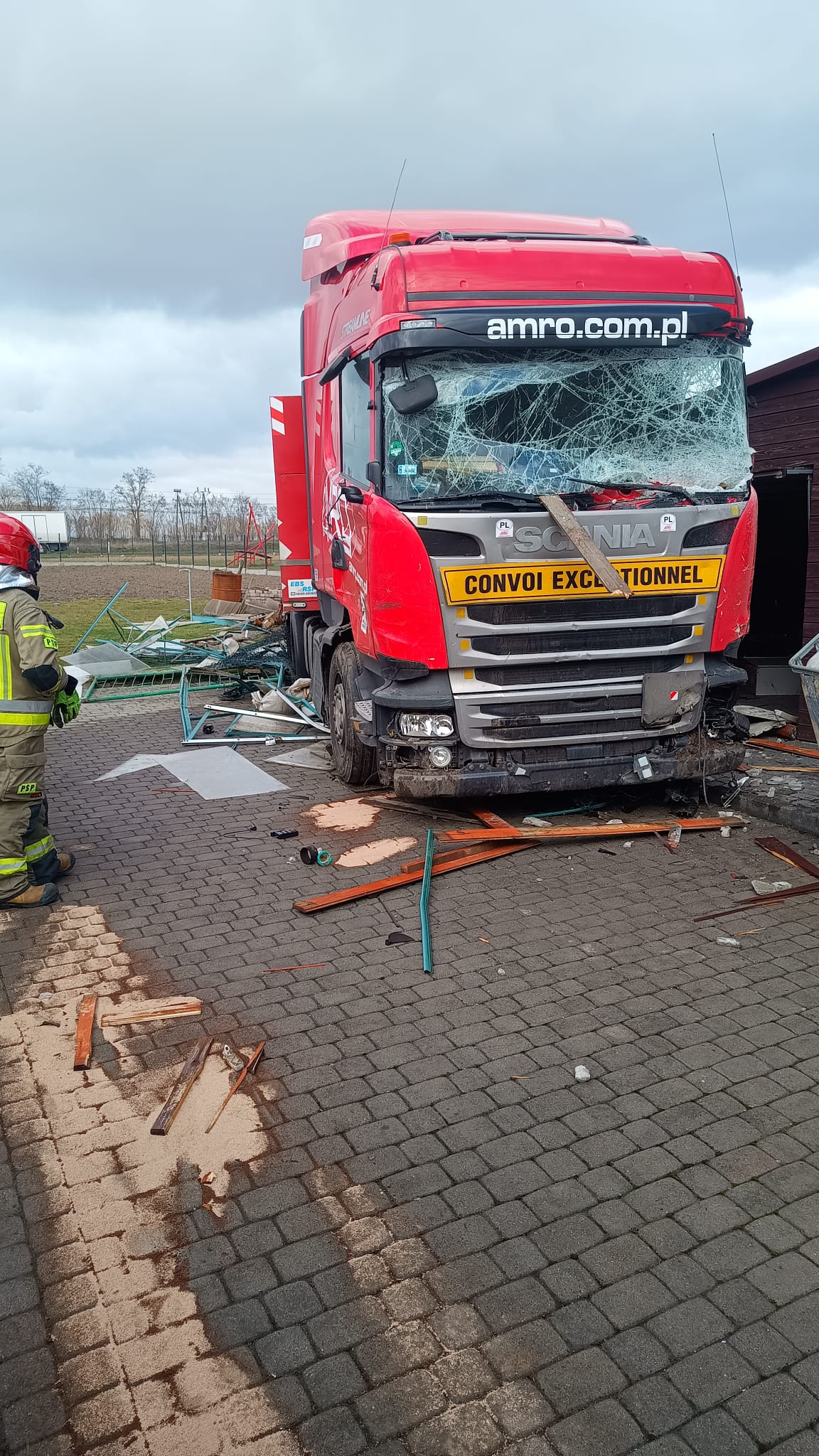 Po przybyciu na miejsce zdarzenia pierwszego zastępu Straży Pożarnej zastano TIRa (ciągnik siodłowy z otwartą naczepą) bez ładunku, który wjechał w drewniany garaż na prywatnej posesji. Kierowca pojazdu z nieustalonych przyczyn zjechał z drogi krajowej nr 15, przejechał przez plac zabaw uszkadzając ogrodzenie i wjechał na prywatną posesję również taranując ogrodzenie i zatrzymując się na drewnianym garażu (kilkadziesiąt metrów od drogi krajowej). W pojeździe znajdował się kierowca, który był przytomny lecz nie mógł wydostać się na zewnątrz, gdyż drzwi samochodu były zablokowane.