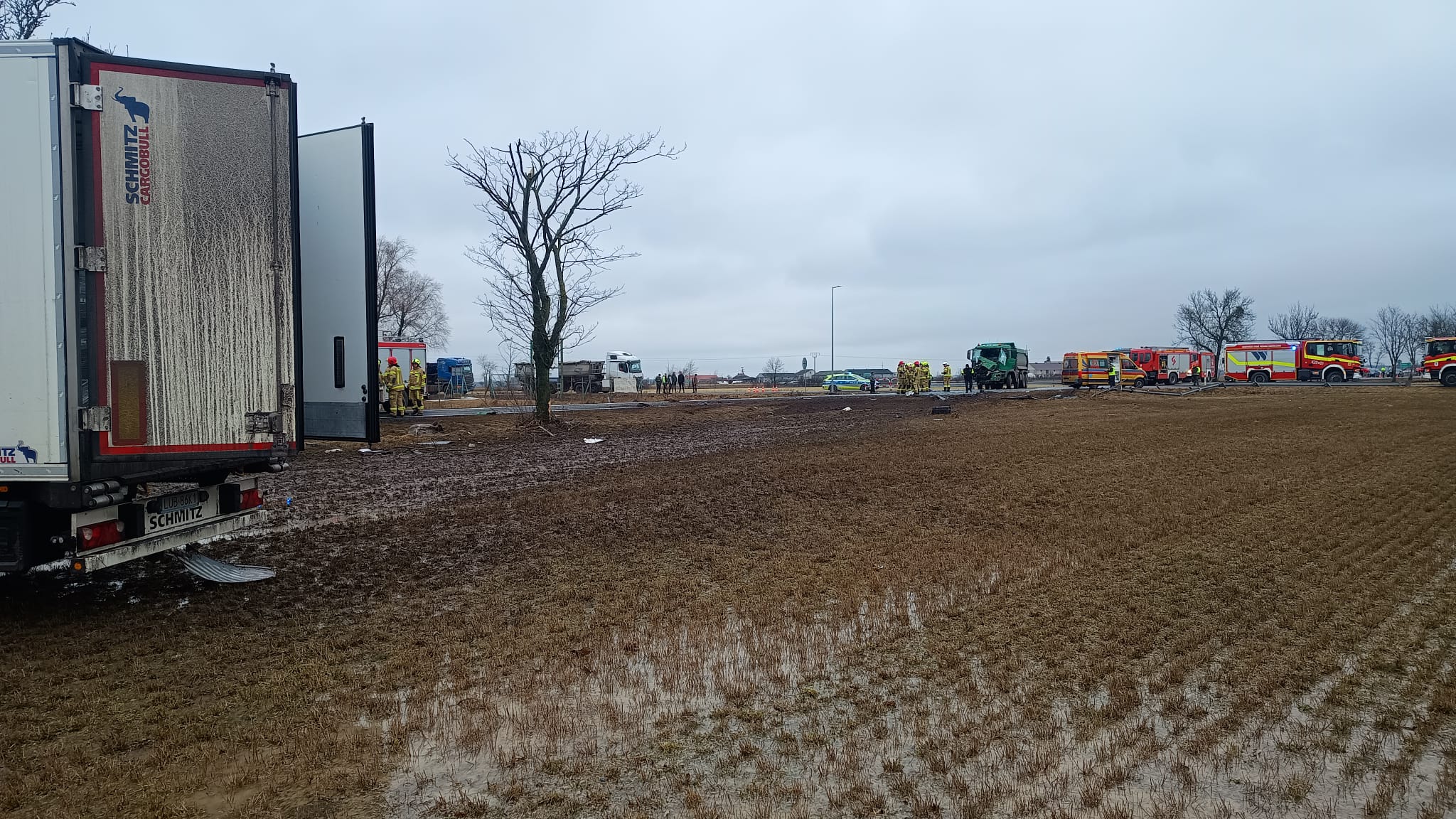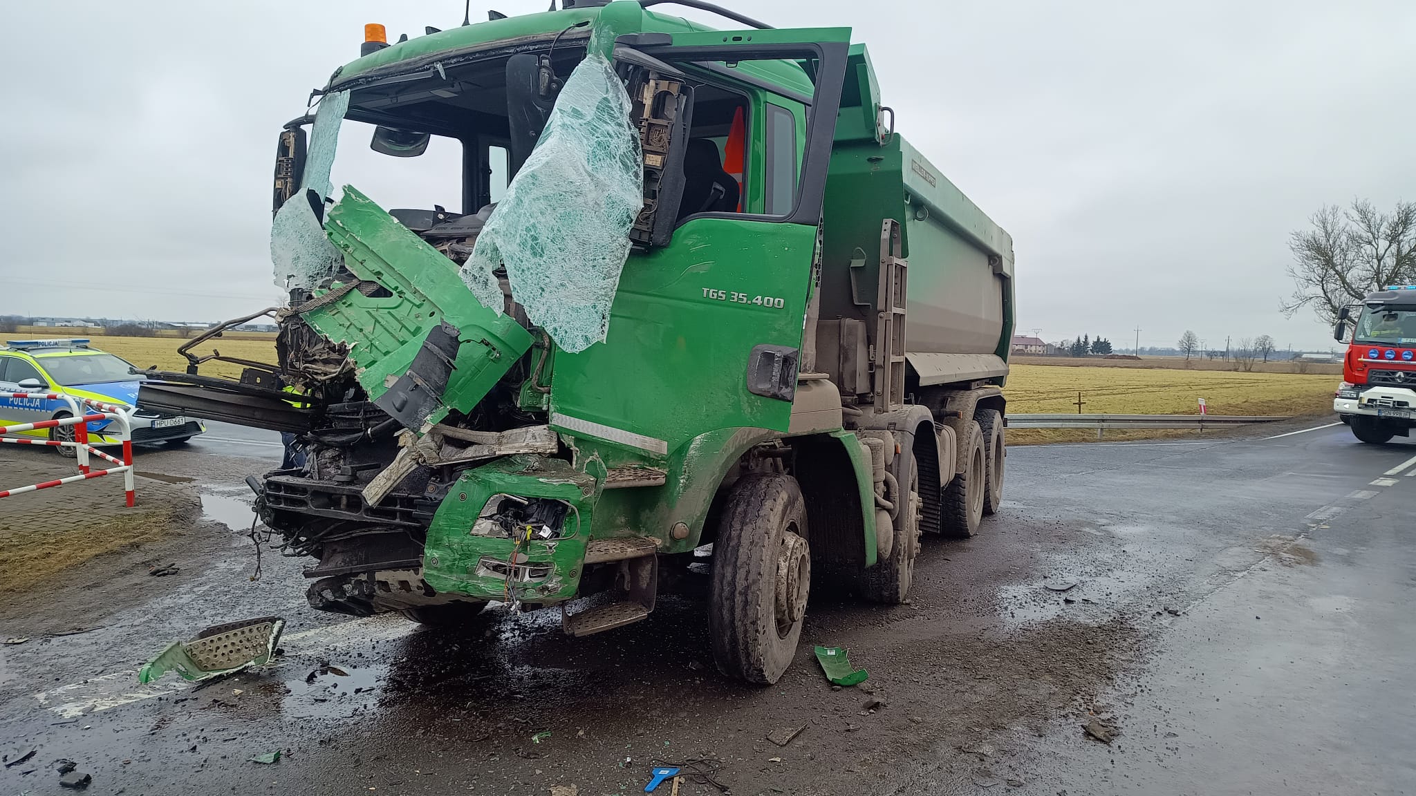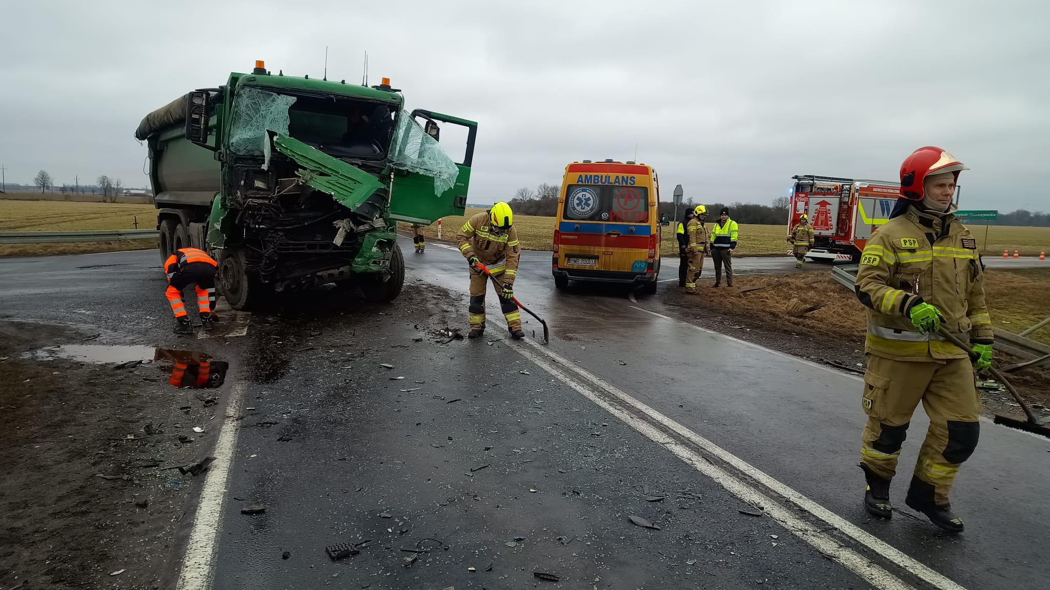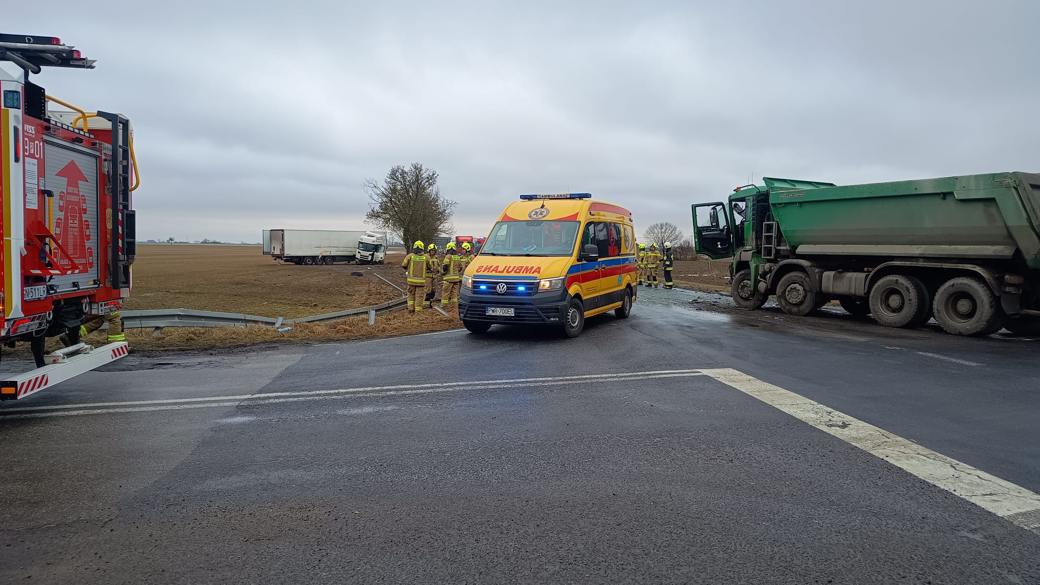 Po przybyciu na miejsce zdarzenia zastano wypadek dwóch samochodów ciężarowych (samochód typu "wanna" do przewozu materiałów sypkich oraz ciągnik siodłowy z naczepą). Jeden z pojazdów znajdował się na prawym pasie ruchu w kierunku na Wrześnie natomiast drugi pojazd (TIR) po zderzeniu zjechał na pobocze drogi taranując barierki energochłonne i zatrzymał się na przydrożnym polu. Na miejscu obecna była karetka transportowa, która najechała na wypadek. Kierowcy opuścili swoje auta przed przybyciem Straży Pożarnej. Jeden z kierowców znajdował się w karetce i był opatrywany przez ratowników medycznych, natomiast drugi kierowca nie zgłaszał żadnych dolegliwości. Droga została całkowicie zablokowana.