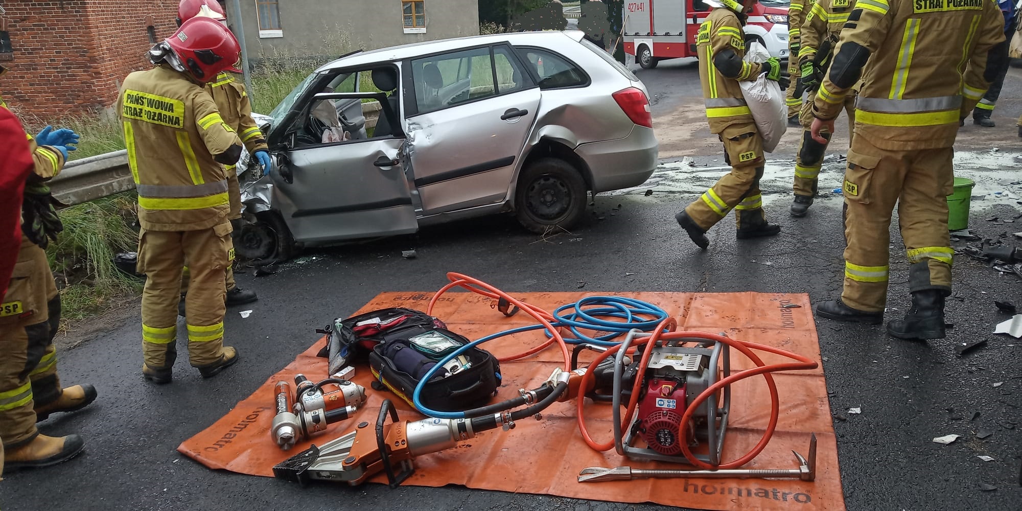 Działania Straży Pożarnej polegały na zabezpieczeniu miejsca zdarzenia oraz uwolnieniu poszkodowanego kierowcy z pojazdu przy użyciu narzędzi hydraulicznych. Następnie strażacy udzielili poszkodowanemu kwalifikowanej pierwszej pomocy a po przybyciu Zespołu Ratownictwa Medycznego został on przekazany ratownikom medycznym. Dalsze działania polegały na sorpcji rozlanych płynów eksploatacyjnych oraz usunięciu z jezdni rozbitych elementów karoserii. Na czas prowadzenia działań ruch odbywał się z utrudnieniami. Dokładne okoliczności zdarzenia ustala Policja.