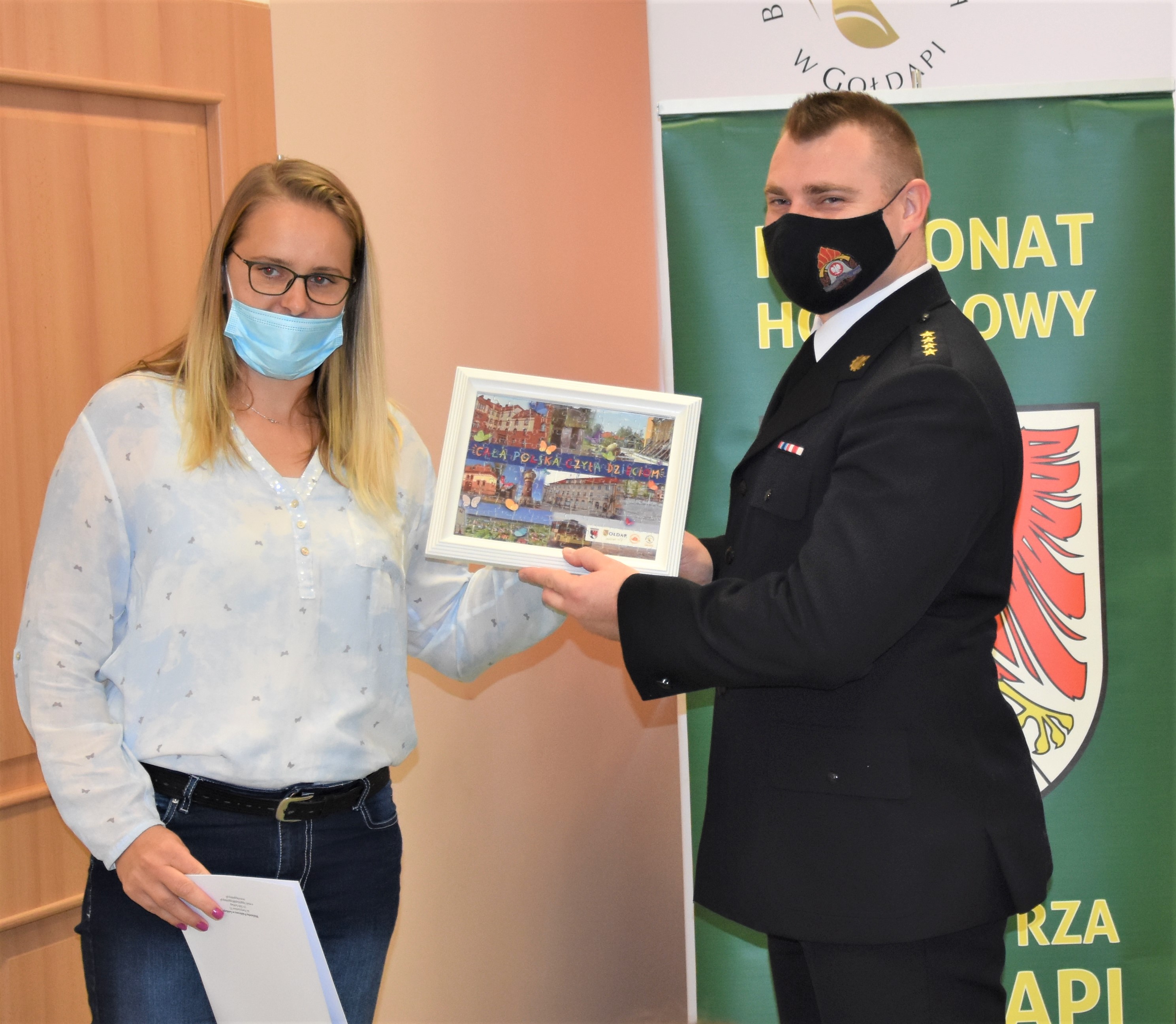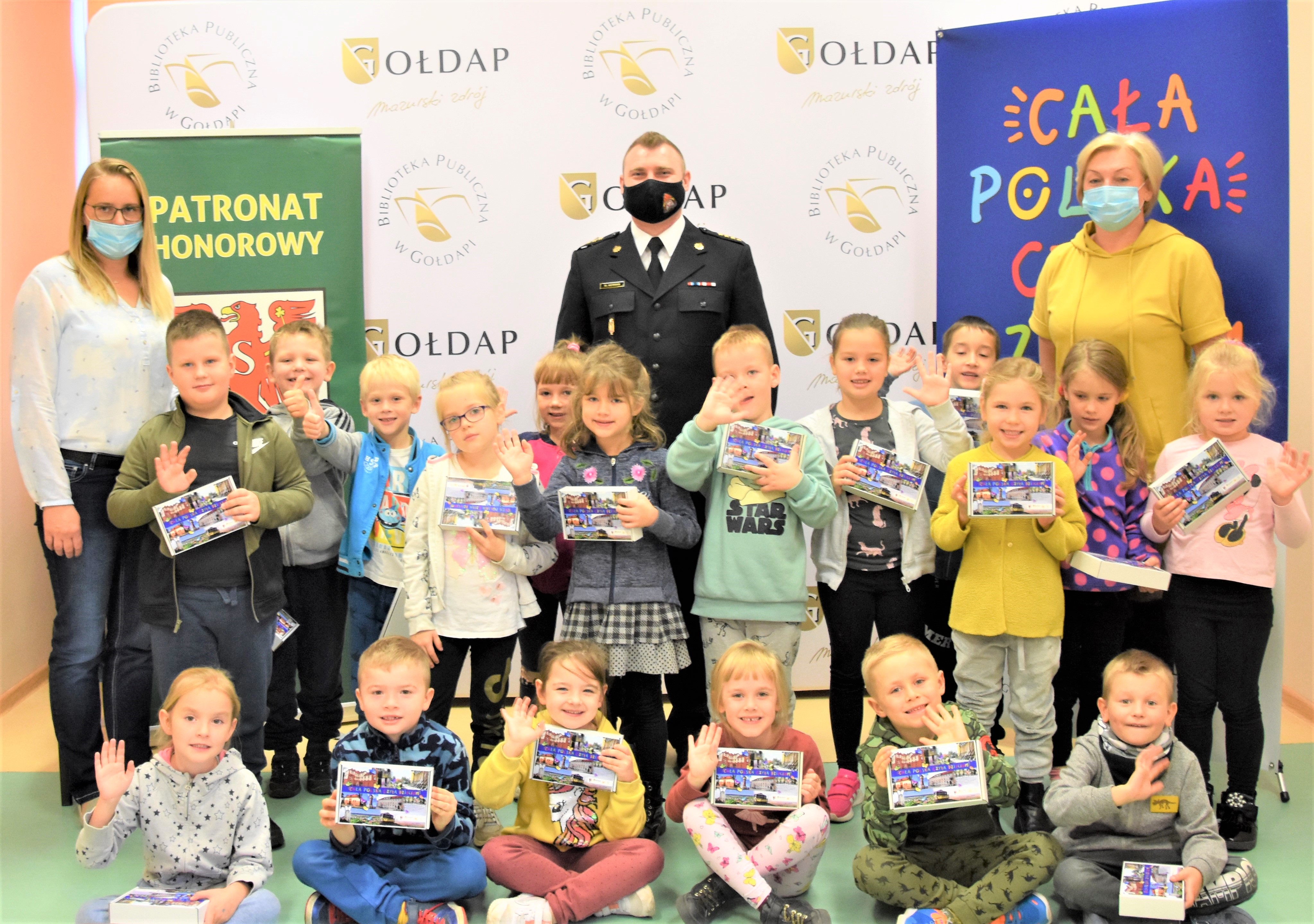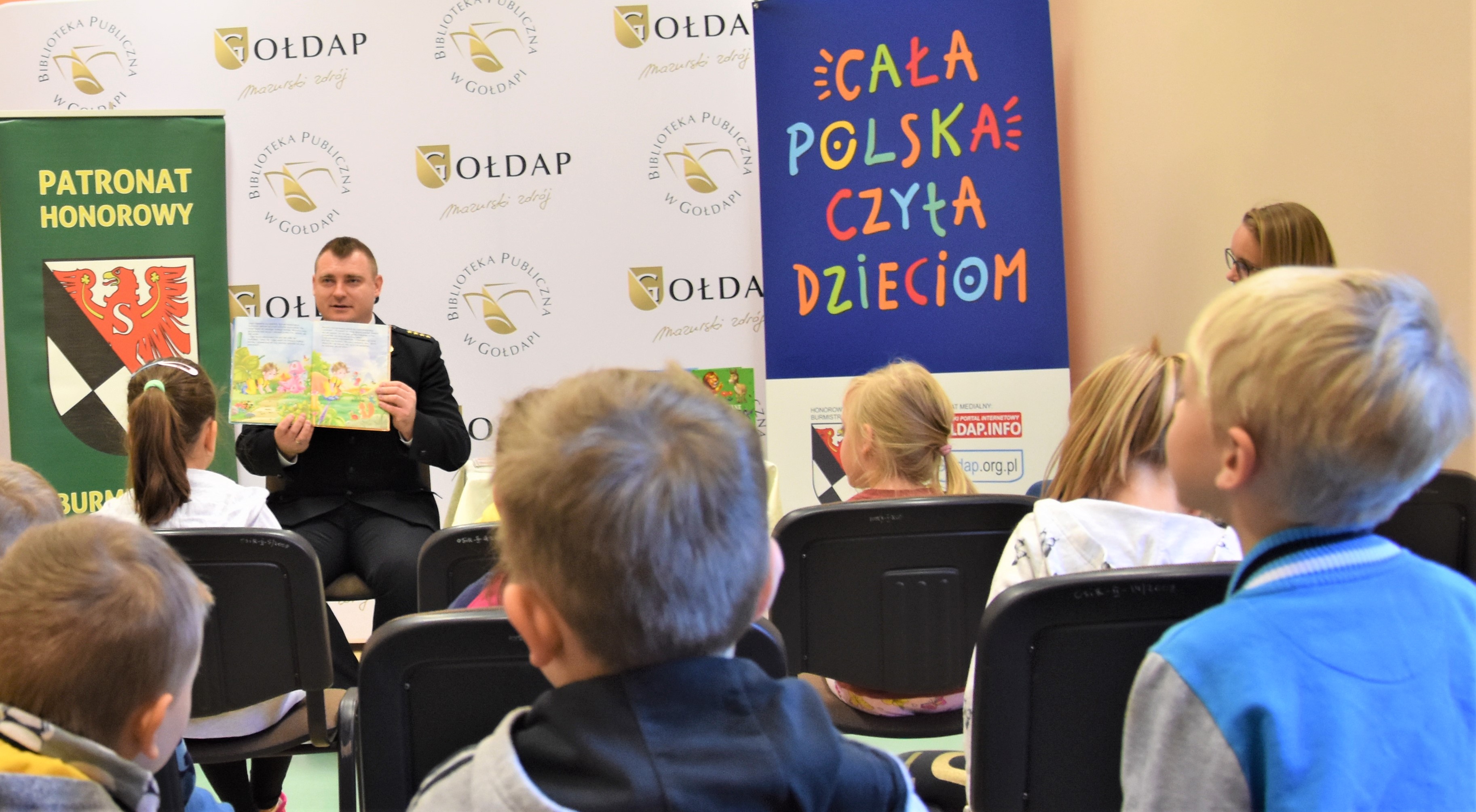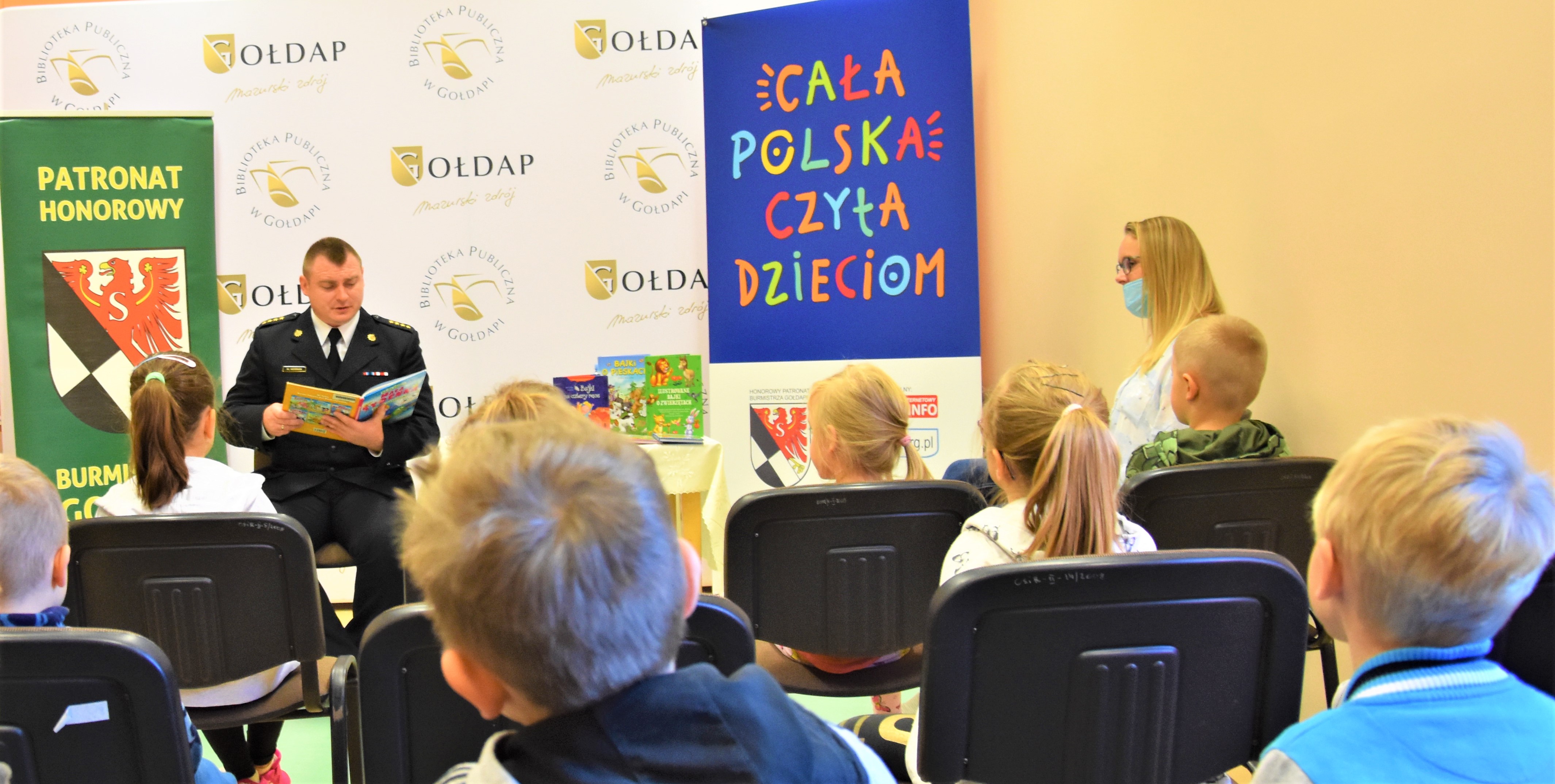 8 października 2021 roku na zaproszenie Biblioteki Publicznej w Gołdapi st. kpt. Michał Herman, funkcjonariusz Komendy Powiatowej Państwowej Straży Pożarnej w Gołdapi, przeczytał fragmenty książek dla dzieci w ramach kampanii społecznej „Cała Polska czyta dzieciom”. Po lekturze zaznajomiono dziecięcą publiczność z tajnikami pracy strażaka oraz co zrobić, aby nim zostać. Wiernymi słuchaczami byli uczniowie klasy 0 „C” ze Szkoły Podstawowej nr 3 im. Tadeusza Kościuszki w Gołdapi. Po przeczytaniu bajek, każde dziecko otrzymało gołdapskie puzzle, przygotowane właśnie na tę okazję. Akcja "Cała Polska czyta dzieciom" odbywa się w ramach Patronatu Burmistrza Gołdapi Tomasza Luto.