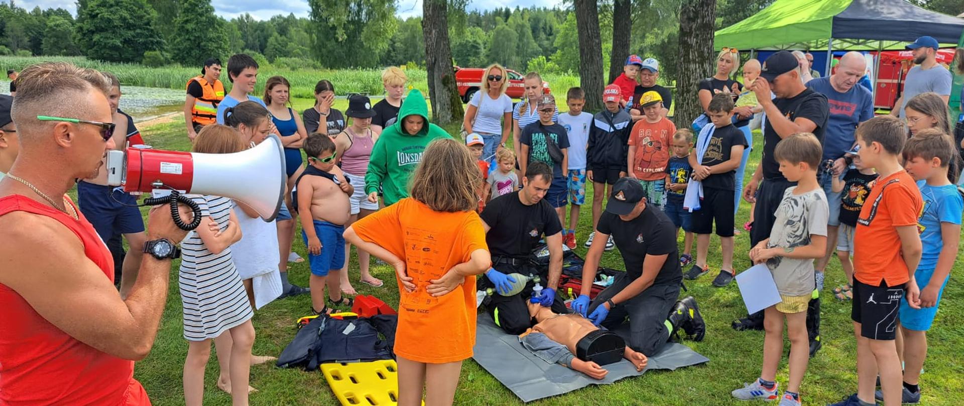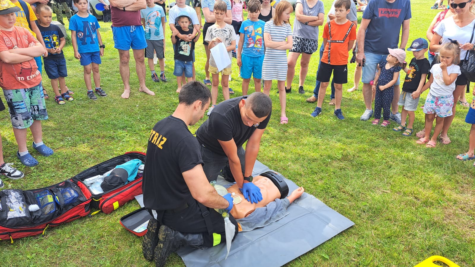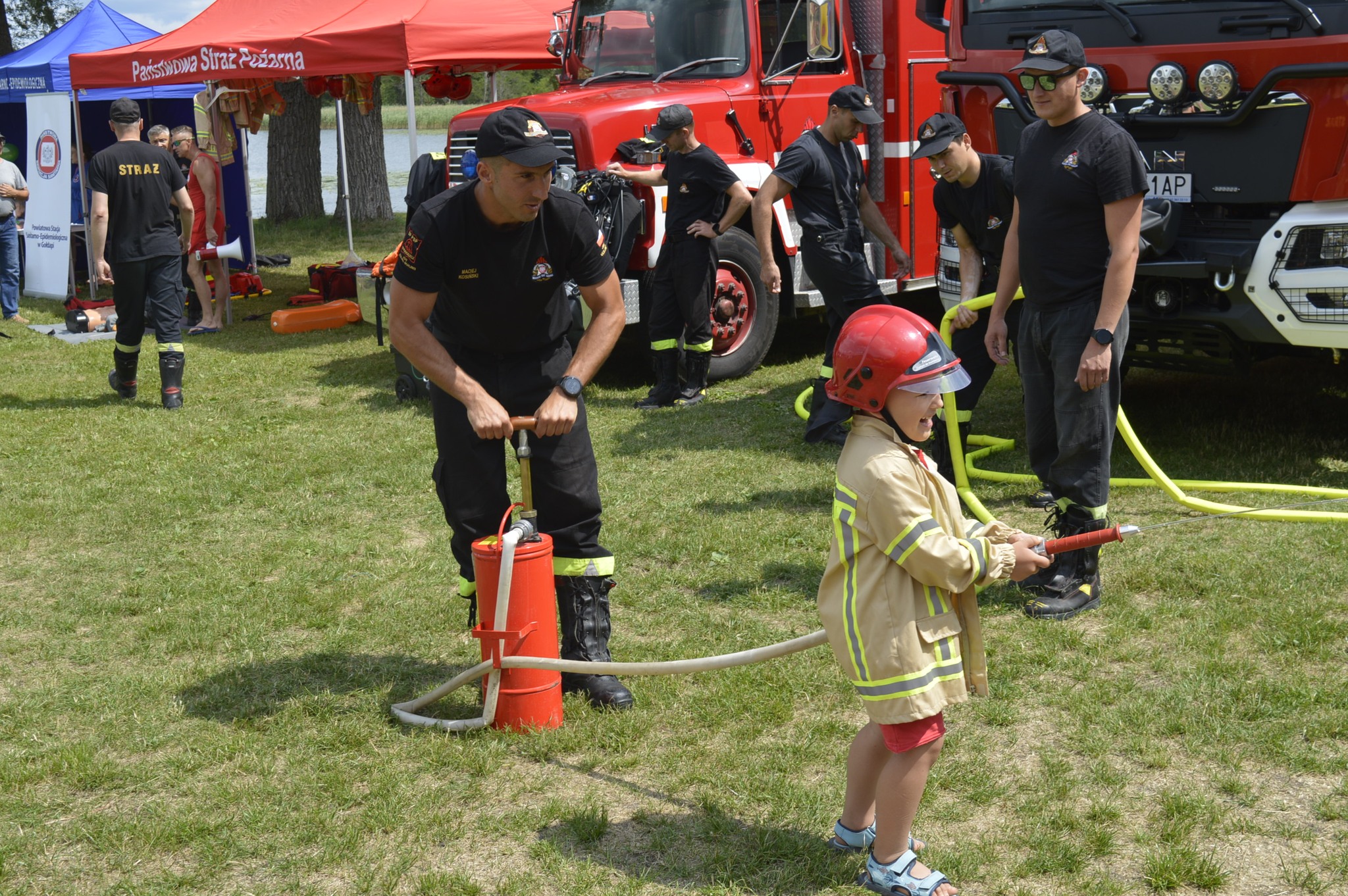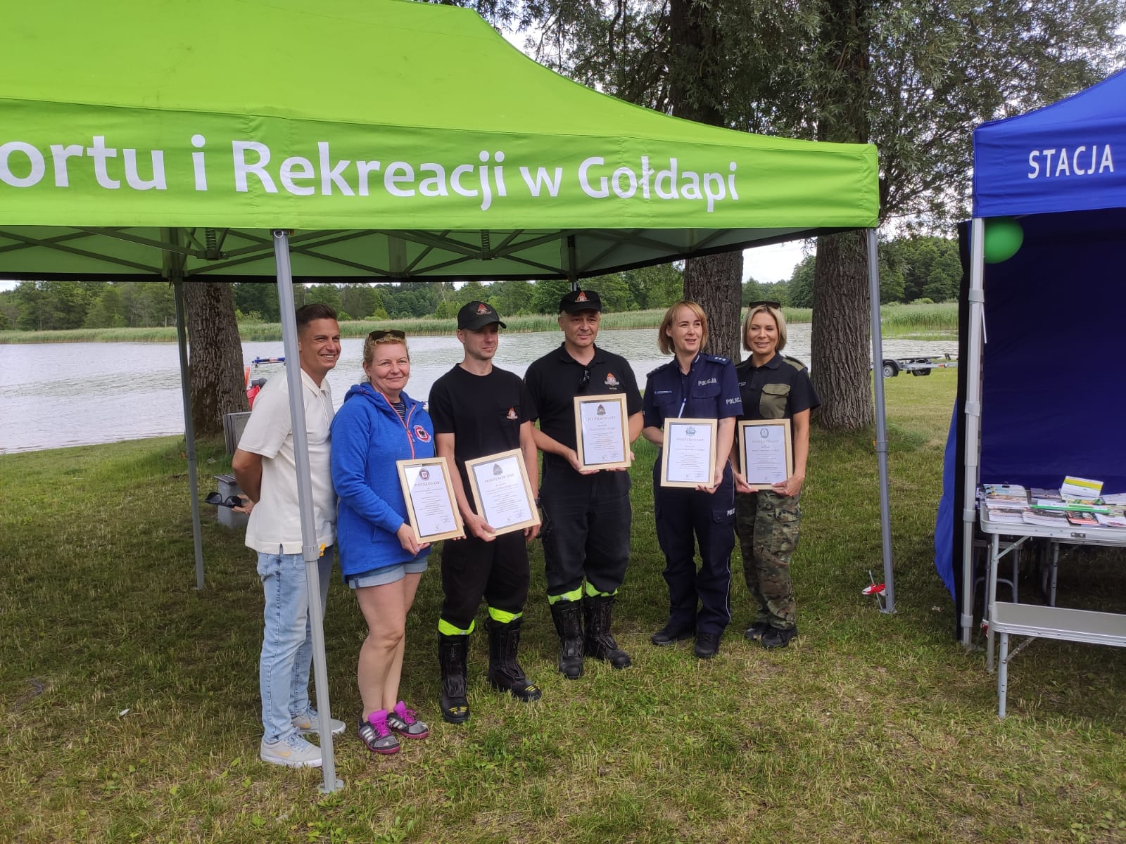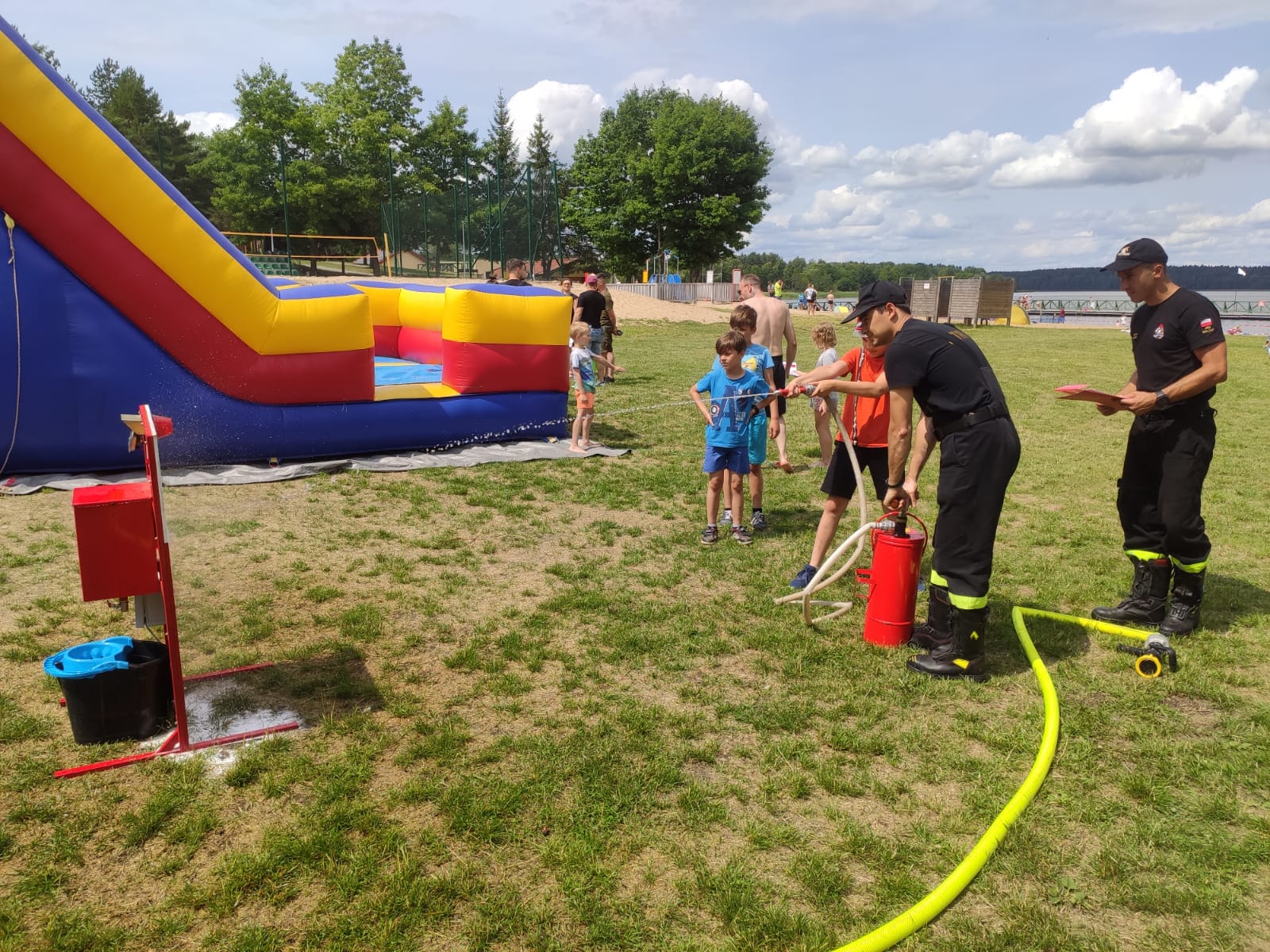 1 lipca 2023 roku na Plaży Miejskiej Ośrodka Sportu i Rekreacji w Gołdapi odbyła się (zapoczątkowana 20 czerwca br.) kolejna akcja mająca na celu m.in. przybliżenie zasad bezpiecznego zachowania się w pobliżu akwenów. Od pierwszego dnia lipca ruszyło również w tym miejscu kąpielisko. Strażacy z Komendy Powiatowej Państwowej Straży Pożarnej w Gołdapi wraz z funkcjonariuszami Specjalistycznej Grupy Ratownictwa Wodno-Nurkowego z KP PSP w Węgorzewie oraz przedstawiciele Komendy Powiatowej Policji w Gołdapi, Placówki Straży Granicznej w Gołdapi i Powiatowej Stacji Sanitarno-Epidemiologicznej w Gołdapi, edukowali na temat bezpieczeństwa oraz organizowali konkursy dla najmłodszych. W trakcie wydarzenia możliwe było zapoznanie się na wyznaczonych stoiskach z charakterem funkcjonowania każdej ze służb/inspekcji, gdzie omawiano również kwestie związane z bezpiecznym wypoczynkiem i odpowiednim postępowaniem nad wodą. Funkcjonariusze KP PSP w Gołdapi prowadzili m.in. zajęcia teoretyczne i praktyczne w zakresie zasad pierwszej pomocy medycznej oraz zaprezentowali ewakuację osoby poszkodowanej z wody na brzeg przy użyciu łodzi ratowniczej wraz z udzieleniem kwalifikowanej pierwszej pomocy.