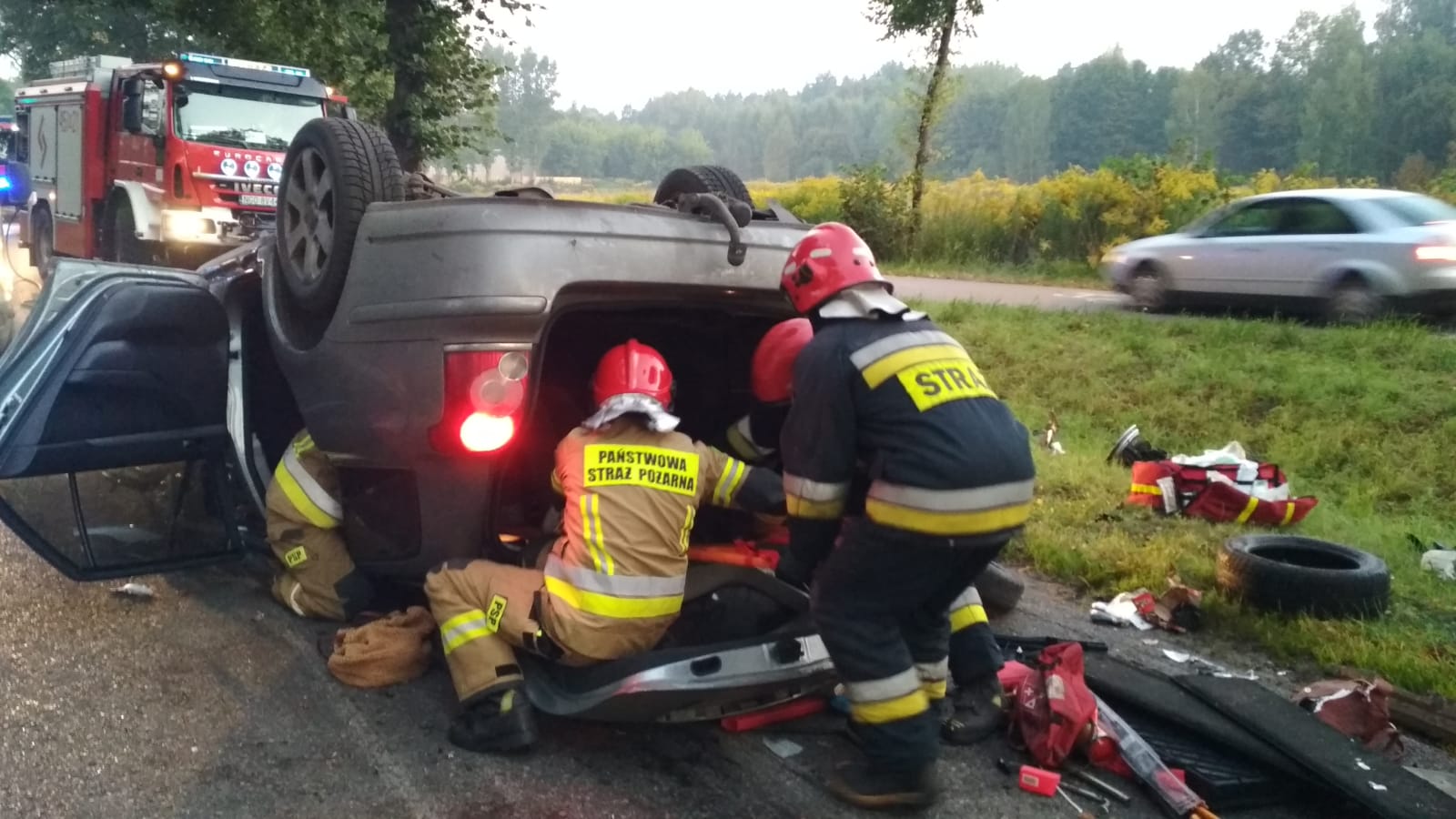 9 września 2021 roku o godzinie 5:25 dyżurny stanowiska kierowania Komendanta Powiatowego PSP w Gołdapi otrzymał zgłoszenie o wypadku samochodu osobowego na drodze wojewódzkiej nr 651 w miejscowości Botkuny, gm. Gołdap. W akcji uczestniczyły trzy zastępy z gołdapskiej komendy. Po przybyciu na miejsce zdarzenia stwierdzono, że na środku jezdni znajduje się pojazd osobowy usytuowany na dachu, w którym pozostawała jedna osoba, natomiast poza autem obecna była kolejna osoba, której pomocy udzielał kierujący pojazdem. Działania strażaków polegały na zabezpieczenia miejsca zdarzenia, ewakuacji osoby poszkodowanej z samochodu w miejsce bezpieczne oraz udzieleniu podróżującym pomocy medycznej (kierowca nie zgłaszał żadnych dolegliwości). Przybyłe na miejscu zdarzenia Zespoły Ratownictwa Medycznego po przebadaniu, przetransportowały poszkodowanych do szpitali. Dalsze działania dotyczyły m.in.: likwidacji wycieku płynów eksploatacyjnych oraz pomocy Policji w zabezpieczeniu miejsca prowadzonych czynności dochodzeniowo–śledczych.