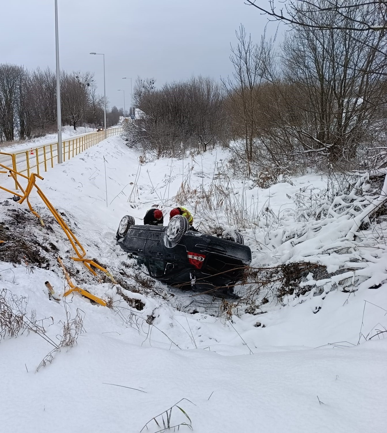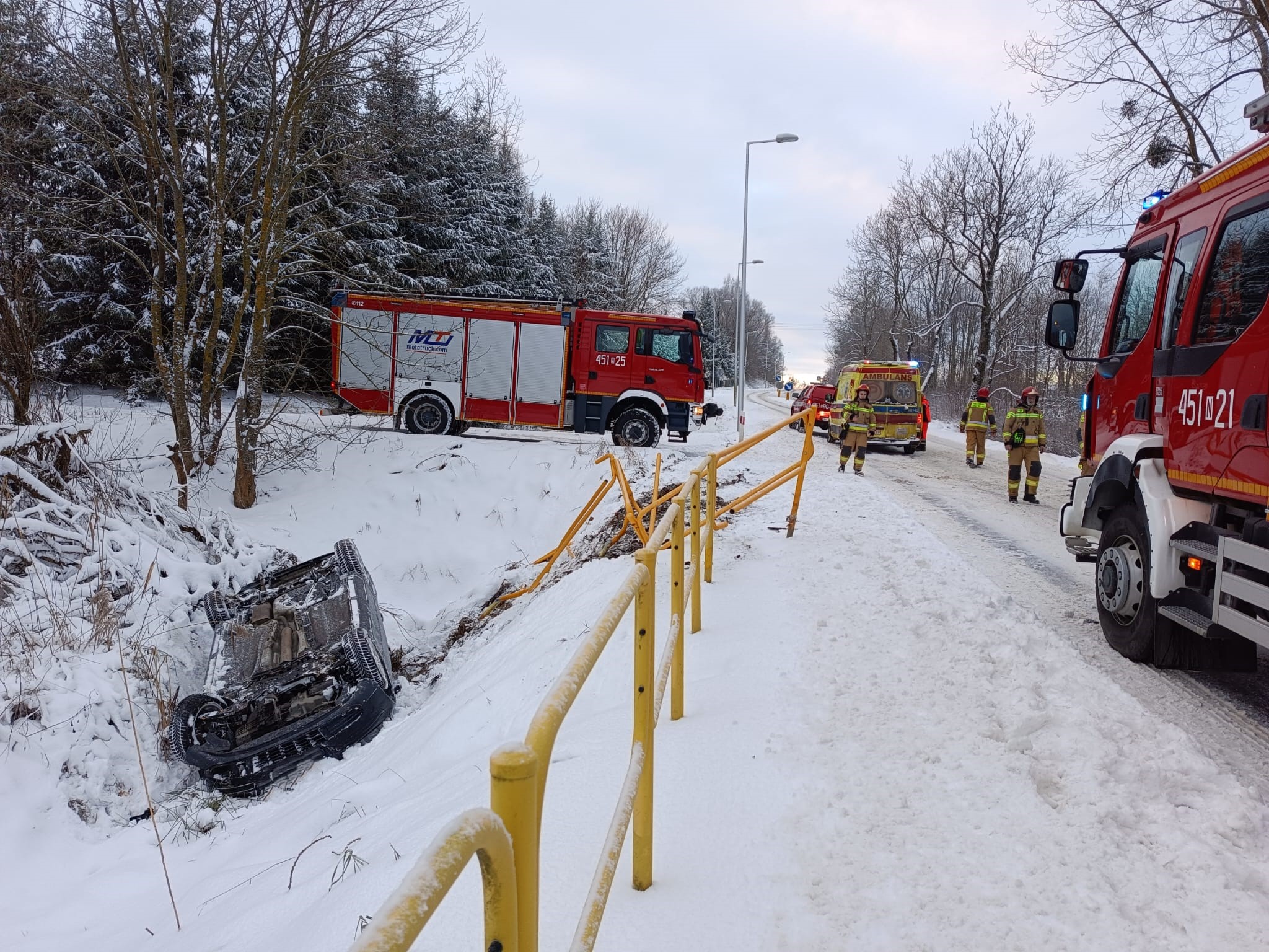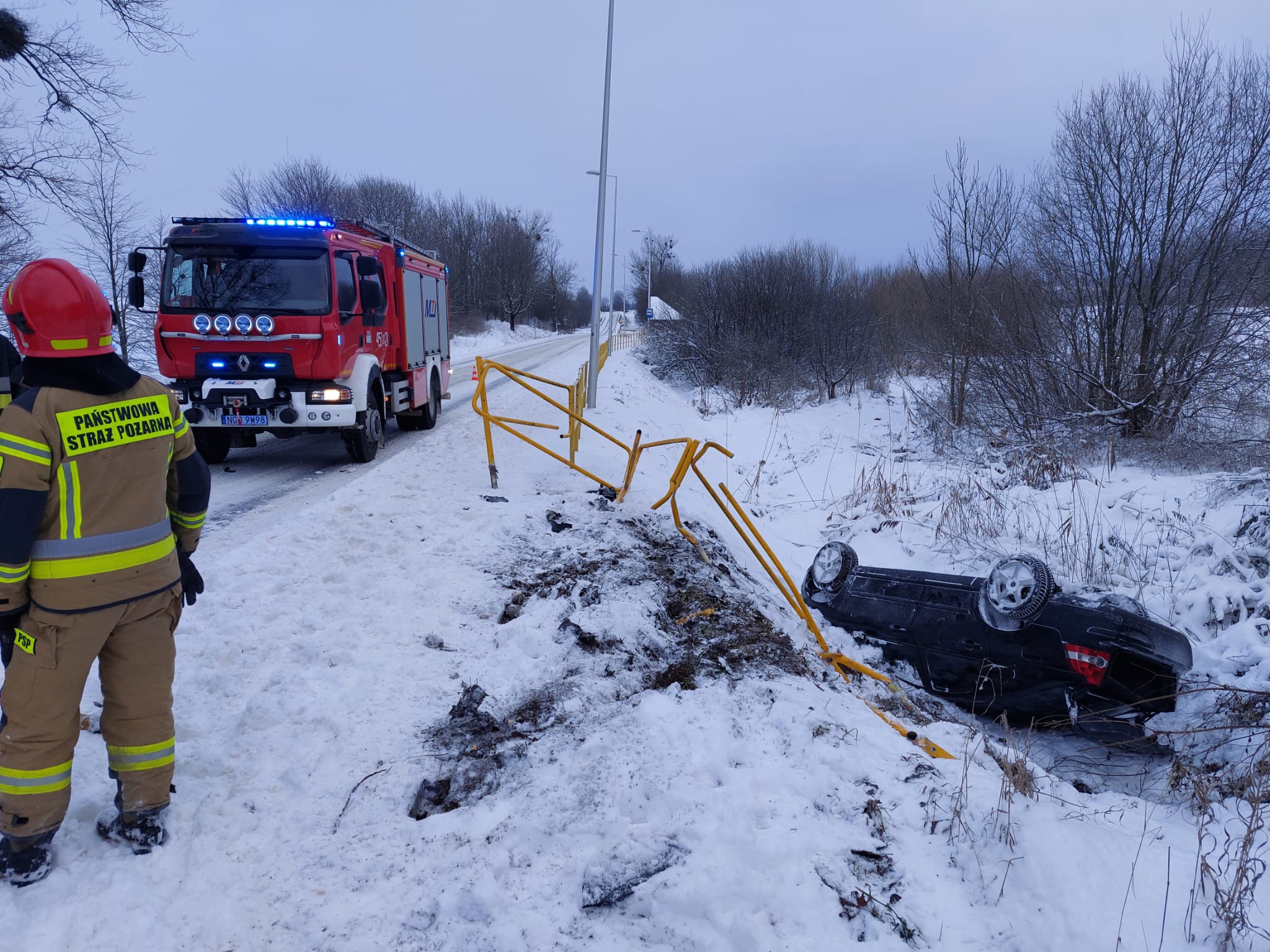 5 stycznia 2024 roku o godzinie 7:56 dyżurny stanowiska kierowania Komendanta Powiatowego Państwowej Straży Pożarnej w Gołdapi otrzymał zgłoszenie o samochodzie osobowym zlokalizowanym w rowie w miejscowości Wronki Wielkie, gm. Gołdap. Do akcji wysłano trzy zastępy z gołdapskiej komendy oraz jednostkę Ochotniczej Straży Pożarnej w Grabowie. Po przybyciu na miejsce zdarzenia stwierdzono, że w rowie drogi wojewódzkiej nr 650 znajduje się osobówka usytuowana na dachu, którą podróżował jedynie kierowca (poza pojazdem – ewakuowany przez osobę postronną). Po udzieleniu kwalifikowanej pierwszej pomocy osobie poszkodowanej, przekazano ją przybyłemu na miejsce zdarzenia Zespołowi Ratownictwa Medycznego, który po przebadaniu nie stwierdził potrzeby hospitalizacji. Dalsze działania strażaków polegały m.in. na zabezpieczeniu miejsca zdarzenia, odłączeniu zasilania w samochodzie oraz pomocy Policji w kierowaniu ruchem drogowym, podczas prowadzenia przez nich czynności dochodzeniowo-śledczych.