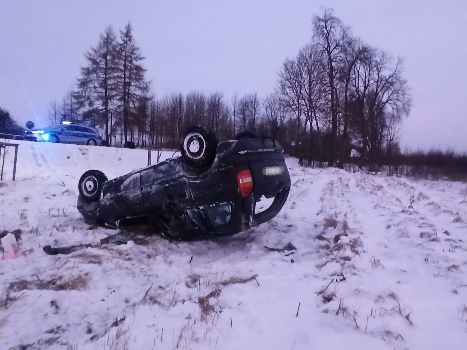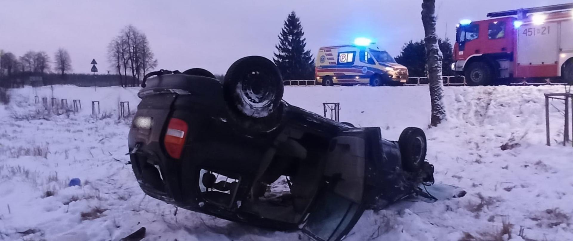 29 grudnia 2021 roku o godzinie 6:46 dyżurny stanowiska kierowania Komendanta Powiatowego PSP w Gołdapi otrzymał zgłoszenie o wypadku samochodu osobowego na drodze krajowej nr 65 w miejscowości Kozaki, gm. Gołdap. W akcji uczestniczyły dwa zastępy z gołdapskiej komendy. Po przybyciu na miejsce zdarzenia stwierdzono, że w przydrożnym rowie znajduje się pojazd osobowy usytuowany na dachu, którym jechało pięć osób. Wszystkie opuściły auto o własnych siłach. Działania strażaków polegały na zabezpieczeniu miejsca zdarzenia oraz udzieleniu jednej z osób podróżujących pomocy medycznej. Przybyłe na miejsce zdarzenia Zespoły Ratownictwa Medycznego (ZRM) po przebadaniu, przetransportowały poszkodowanych do szpitali. Dalsze działania dotyczyły m.in. pomocy Policji w zabezpieczeniu miejsca prowadzonych czynności.