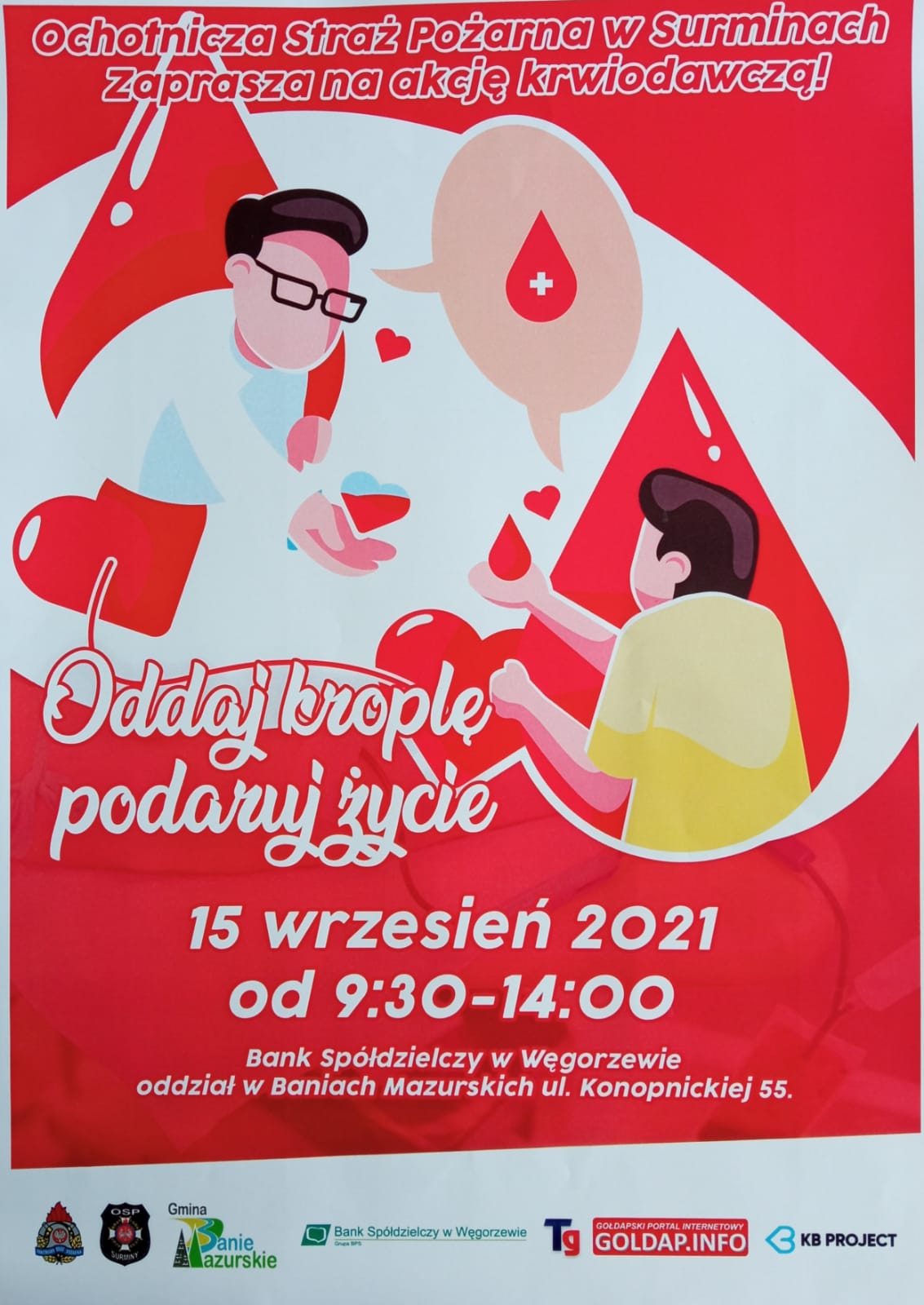 15 września 2021 roku w godz. 930–1400 w Oddziale Węgorzewskiego Banku Spółdzielczego w Baniach Mazurskich odbędzie się akcja krwiodawstwa organizowana przez Ochotniczą Straż Pożarną w Surminach we współpracy z Komendą Powiatową PSP w Gołdapi. Akcja odbędzie się z zachowaniem reżimu sanitarnego. Serdecznie zapraszamy wszystkich do wzięcia udziału w ww. przedsięwzięciu.