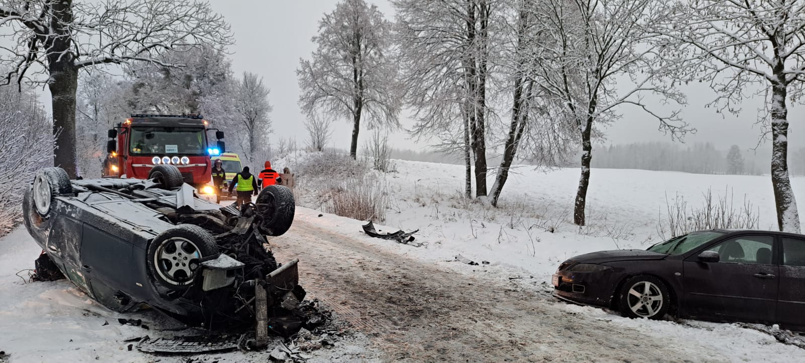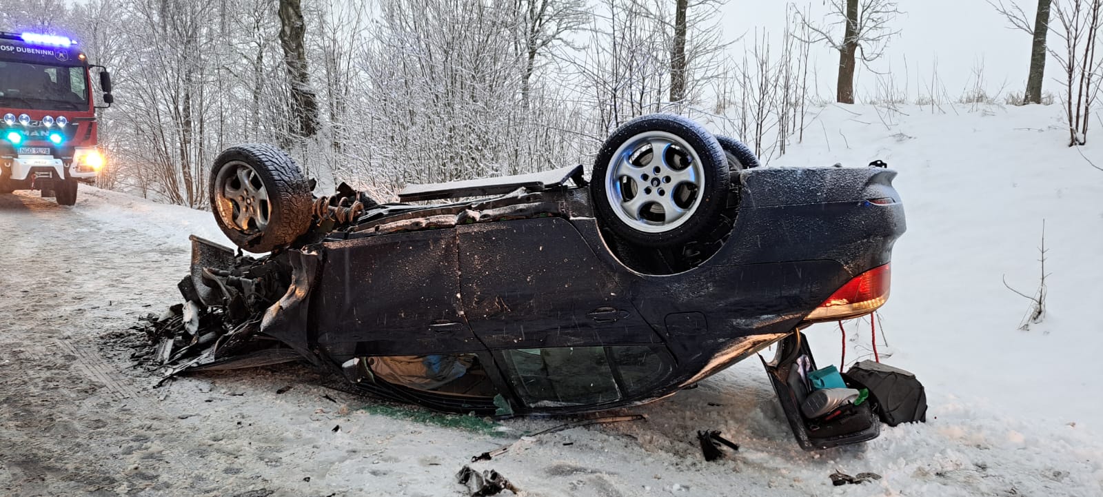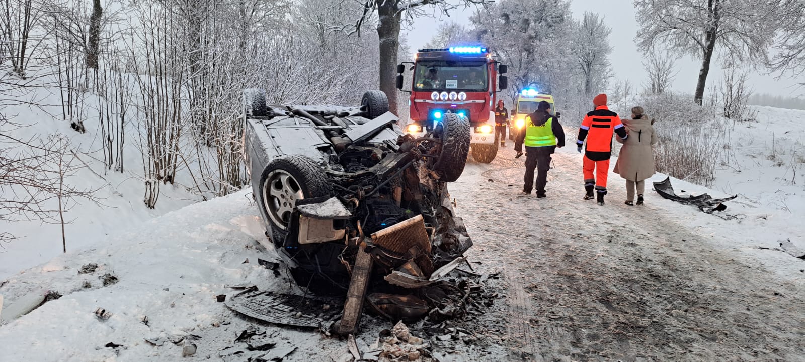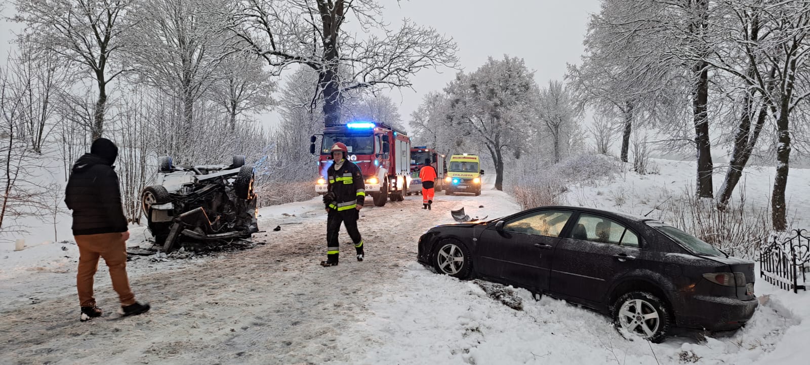 27 stycznia 2023 roku o godzinie 6:54 dyżurny stanowiska kierowania Komendanta Powiatowego Państwowej Straży Pożarnej w Gołdapi otrzymał zgłoszenie o zderzeniu dwóch samochodów osobowych na drodze wojewódzkiej nr 651 w miejscowości Rogajny, gm. Dubeninki. Do akcji wysłano dwa zastępy z gołdapskiej komendy oraz Ochotniczą Straż Pożarną z Dubeninek. Po przybyciu na miejsce zdarzenia stwierdzono, że na łuku DW 651 na jednym z pasów ruchu znajduje się auto osobowe przewrócone na dach, którym podróżowały dwie osoby (w tym jedna uskarżająca się na ból klatki piersiowej), a w przydrożnym rowie usytuowana jest druga osobówka, którą podróżował jedynie kierowca. Wszyscy uczestnicy zdarzenia opuścili pojazdy przed przybyciem zastępów jednostek ochrony przeciwpożarowej. Po udzieleniu kwalifikowanej pierwszej pomocy osobie poszkodowanej, przekazano ją przybyłemu na miejsce zdarzenia Zespołowi Ratownictwa Medycznego, który po przebadaniu nie zdecydował o potrzebie hospitalizacji. Działania strażaków polegały m.in. na zabezpieczeniu miejsca zdarzenia, odłączeniu zasilania w pojazdach oraz pomocy Policji w kierowaniu ruchem drogowym.