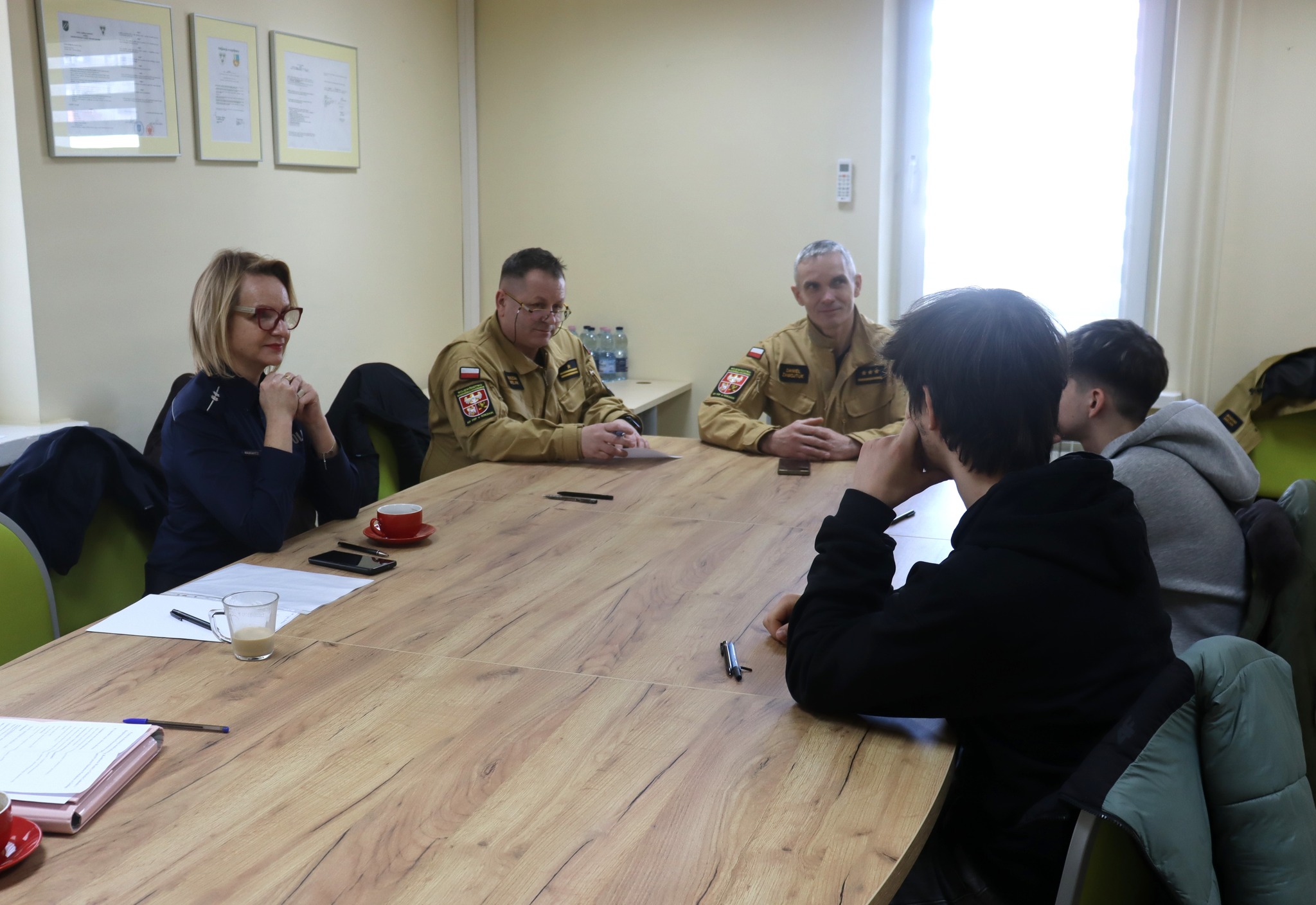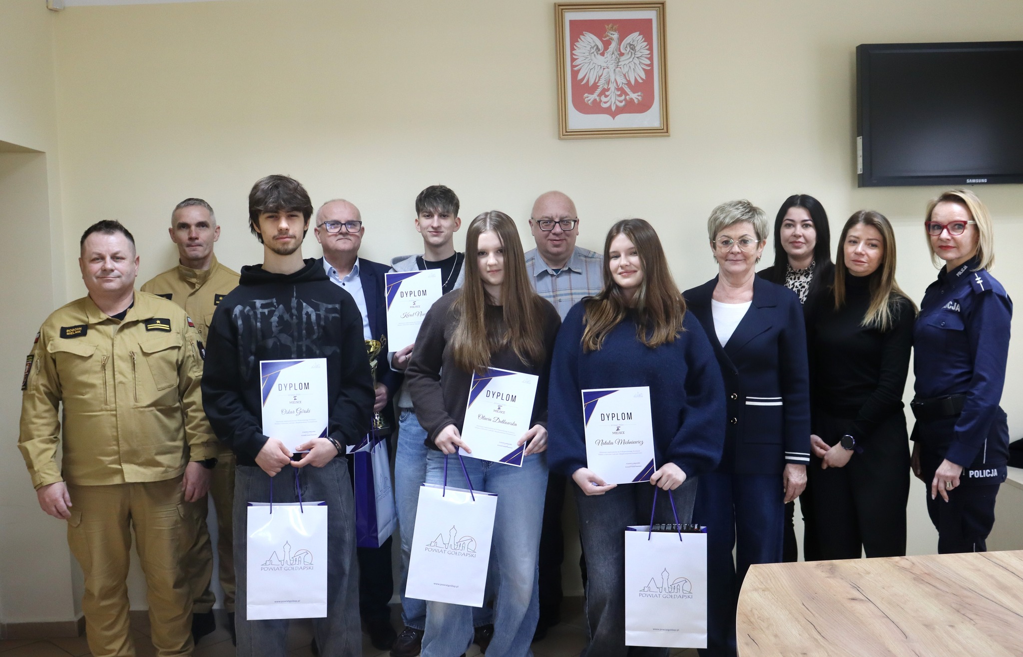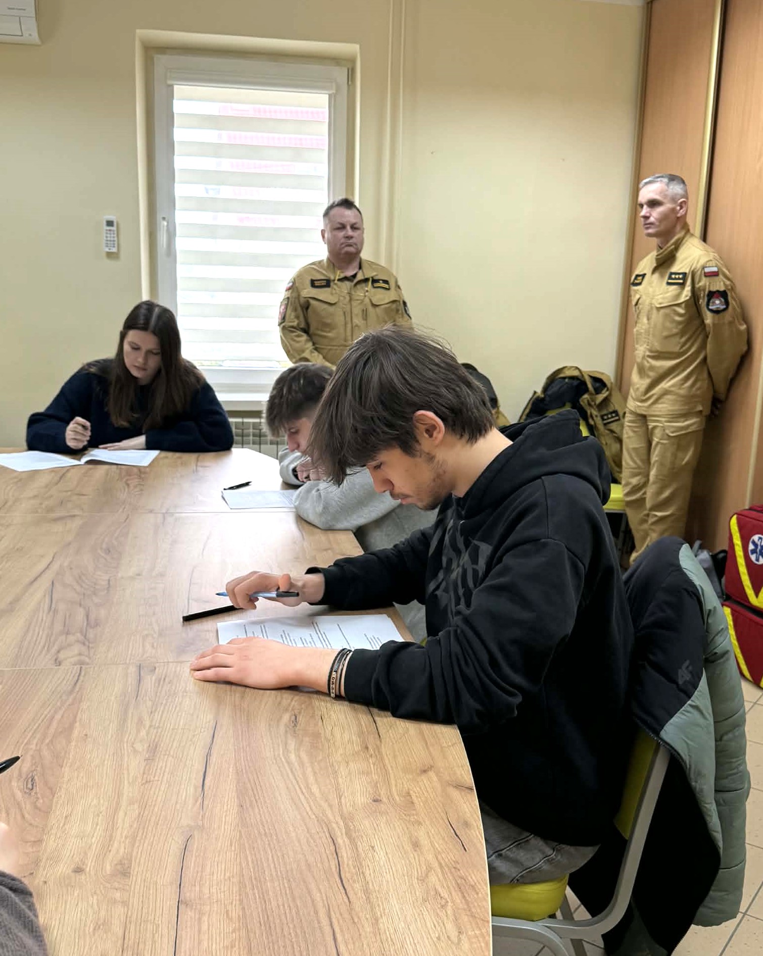 26 lutego 2026 roku w siedzibie Starostwa Powiatowego w Gołdapi odbyły się międzyszkolne eliminacje II Wojewódzkiego Konkursu Wiedzy o Ochronie Ludności i Bezpieczeństwie Powszechnym. Celem ww. przedsięwzięcia jest m.in. edukacja i popularyzowanie wiedzy w zakresie ochrony ludności i bezpieczeństwa powszechnego, przygotowanie młodzieży szkół ponadpodstawowych do racjonalnych zachowań w obliczu zagrożeń cywilizacyjnych oraz kształtowanie nawyków i umiejętności w zakresie udzielania pierwszej pomocy w nagłych wypadkach. W skład zespołu sędziowskiego z ramienia Komendy Powiatowej Państwowej Straży Pożarnej w Gołdapi, który oceniał eliminacje wchodzili: mł. bryg. Bogdan Mielnik i kpt. Daniel Żamojtuk. W zmaganiach udział wzięły dwa dwuosobowe zespoły ze szkół ponadpodstawowych powiatu gołdapskiego, tj. drużyna z Liceum Ogólnokształcącego im. Jana Pawła II w Gołdapi oraz reprezentacja z Zespołu Szkół Zawodowych w Gołdapi. Eliminacje międzyszkolne polegały na rozwiązaniu pisemnego testu wiedzy oraz udzieleniu ustnych odpowiedzi na pytania członków zespołu sędziowskiego obejmujących zagadnienia bezpieczeństwa powszechnego, a także sprawdzeniu praktycznych umiejętności w zakresie udzielania pierwszej pomocy. Lepszą w rywalizacji okazała się być drużyna z Liceum Ogólnokształcącego im. Jana Pawła II w Gołdapi. Zwycięzcom serdecznie gratulujemy i życzymy sukcesów w dalszym etapie na szczeblu wojewódzkim, który odbędzie się 20 marca 2026 roku.