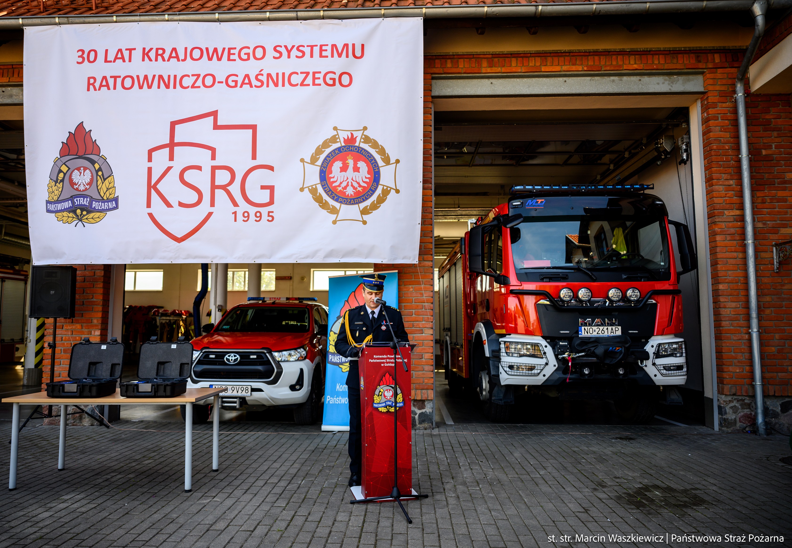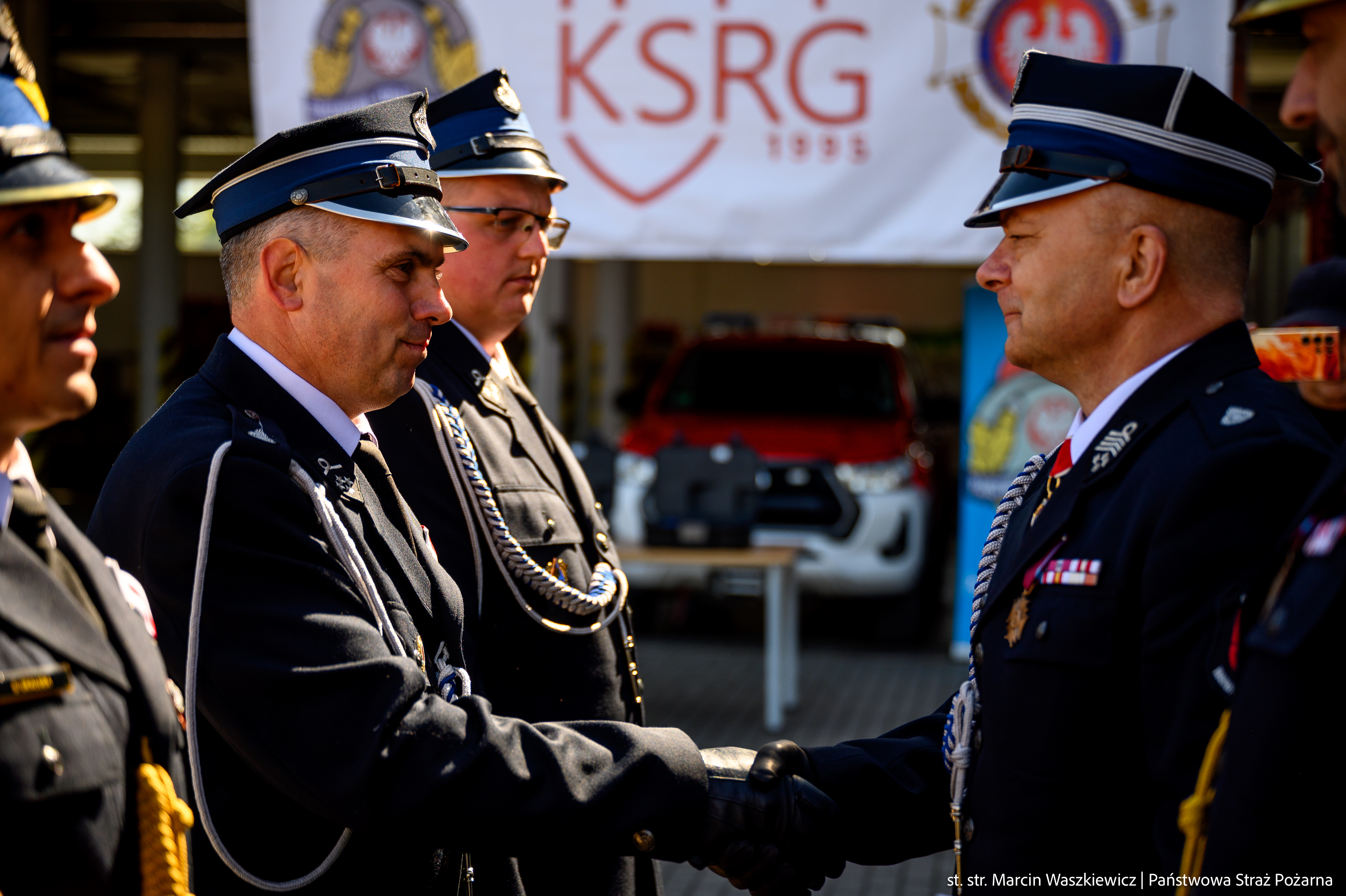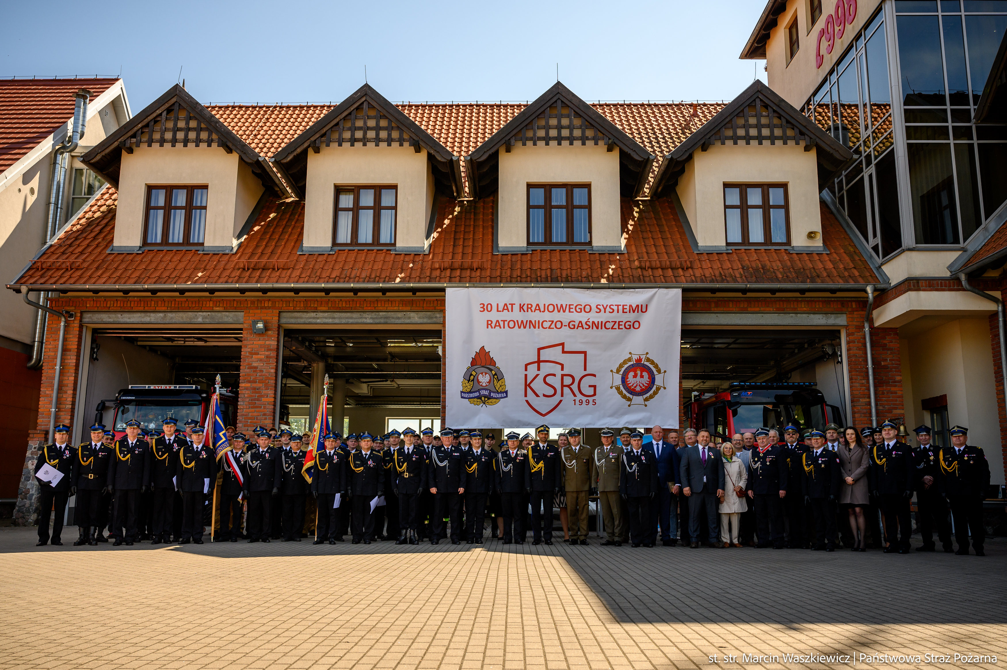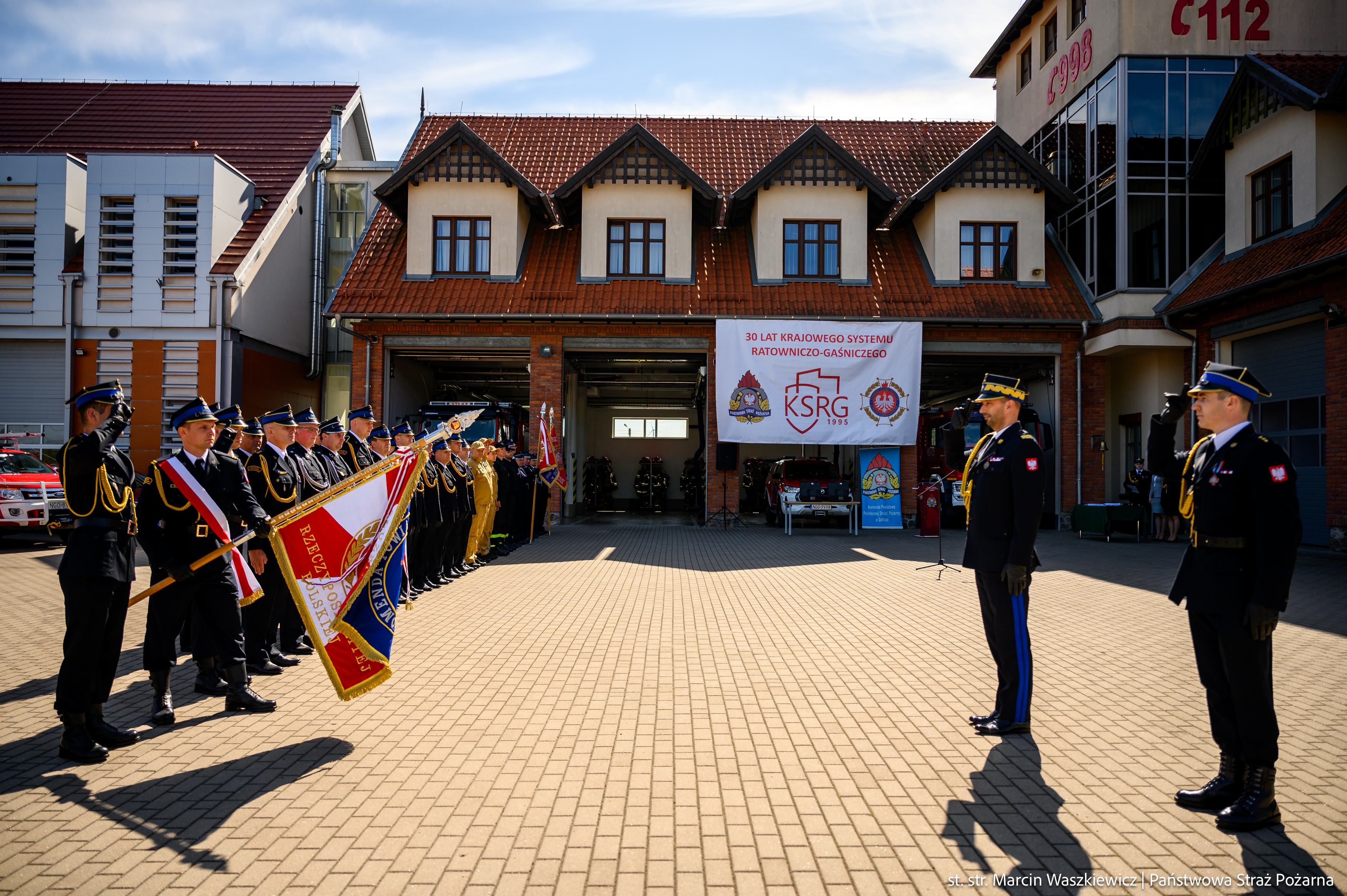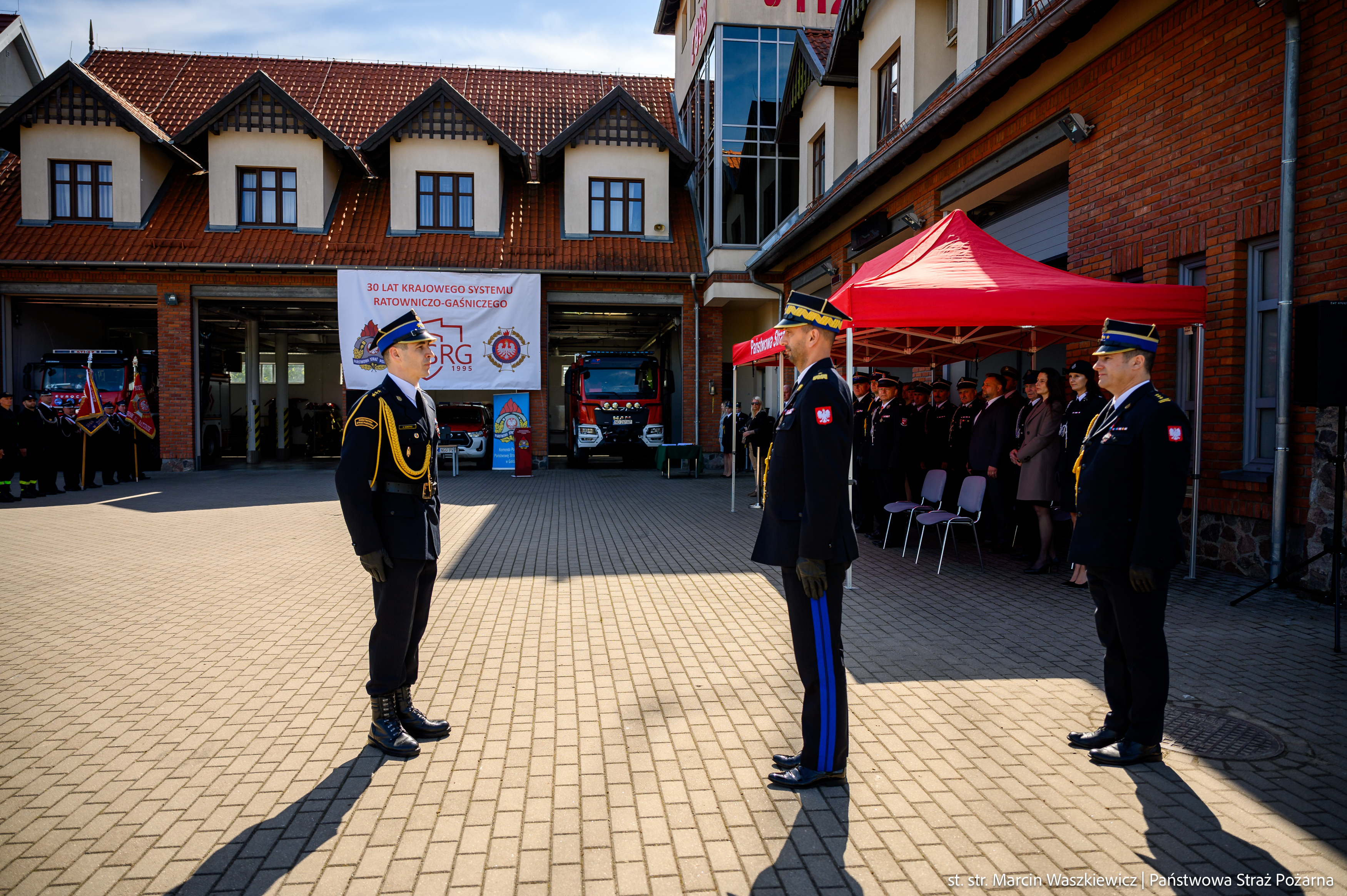 Uroczystą zbiórkę rozpoczęło złożenie przez dowódcę uroczystości kpt. Adrian Korotko meldunku Warmińsko-Mazurskiemu Komendantowi Wojewódzkiemu Państwowej Straży Pożarnej nadbryg. Michałowi Kamienieckiemu o gotowości pododdziału pożarniczego do uroczystości. Następnie przy akompaniamencie hymnu państwowego podniesiono flagę Rzeczypospolitej Polskiej na maszt. Później głos zabrał Komendant Powiatowy PSP w Gołdapi st. bryg. Wojciech Szczepanik, który m.in. przywitał zaproszonych gości, dziękując za współpracę i wsparcie na rzecz rozwoju ochrony przeciwpożarowej i bezpieczeństwa powiatu gołdapskiego. Komendant w swoim wystąpieniu nawiązał również do przypadającego w tym roku jubileuszu 30-lecia działalności Krajowego Systemu Ratowniczo-Gaśniczego – fundamentu bezpieczeństwa wewnętrznego Polski, przedstawiając jak na przestrzeni trzech dekad zwiększył się poziom bezpieczeństwa mieszkańców naszej społeczności, poprzez m.in. włączanie do struktur systemu jednostek Ochotniczych Straży Pożarnych i Wojskowej Straży Pożarnej powiatu gołdapskiego oraz zakupy pojazdów pożarniczych i sprzętu ratowniczego. st. bryg. Wojciech Szczepanik skierował także słowa uznania do funkcjonariuszy i pracowników cywilnych komendy za codzienne zaangażowanie w służbę i pracę oraz druhów Ochotniczych Straży Pożarnych za stałą gotowość do niesienia pomocy.