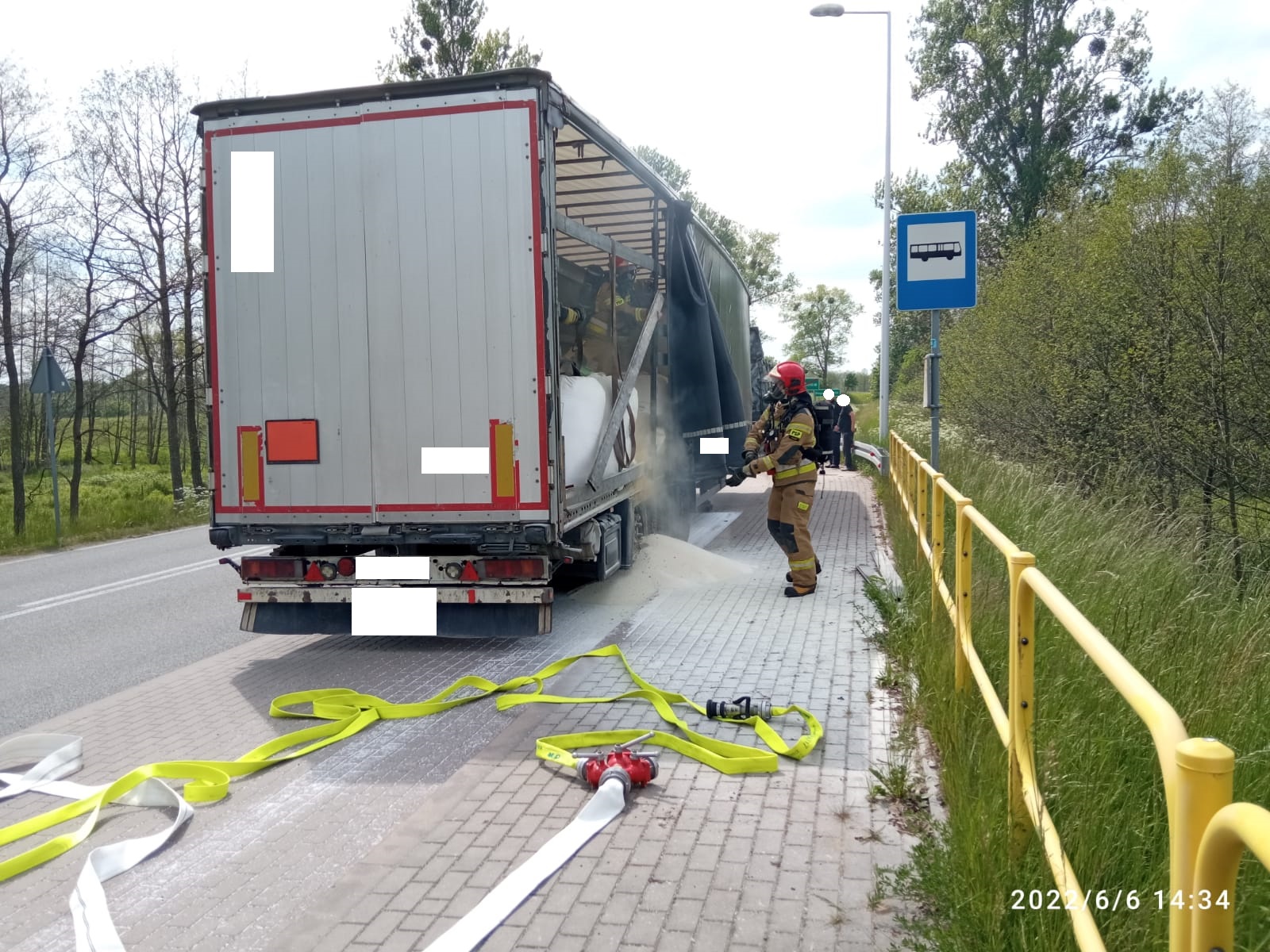6 czerwca 2022 roku o godz. 14:13 dyżurny stanowiska kierowania Komendanta Powiatowego PSP w Gołdapi otrzymał zgłoszenie o pożarze samochodu ciężarowego w miejscowości Stadnica, gm. Banie Mazurskie. Do działań niezwłocznie wysłano dwa zastępy strażaków z gołdapskiej komendy oraz OSP Banie Mazurskie i OSP Surminy. W trakcie dojazdu okazało się, że pali się naczepa z nawozami, a ciągnik siodłowy został od niej odczepiony. W momencie przybycia na miejsce z naczepy wydobywał się dym, a ogniem częściowo objęte były dwa wielkogabarytowe worki z nawozem. Nie stwierdzono osób poszkodowanych – kierowca pojazdu zjechał na przystanek autobusowy drogi wojewódzkiej nr 650, opuścił pojazd o własnych siłach i przy pomocy gaśnicy proszkowej podjął próbę gaszenia pożaru. Działania strażaków polegały na zabezpieczeniu miejsca zdarzenia, ugaszeniu pożaru oraz pomocy Policji w kierowaniu ruchem drogowym. Pozostały ładunek znajdujący się na naczepie został sprawdzony kamerą termowizyjną – podwyższonej temperatury nie stwierdzono.