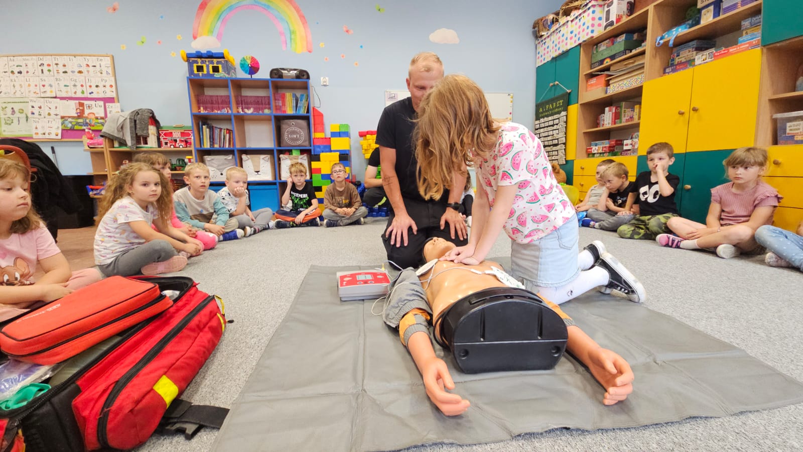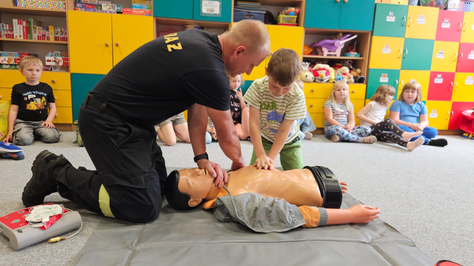 24 czerwca 2025 roku w ramach Tygodnia Bezpieczeństwa gościliśmy w progach Komendy Powiatowej Państwowej Straży Pożarnej w Gołdapi uczniów klasy 3 Szkoły Podstawowej nr 2 im. Marszałka Józefa Piłsudskiego w Gołdapi. Kolejne w tym dniu spotkanie odbyło się już w siedzibie SP nr 2, w którym uczestniczyły dzieci z klas 0. Działania edukacyjne realizowane przez gołdapskich strażaków polegały na przekazaniu słuchaczom wielu przydatnych informacji w zakresie szeroko rozumianego bezpieczeństwa. Funkcjonariusze podczas pogadanek zwracali uwagę na to, iż właściwe zachowanie się i przestrzeganie zasad bezpieczeństwa jest gwarancją spokojnego pobytu w domu, szkole czy miejscu wypoczynku (w tym na wodą) oraz uniknięcia sytuacji zagrażających życiu i zdrowiu. Przypomniano także numery alarmowe oraz zasady poprawnego informowania o potencjalnych niebezpieczeństwach. Spotkania były również dobrą okazją do zapoznania uczniów ze specyfiką służby w Państwowej Straży Pożarnej, przeprowadzenia zajęć w zakresie udzielania kwalifikowanej pierwszej pomocy oraz prezentacji sprzętu ratowniczego znajdującego się na wyposażeniu pojazdu pożarniczego.