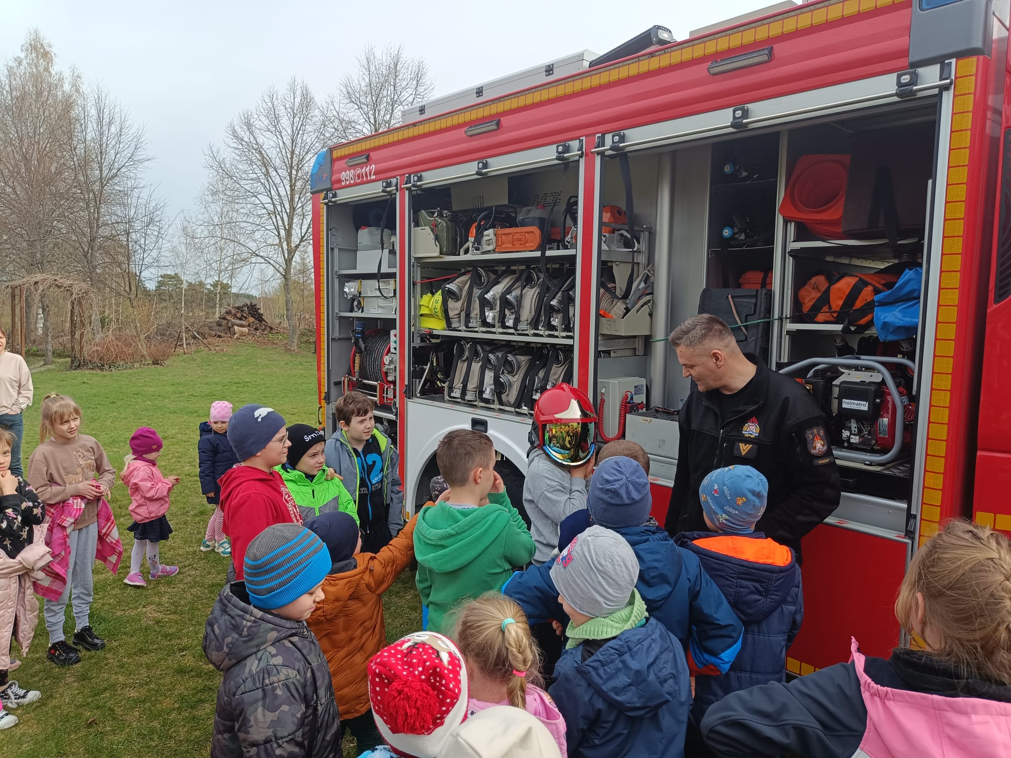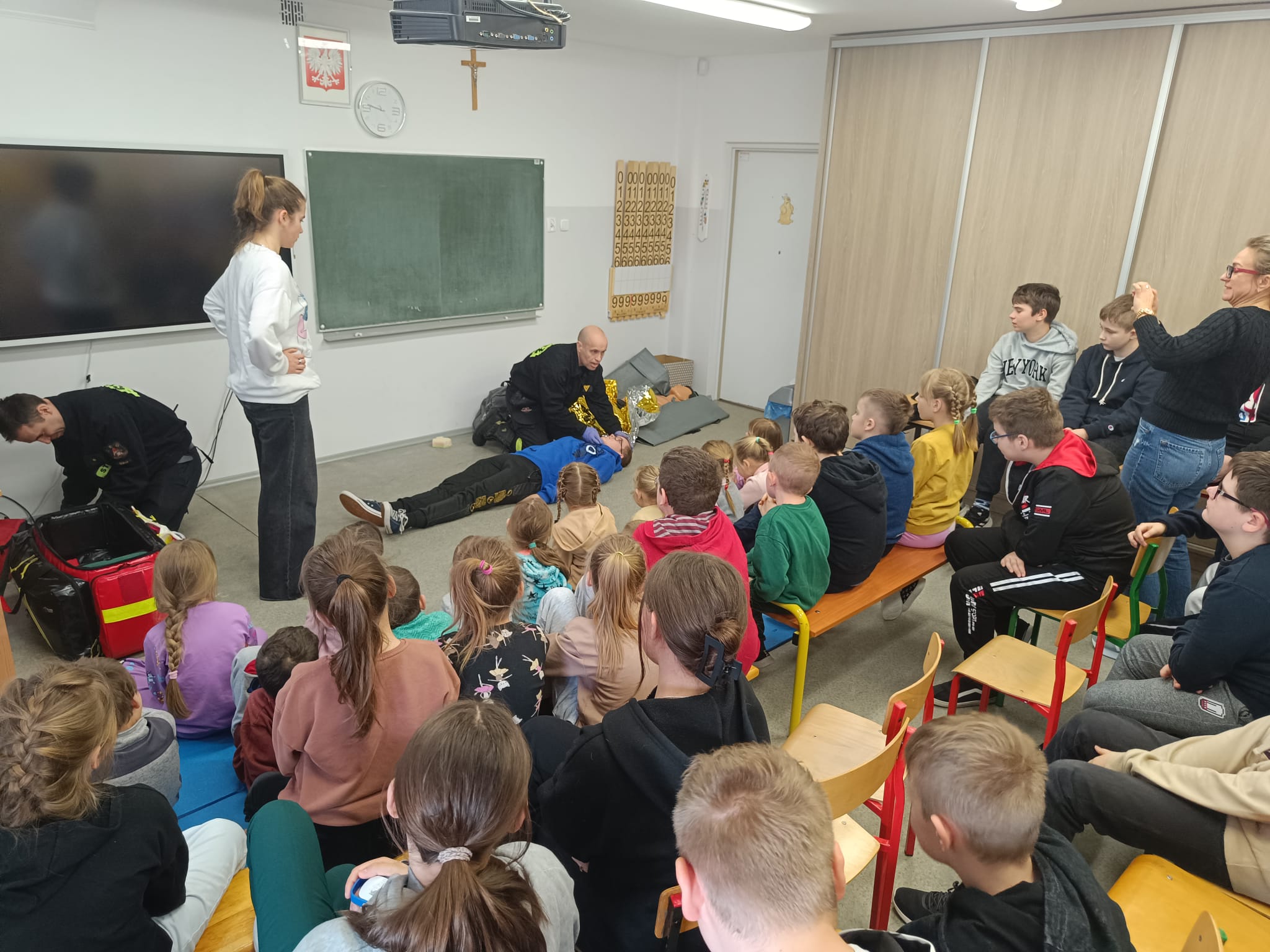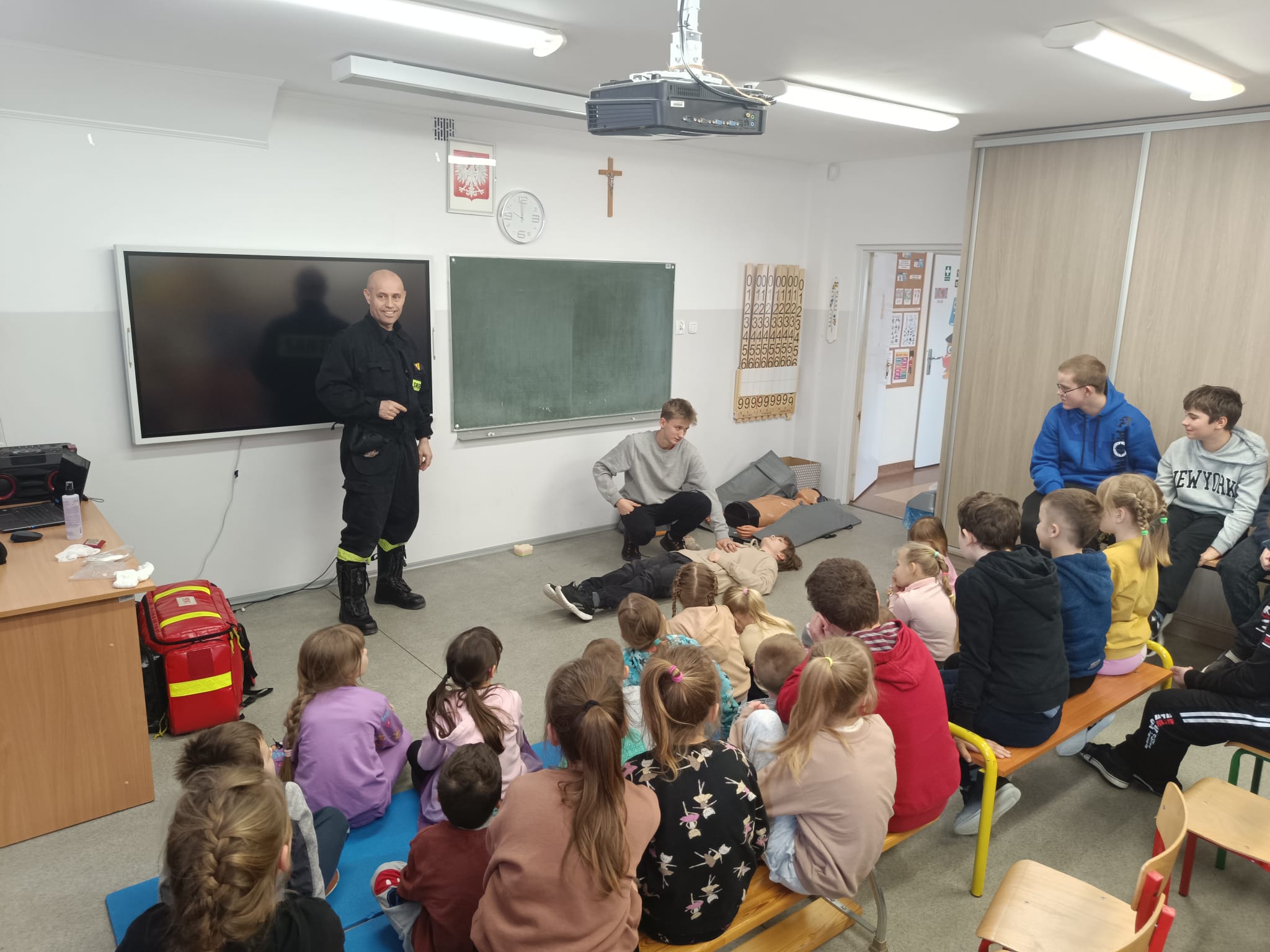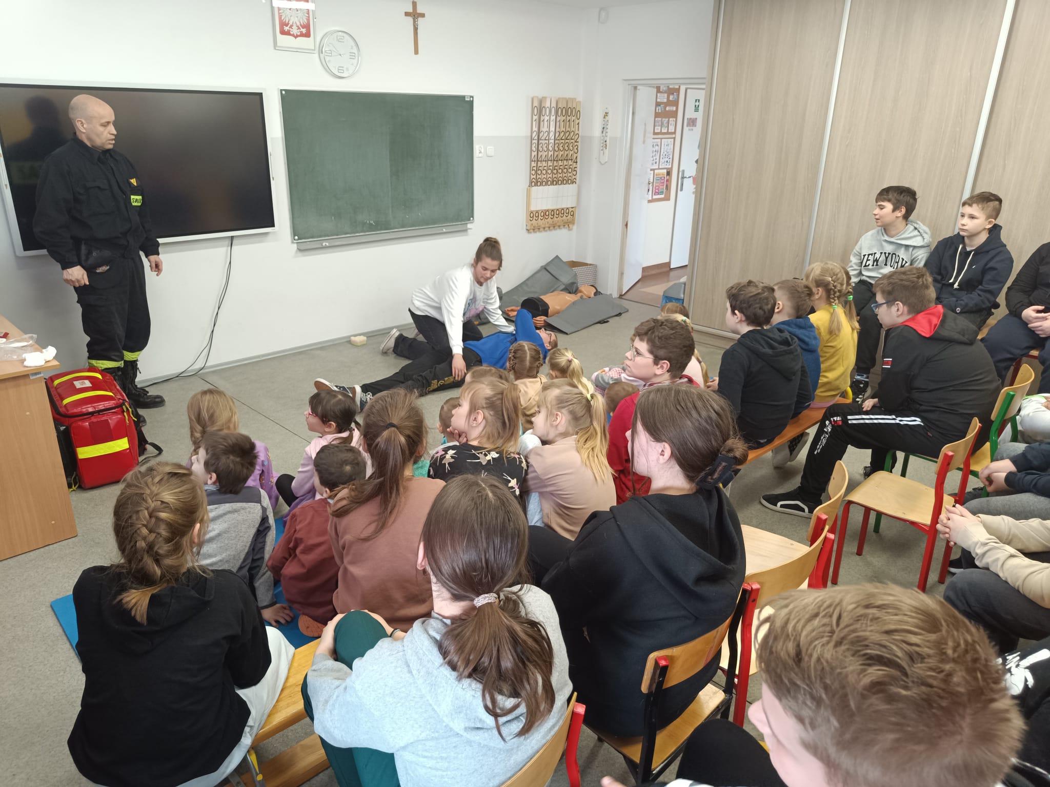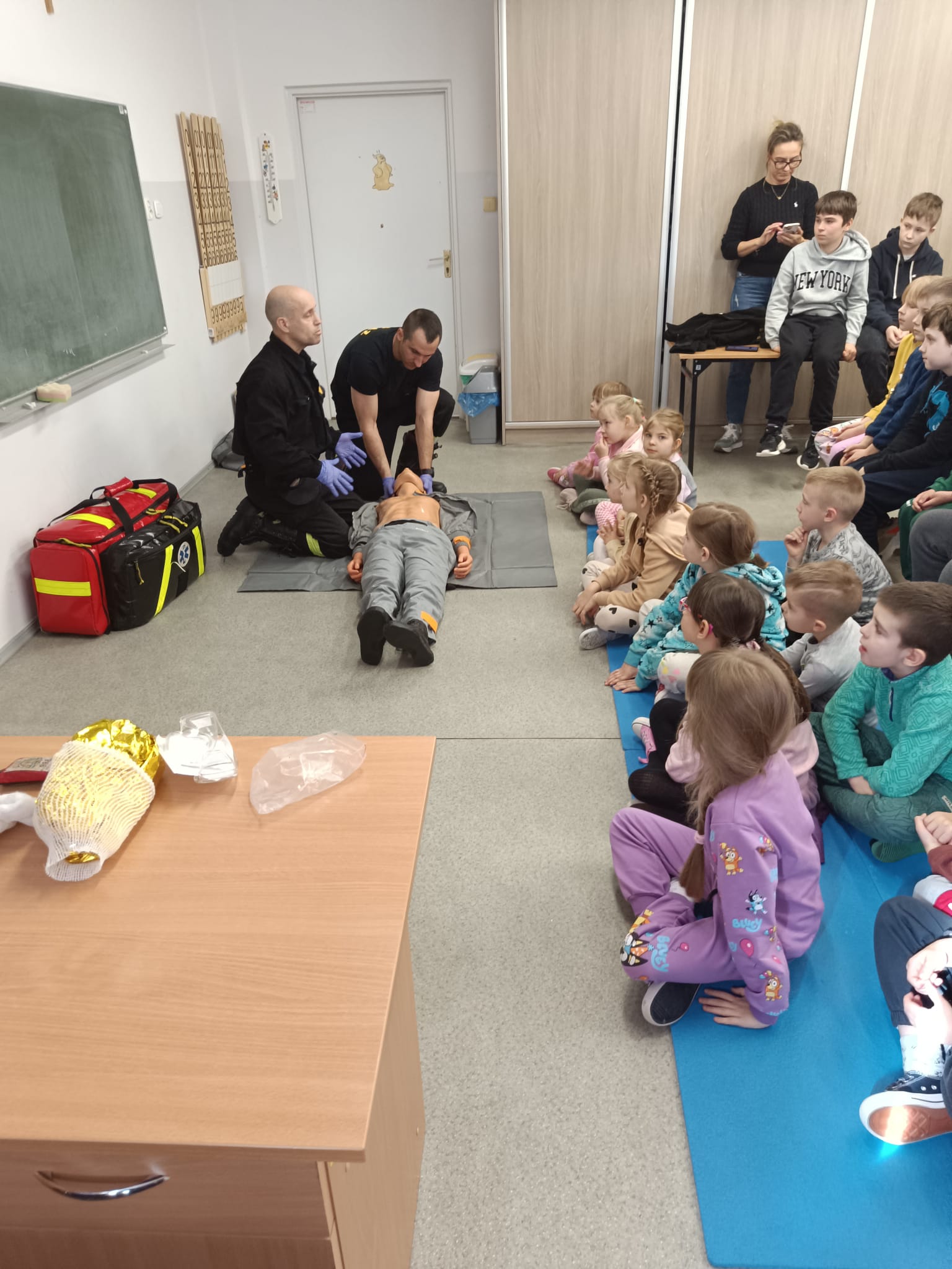 Wizyta strażaków była również dobrą okazją do przeprowadzenia zajęć w zakresie udzielania kwalifikowanej pierwszej pomocy oraz prezentacji sprzętu ratowniczego znajdującego się na wyposażeniu pojazdu pożarniczego.