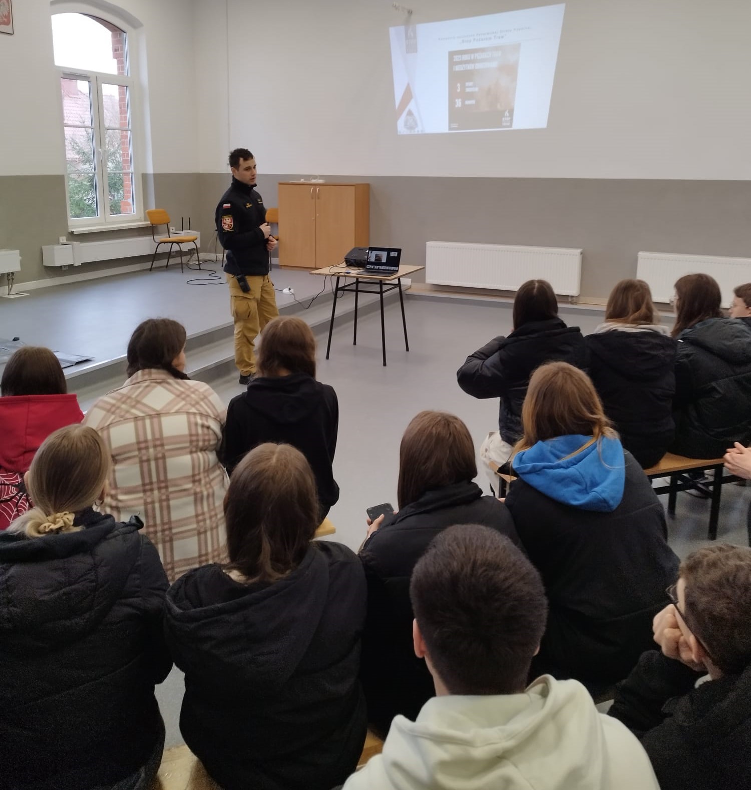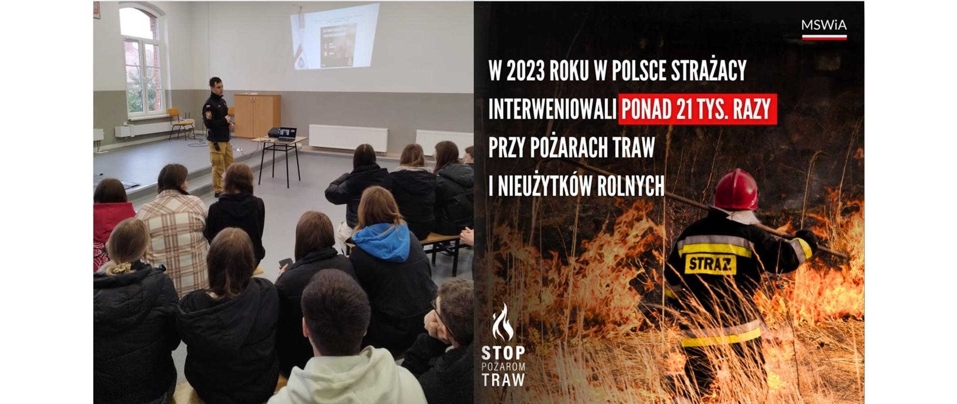 19 marca 2024 roku w Zespole Szkół Zawodowych w Gołdapi odbyła się akcja edukacyjna, podczas której funkcjonariusze Komendy Powiatowej Państwowej Straży Pożarnej w Gołdapi przedstawili słuchaczom szkoły branżowej informacje dotyczące kampanii społecznej PSP „Stop Pożarom Traw”. Strażacy zwrócili uczestnikom spotkania szczególną uwagę na niebezpieczeństwa jakie niesie za sobą wypalanie traw oraz szkodliwość tego zjawiska dla społeczeństwa, zwierząt i środowiska, a także przybliżyli konsekwencje prawne jakie spotykają tych, którzy mimo wszystko ryzykują i nielegalnie wypalają trawy.