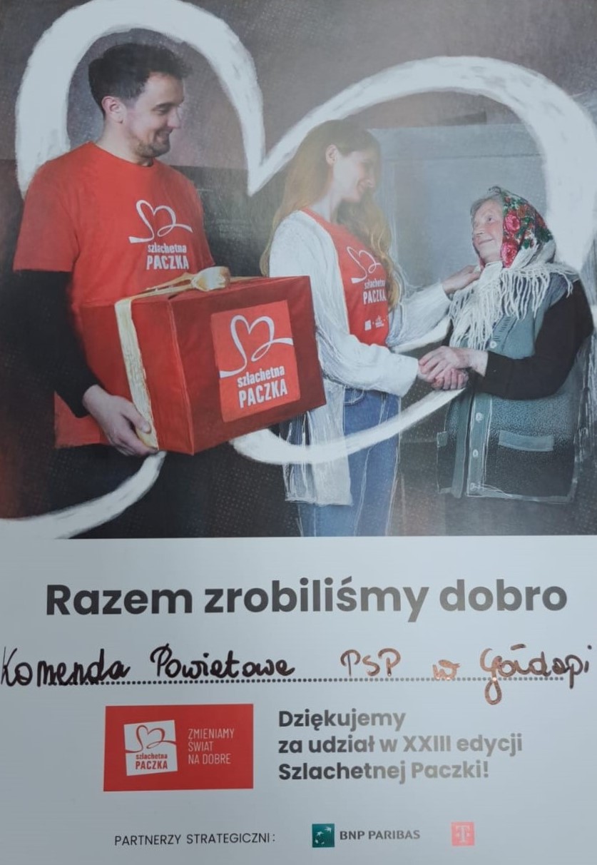Jak co roku, funkcjonariusze i pracownicy cywilni Komendy Powiatowej Państwowej Straży Pożarnej w Gołdapi włączyli się w przygotowanie świątecznej paczki dla najbardziej potrzebujących rodzin w powiecie gołdapskim. W ramach akcji „Szlachetna Paczka” strażacy przygotowali podarunki składające się z przedmiotów pierwszej potrzeby. Wśród tych produktów znalazły się m.in.: kuchenka mikrofalowa, wielofunkcyjny opiekacz elektryczny, artykuły spożywcze, chemia gospodarcza, bony towarowe do sklepu odzieżowego i drogerii oraz drobne prezenty. 16 grudnia 2023 roku funkcjonariusze przekazali upominki do kwatery głównej akcji „Szlachetna Paczka” w powiecie gołdapskim.